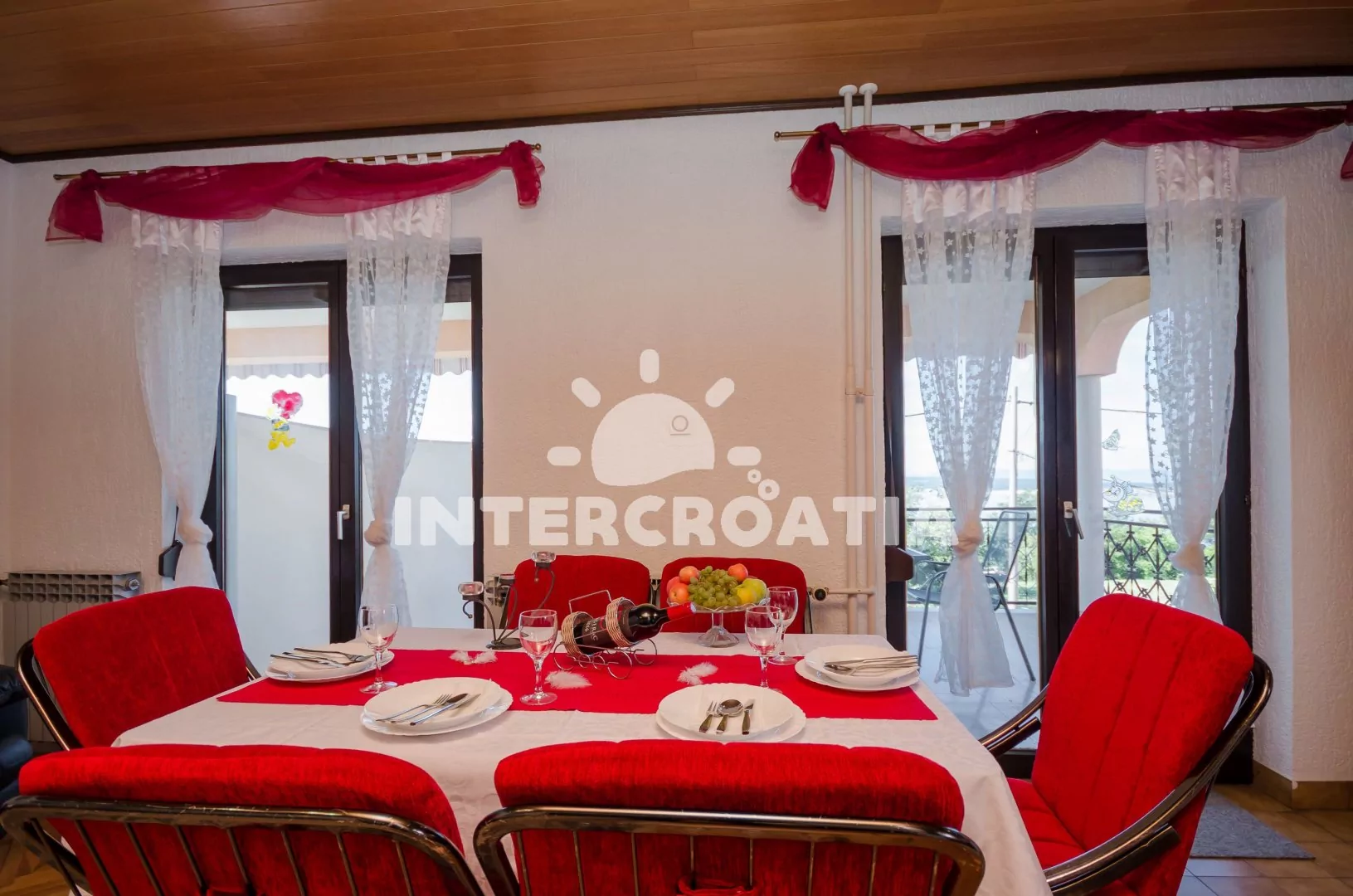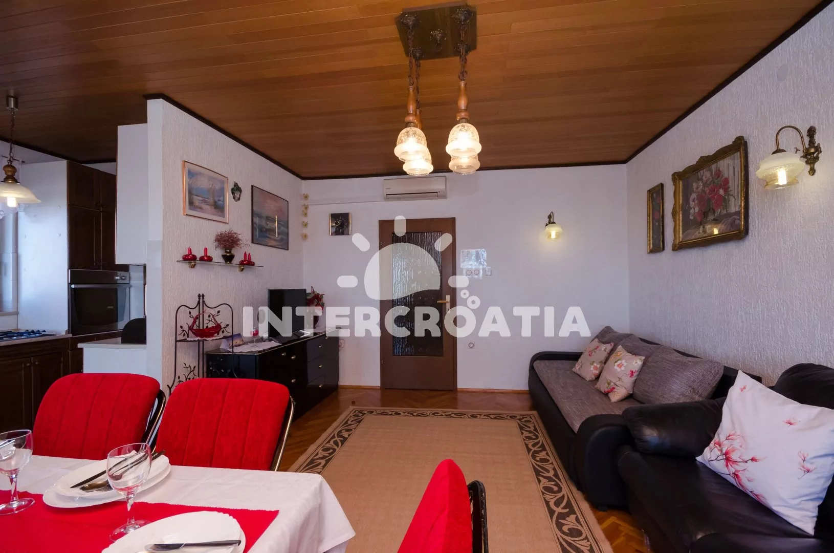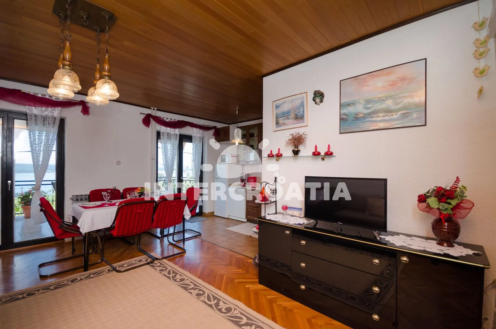 Dvoupokojový apartmán v prvním patře domu s vlastní terasou a výhledem na moře je vhodný pro 2 až 4 osoby. Obývací pokoj je spojený s kuchyní. Kuchyňská linka je vybavena sporákem, troubou, mikrovlnnou troubou, myčkou na nádobí, kávovarem, rychlovarnou konvicí, toustovačem, nádobím a lednicí s mrazákem. Obývací pokoj s jídelním stolem pro 6 osob, sedací soupravou, pohovkou (rozložitelná na extra lůžko pro 2 osoby), televizí se satelitním programem, klimatizací a vstupem na terasu. Ložnice je vybavena jedním dvoulůžkem. Koupelna s vanou, sprchou, umyvadlem, fénem a wc. Hostům je k dispozici parkování u objektu zdarma.