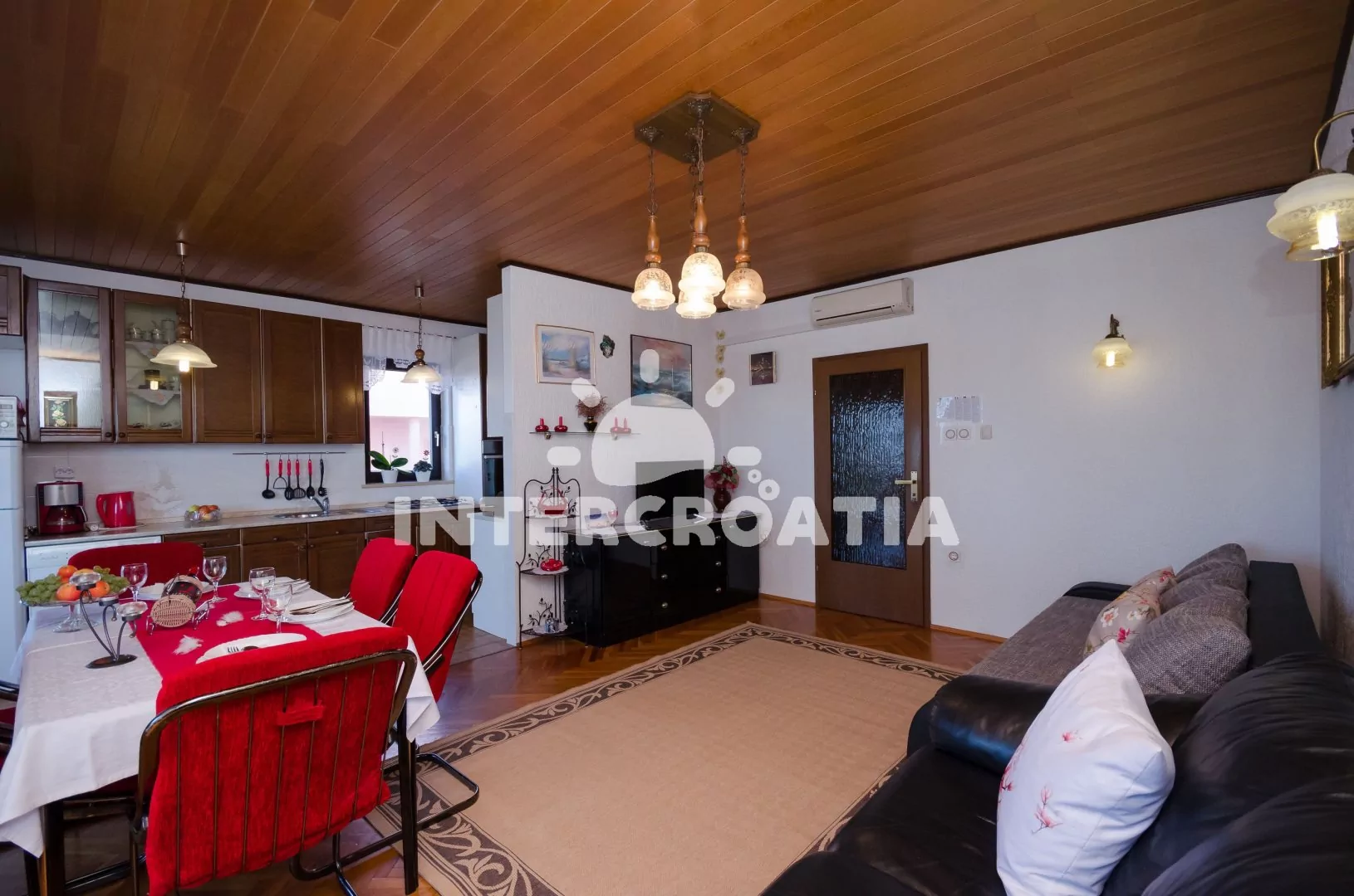 Dvoupokojový apartmán v prvním patře domu s vlastní terasou a výhledem na moře je vhodný pro 2 až 4 osoby. Obývací pokoj je spojený s kuchyní. Kuchyňská linka je vybavena sporákem, troubou,…