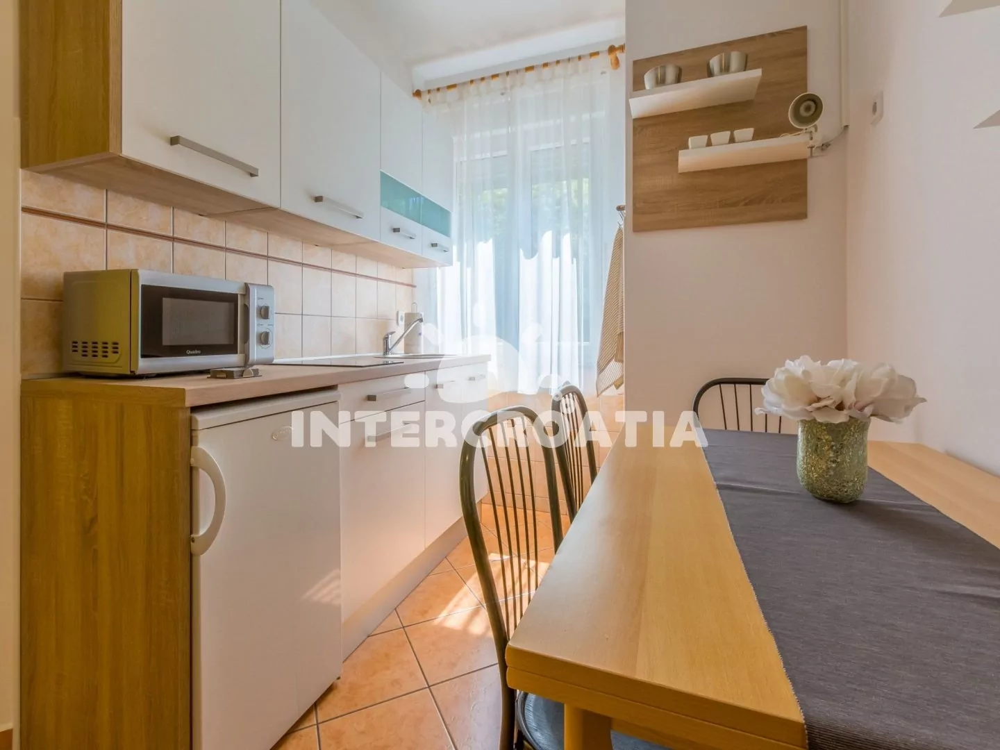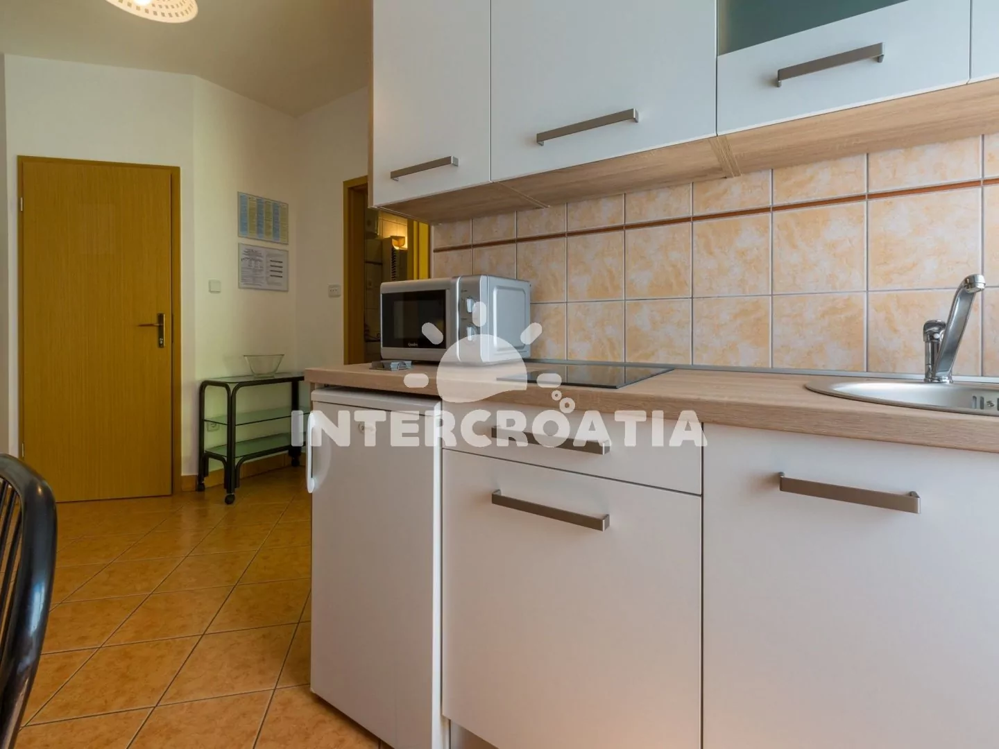 Apartmán (60 m2) v prvním patře domu s balkonem a výhledem na moře je vhodný pro 4 osoby. Vstup: kuchyň s jídelním stolem pro 4 osoby, kuchyňskou linkou s dvouplotýnkovým sporákem, mikrovlnnou…