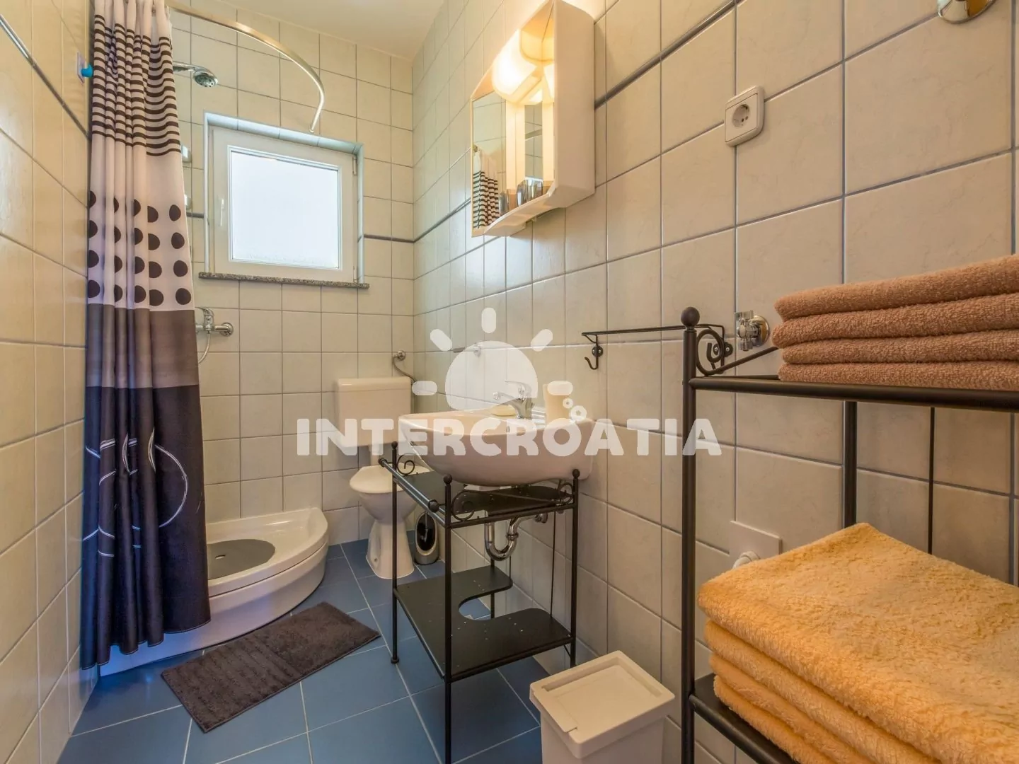 Apartmán (45 m2) v druhém patře domu s terasou a výhledem na moře je vhodný pro 2 - 4 osoby. Obývací pokoj je spojený s kuchyní. Kuchyňská linka je vybavena dvouplotýnkovým sporákem, mikrovlnnou troubou, rychlovarnou konvicí, kávovarem, nádobím a lednicí s mrazákem. Obývací pokoj s jídelním stolem, pohovkou (rozložitelná na extra lůžko pro 2 osoby), televizí se satelitním programem, klimatizací a vstupem na terasu. Ložnice s jedním dvoulůžkem. Koupelna se sprchovým koutem, umyvadlem, wc a fénem. Hostům je k dispozici parkování u objektu zdarma.