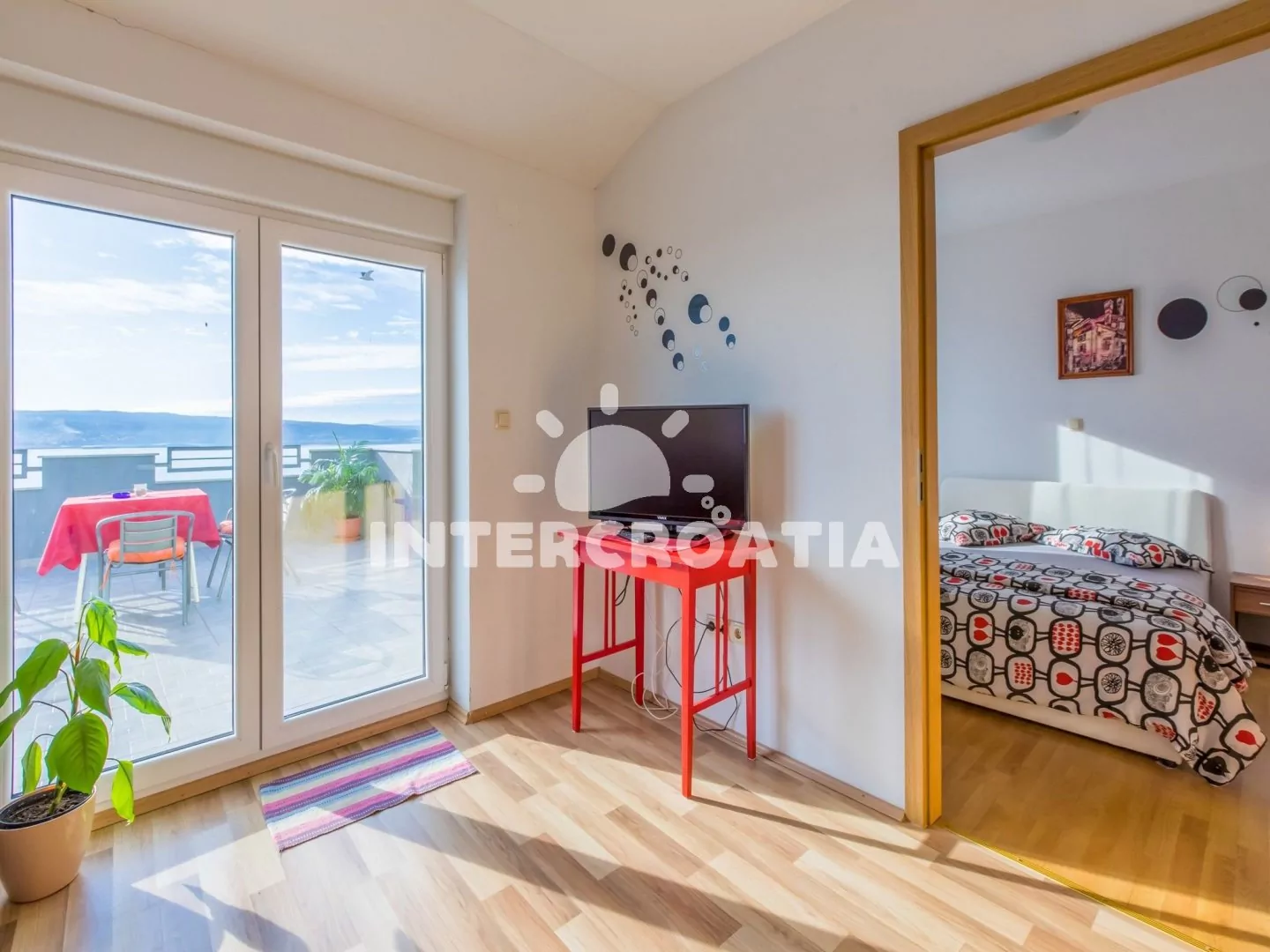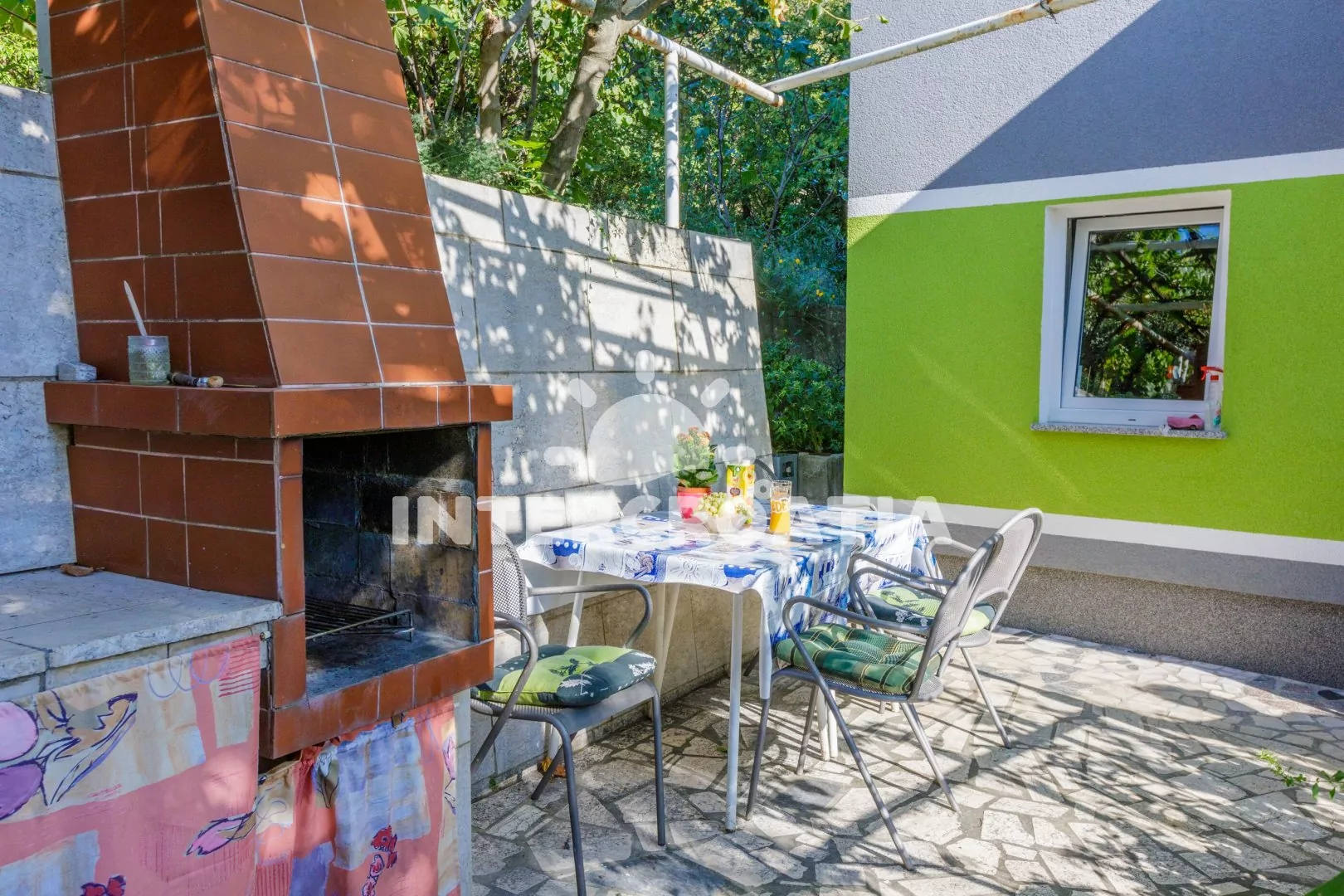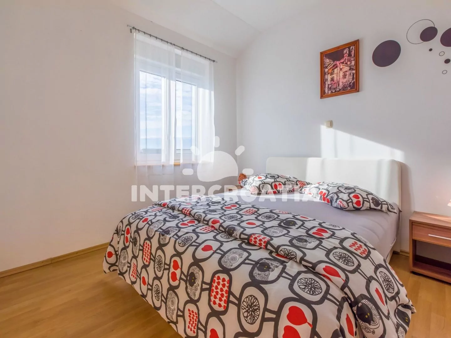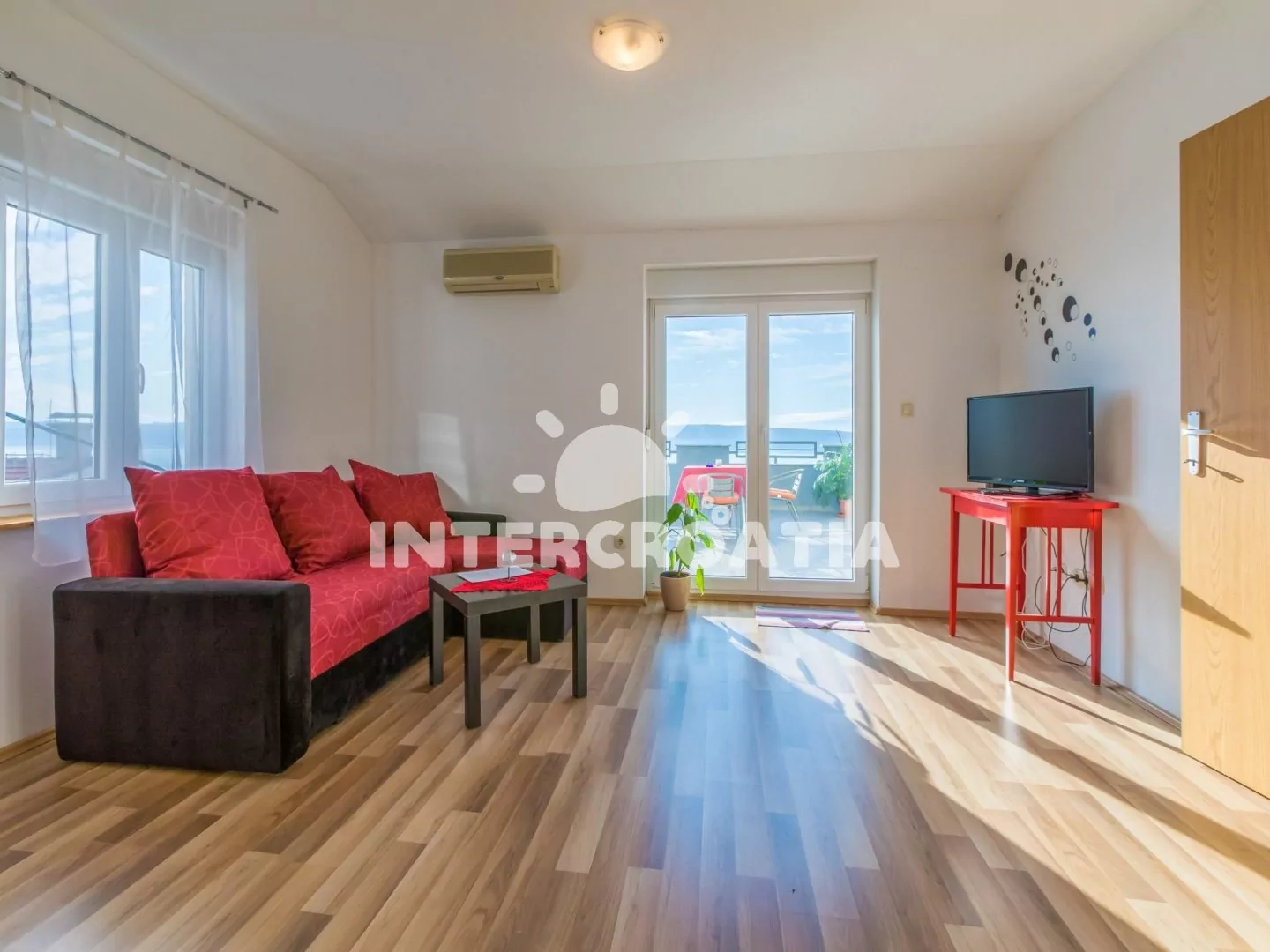 Světlý a komfortně zařízený apartmán s terasou a výhledem na moře se nachází v druhém patře domu a je vhodný pro 2 - 4 osoby. Obývací pokoj je spojený s kuchyní. Kuchyňská linka je vybavena dvouplotýnkovým vařičem, rychlovarnou konvicí, kávovarem, toustovačem, nádobím a lednicí s mrazákem. Obývací pokoj s jídelním stolem pro 4 osoby, rohovou pohovkou (rozložitelná na extra lůžko pro 2 osoby), televizí se satelitním programem, klimatizací a vstupem na terasu. Ložnice s jedním dvoulůžkem. Koupelna se sprchovým koutem, umyvadlem, fénem a wc. K domu vede pár schodů, parkovací místa jsou k dispozici 50 - 150 m od domu.