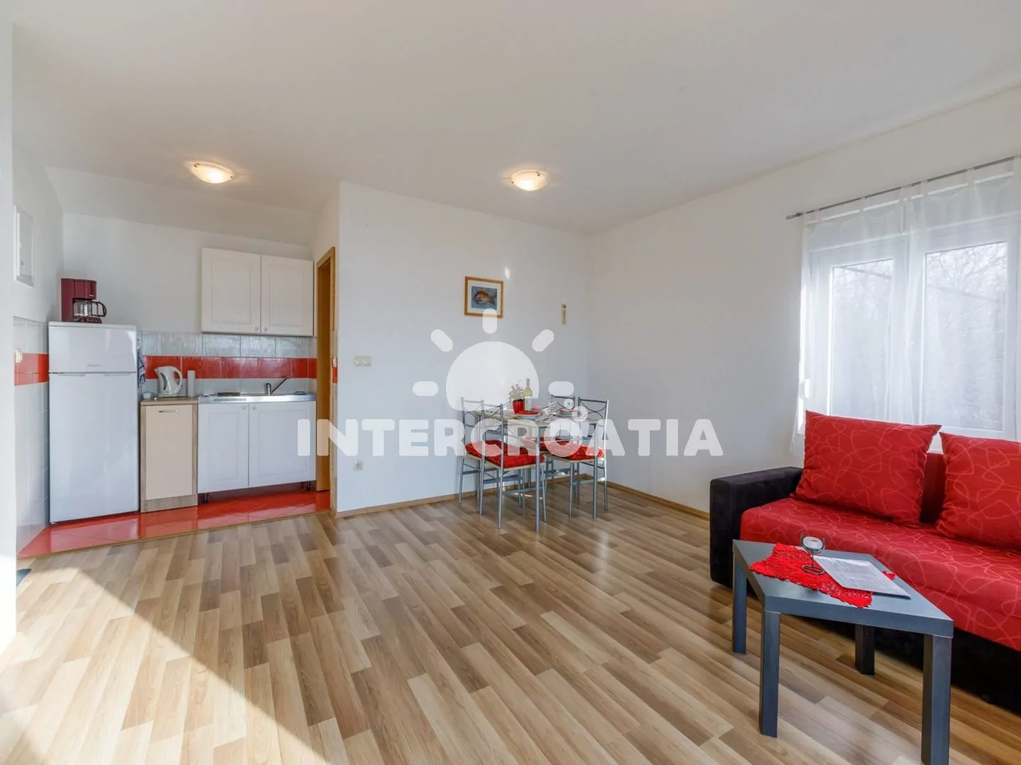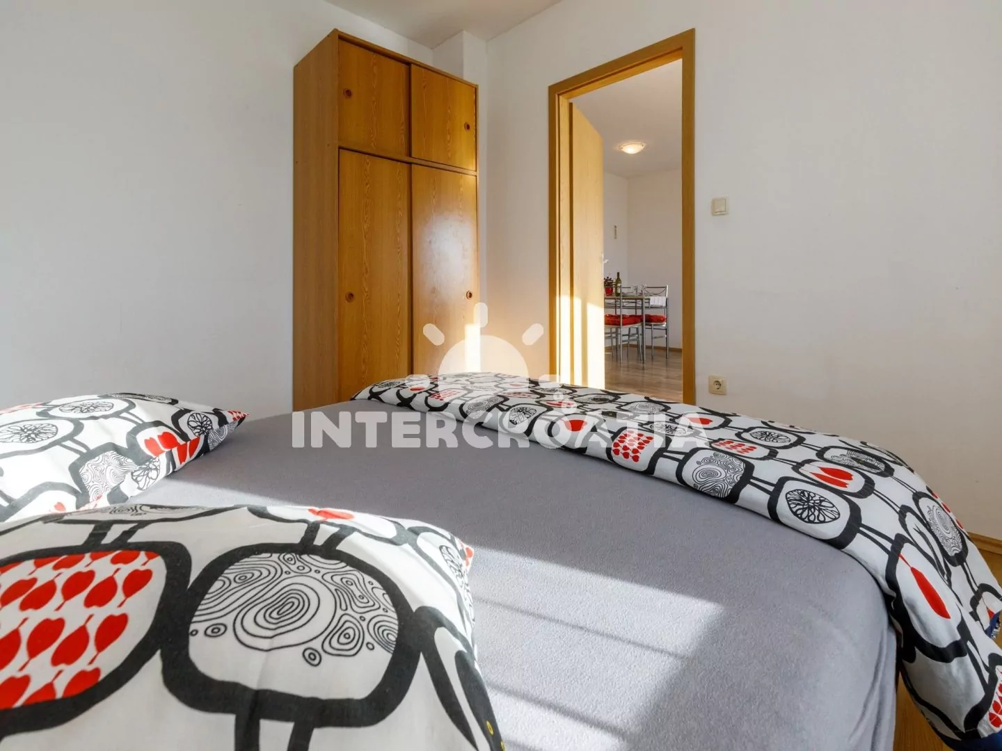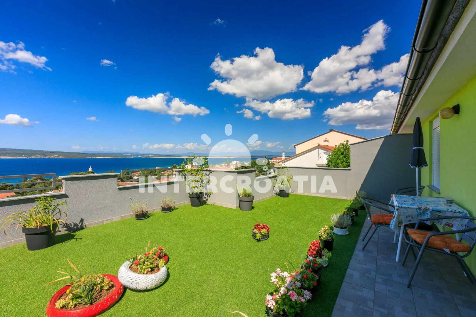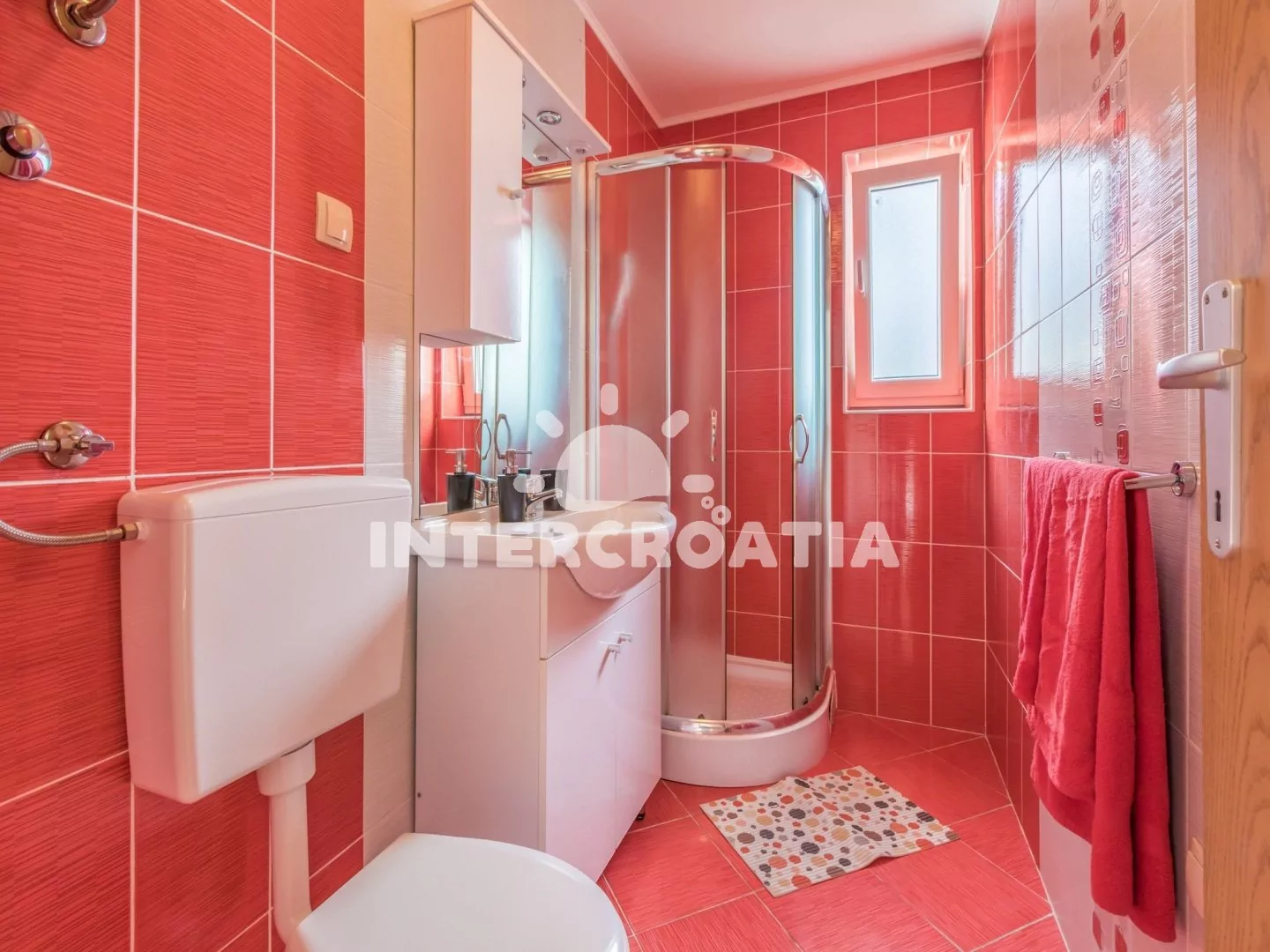 Světlý a komfortně zařízený apartmán s terasou a výhledem na moře se nachází v druhém patře domu a je vhodný pro 2 - 4 osoby. Obývací pokoj je spojený s kuchyní. Kuchyňská linka je vybavena dvouplotýnkovým vařičem, rychlovarnou konvicí, kávovarem, toustovačem, nádobím a lednicí s mrazákem. Obývací pokoj s jídelním stolem pro 4 osoby, rohovou pohovkou (rozložitelná na extra lůžko pro 2 osoby), televizí se satelitním programem, klimatizací a vstupem na terasu. Ložnice s jedním dvoulůžkem. Koupelna se sprchovým koutem, umyvadlem, fénem a wc. K domu vede pár schodů, parkovací místa jsou k dispozici 50 - 150 m od domu.