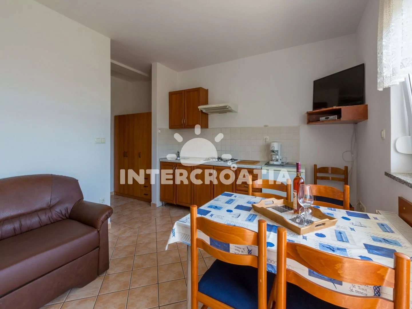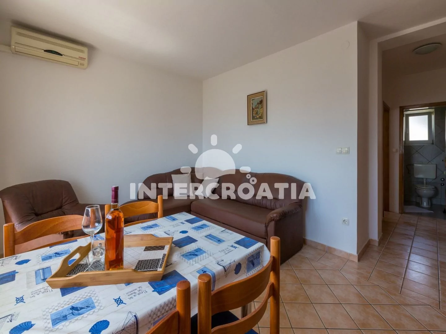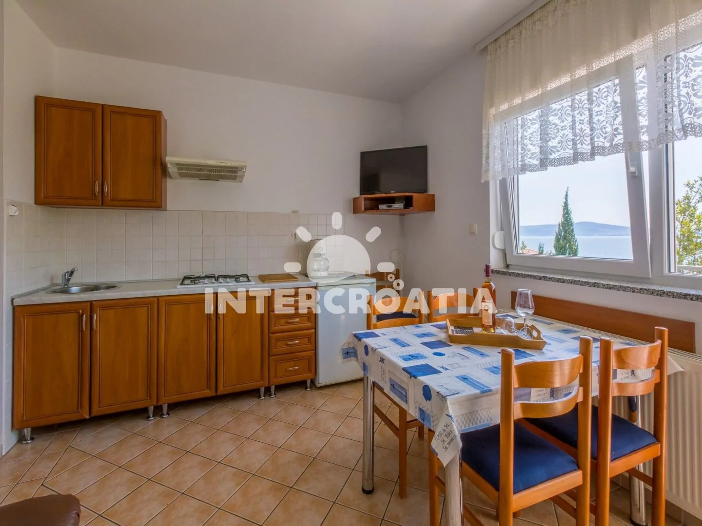 Apartmán s balkonem a výhledem na moře se nachází v druhém patře domu a je vhodný pro 2 až 4 osoby. Obývací pokoj je spojený s kuchyní. Kuchyňská linka je vybavena varnou deskou, digestoří, kávovarem…