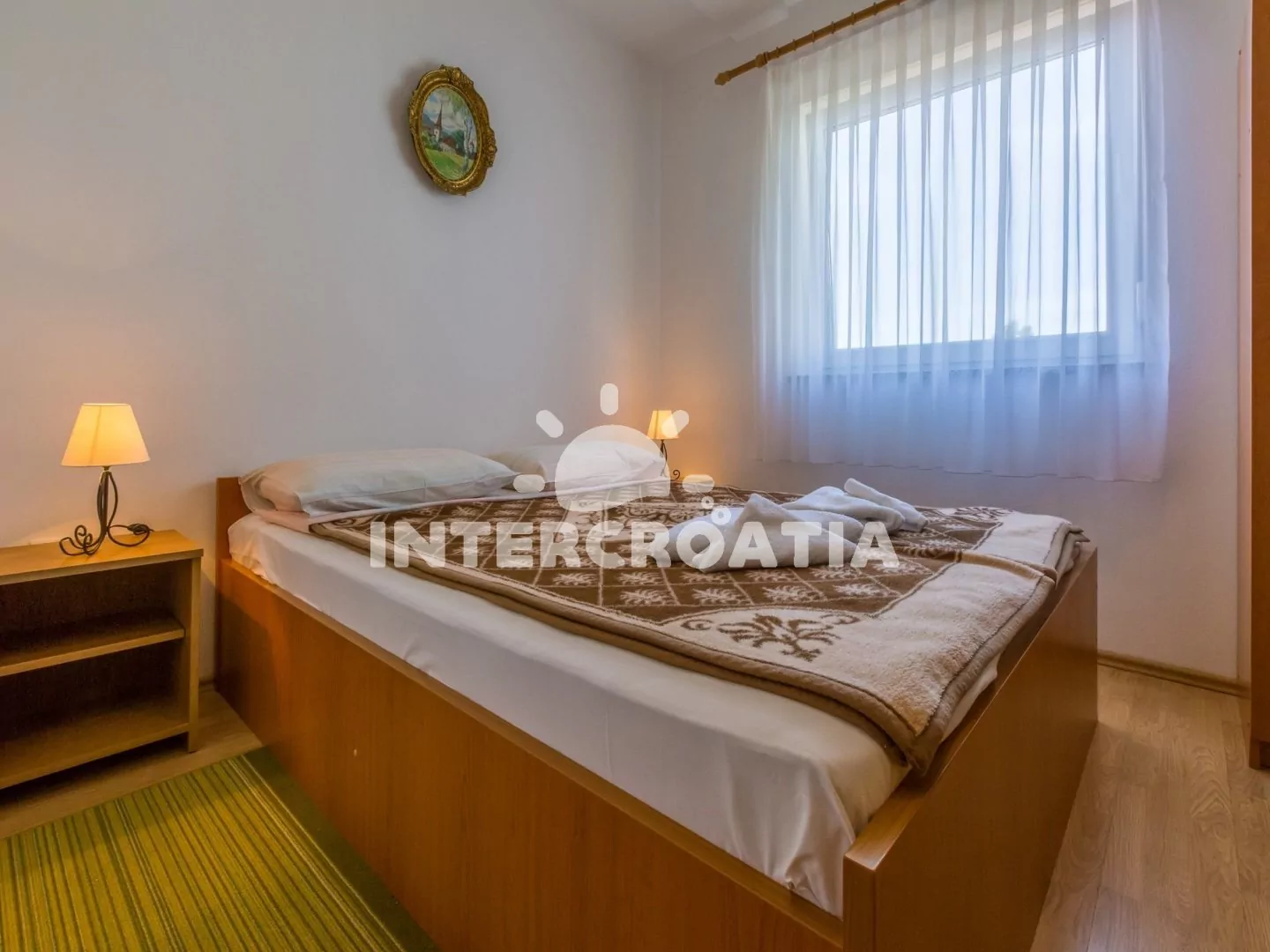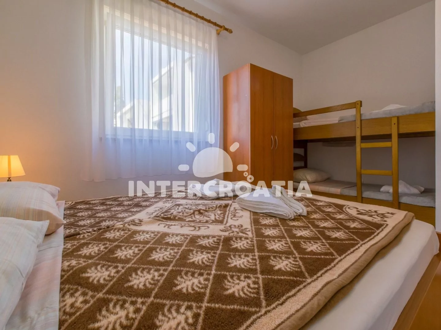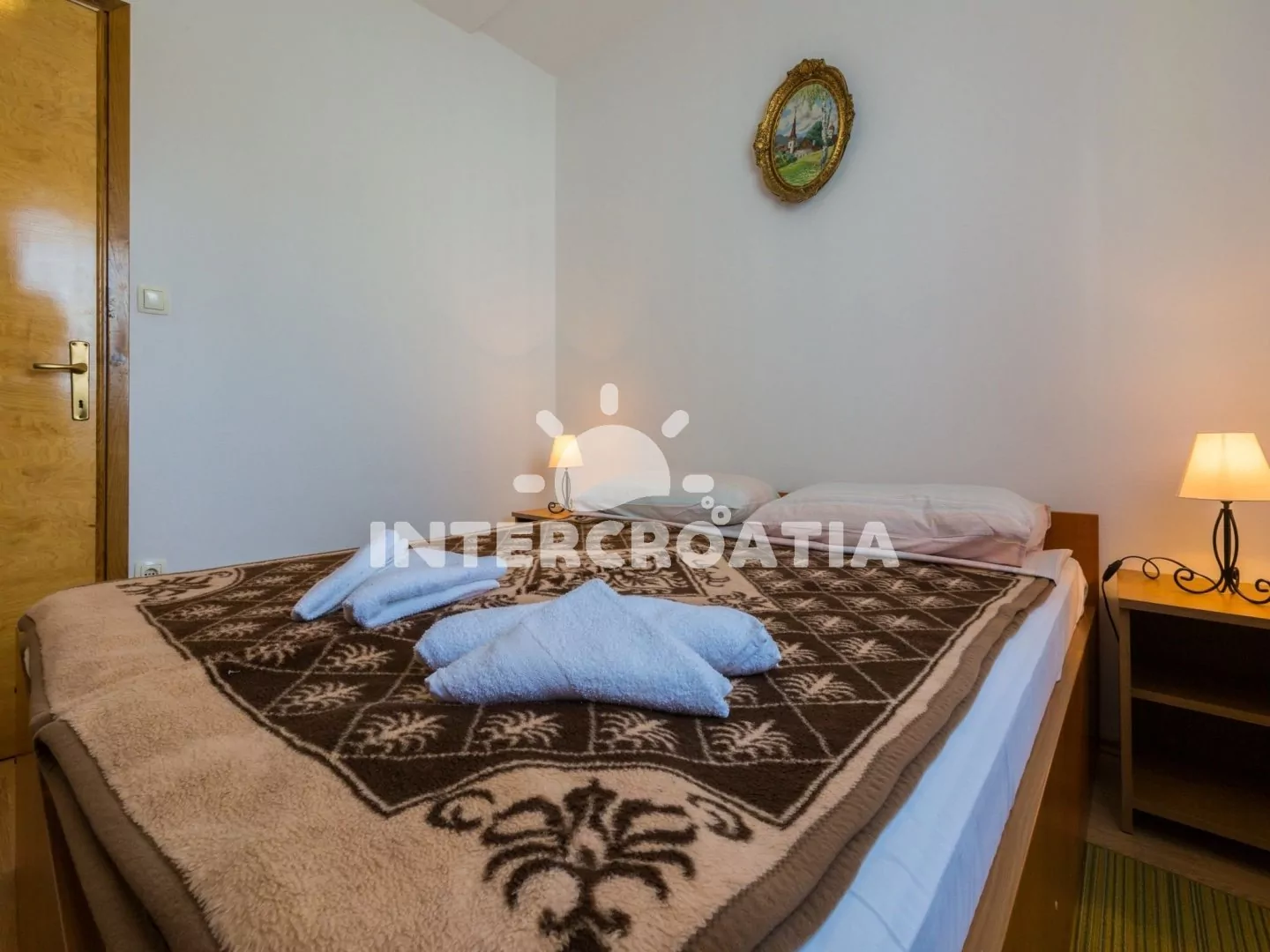 Apartmán s balkonem a výhledem na moře se nachází v druhém patře domu a je vhodný pro 2 až 4 osoby. Obývací pokoj je spojený s kuchyní. Kuchyňská linka je vybavena varnou deskou, digestoří, kávovarem, nádobím a lednicí s mrazákem. Obývací pokoj s jídelním stolem pro 4 osoby, sedací soupravou, pohovkou (rozložitelná na extra lůžko pro 2 osoby), televizí se satelitním programem, klimatizací a vstupem na balkon. Ložnice s dvoulůžkem. Koupelna se sprchovým koutem, umyvadlem a wc. Hostům je k dispozici parkování u objektu zdarma.