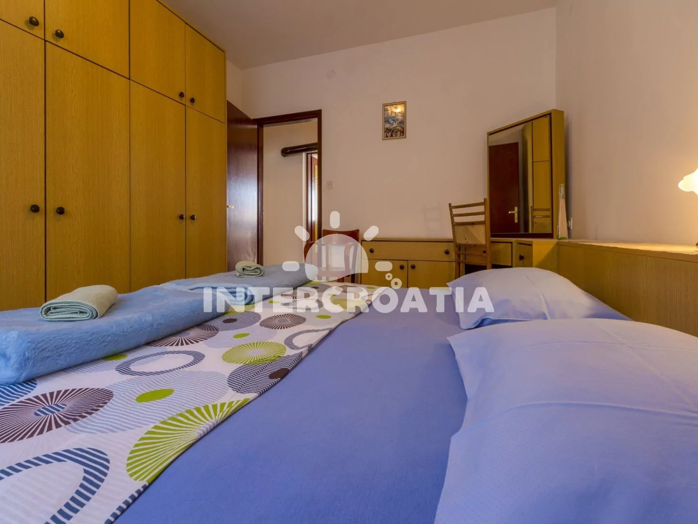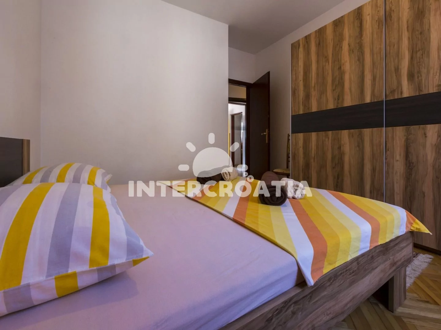 Apartmán (84 m2) s vlastní terasou a výhledem na moře je vhodný pro 4 osoby. Vstup: kuchyň s jídelním stolem pro 4 osoby, kuchyňskou linkou s varnou deskou, mikrovlnnou troubou, kávovarem, rychlovarnou konvicí, nádobím a lednicí. Obývací pokoj se sedací soupravou, televizí se satelitním programem a klimatizací. První i druhá ložnice je vybavena vždy s jedním dvoulůžkem. Koupelna s vanou, sprchovou zástěnou, umyvadlem, bidetem a wc. Hostům je k dispozici parkování u objektu zdarma.