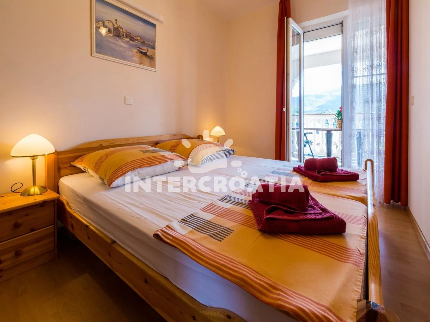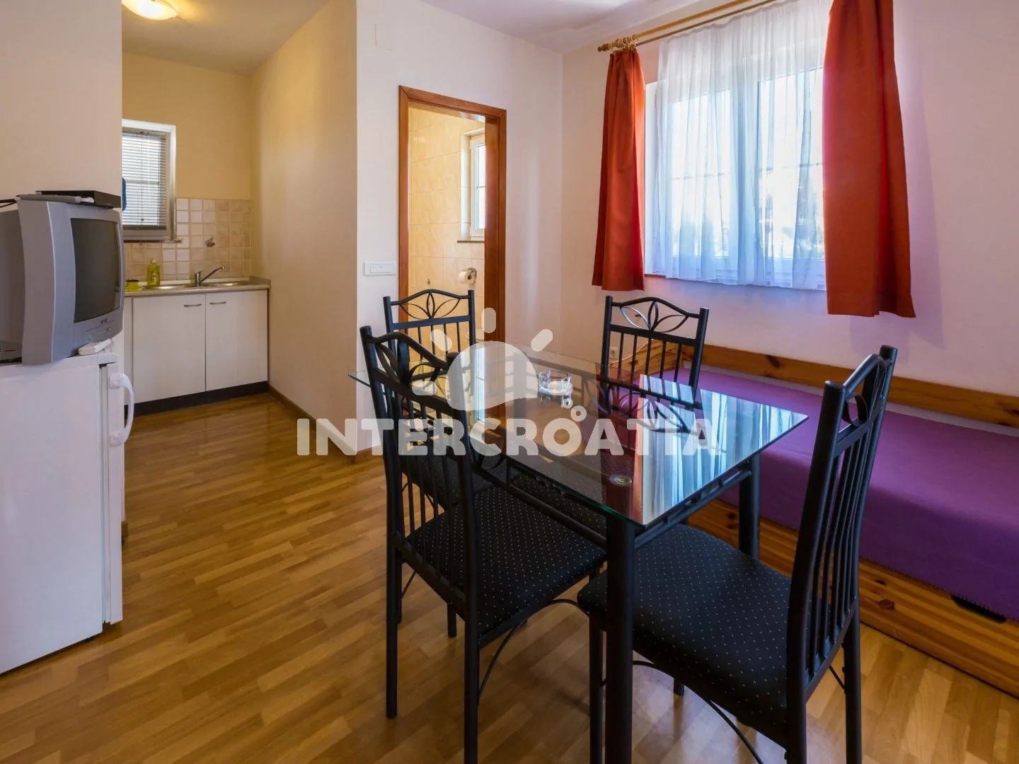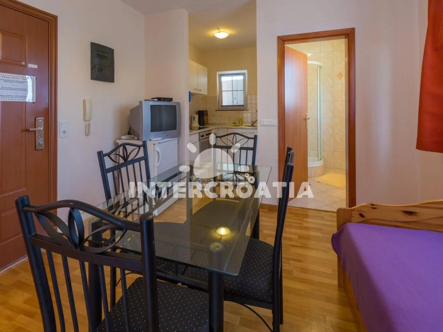 Apartmán s terasou se nachází v prvním patře vily a je vhodný pro 2 až 3 osoby. Obývací pokoj je spojený s kuchyní. Kuchyňská linka je vybavena sklokeramickou varnou deskou, vestavěnou troubou, kávovarem, nádobím a lednicí s mrazákem. Obývací pokoj s jídelním stolem pro 4 osoby, jednolůžkem, televizí se satelitním programem, klimatizací a vstupem na terasu. Ložnice s jedním dvoulůžkem a vstupem na terasu. Koupelna se sprchovým koutem, umyvadlem a wc. Hostům je k dispozici parkování u objektu zdarma.