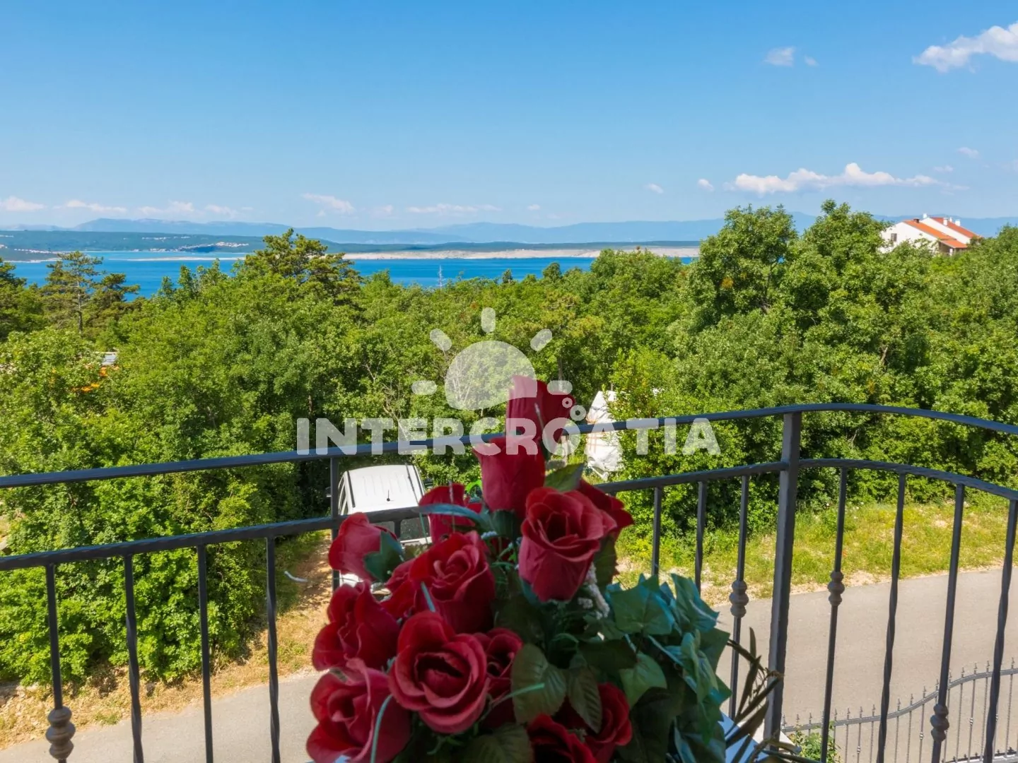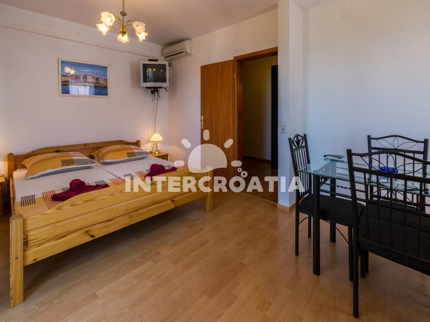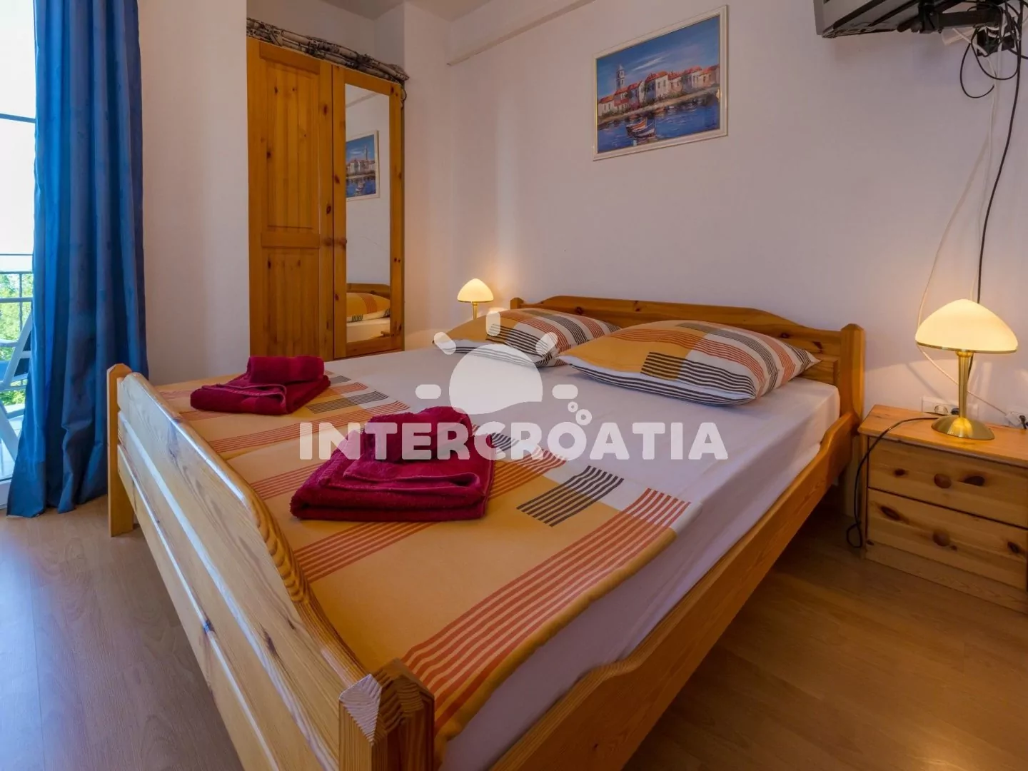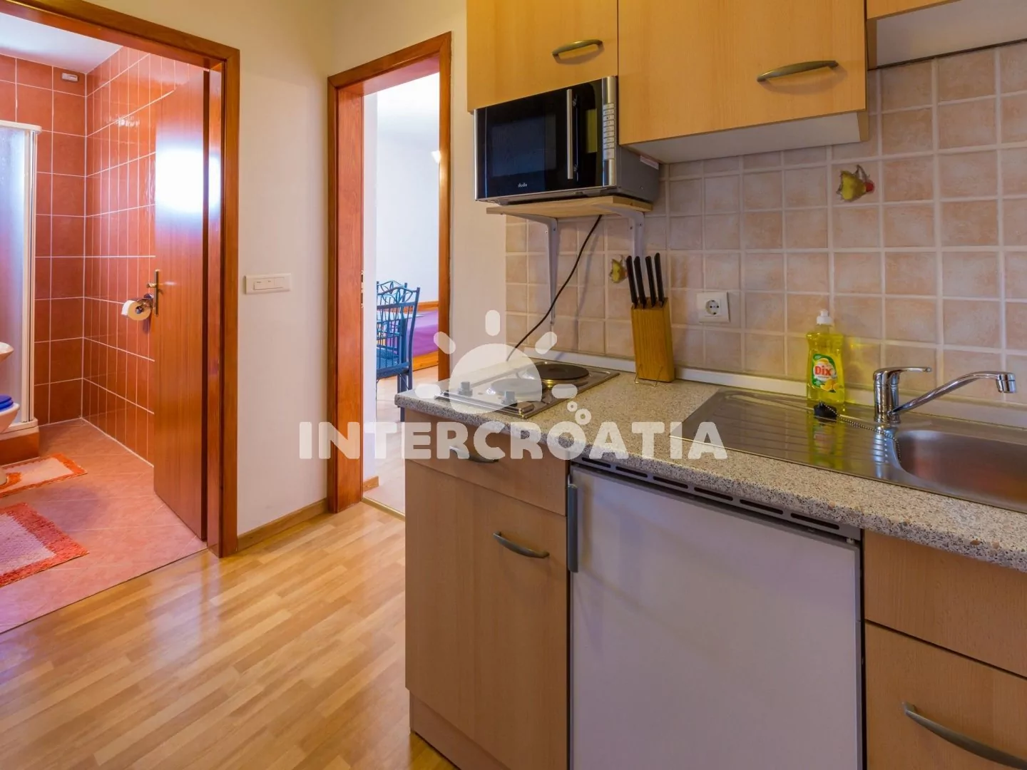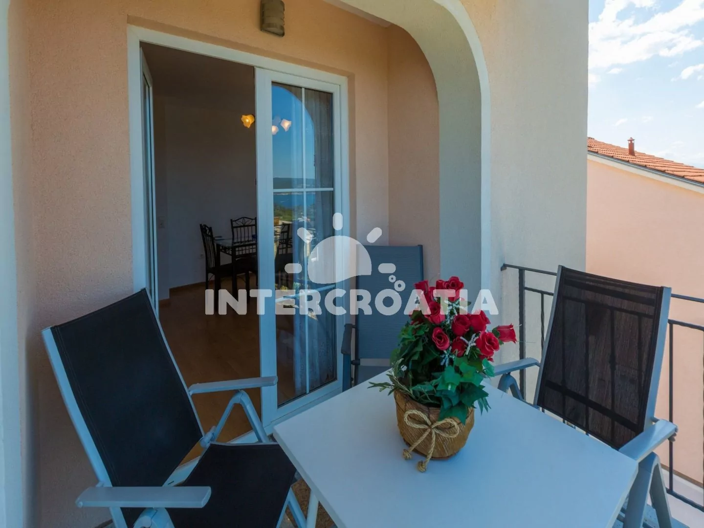 Apartmán s balkonem a výhledem na moře se nachází v 2. patře vily a je vhodný pro 2 až 3 osoby. Kuchyňská linka je vybavena dvouplotýnkovým vařičem, mikrovlnnou troubou, kávovarem, nádobím a lednicí s mrazákem. Obývací místnost s jídelním stolem pro 4 osoby, pohovkou (rozložitelná na extra lůžko pro 1 osobu), televizí se satelitním programem, dvoulůžkem, klimatizací a vstupem na balkon. Koupelna se sprchovým koutem, umyvadlem a wc. Hostům je k dispozici parkování u objektu zdarma.