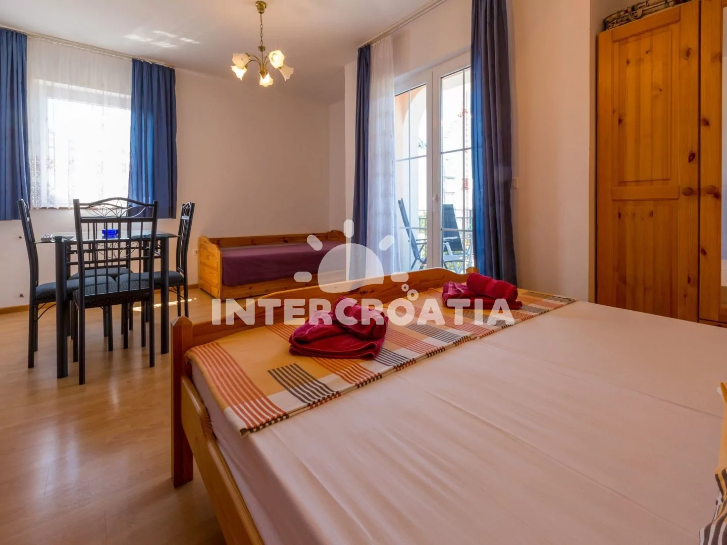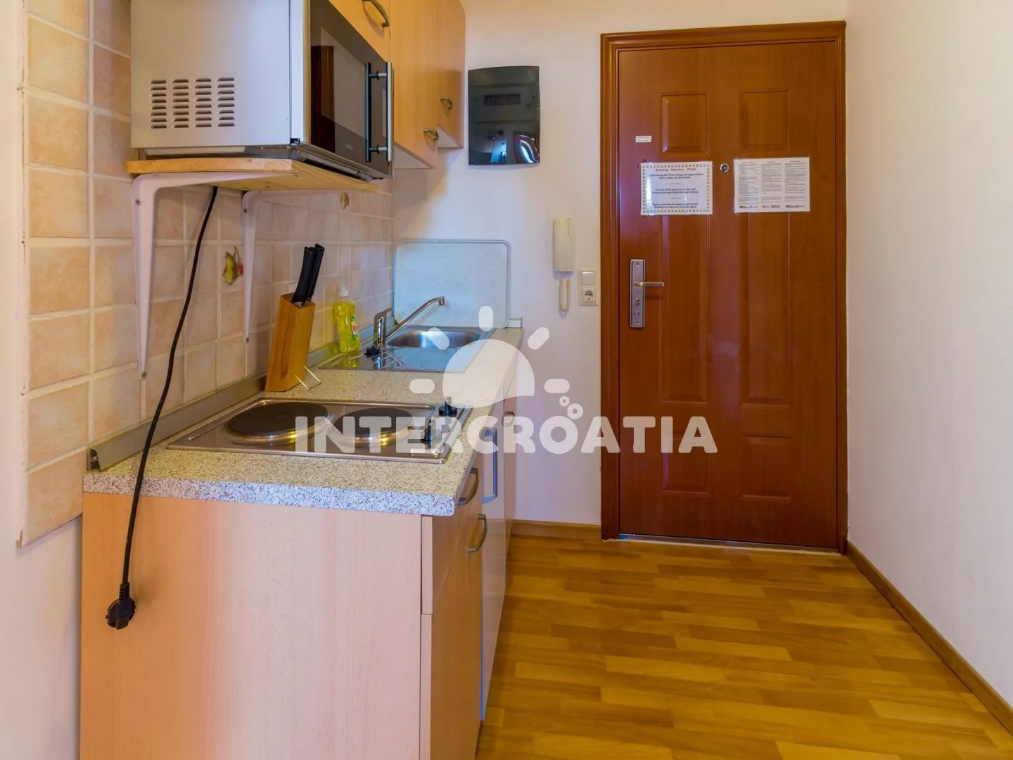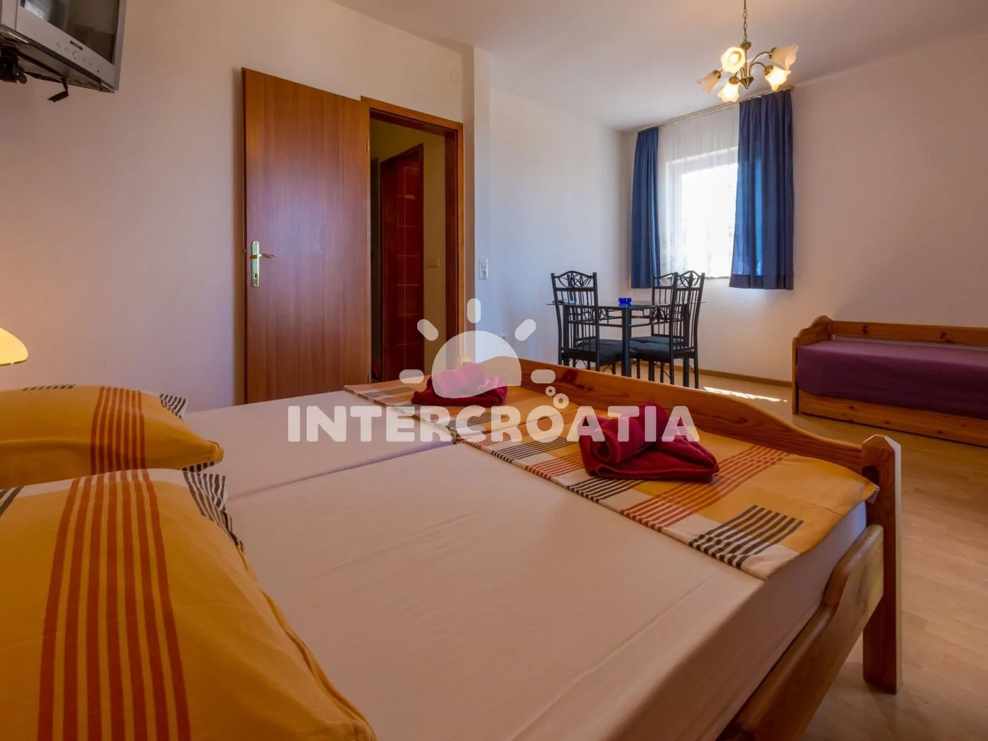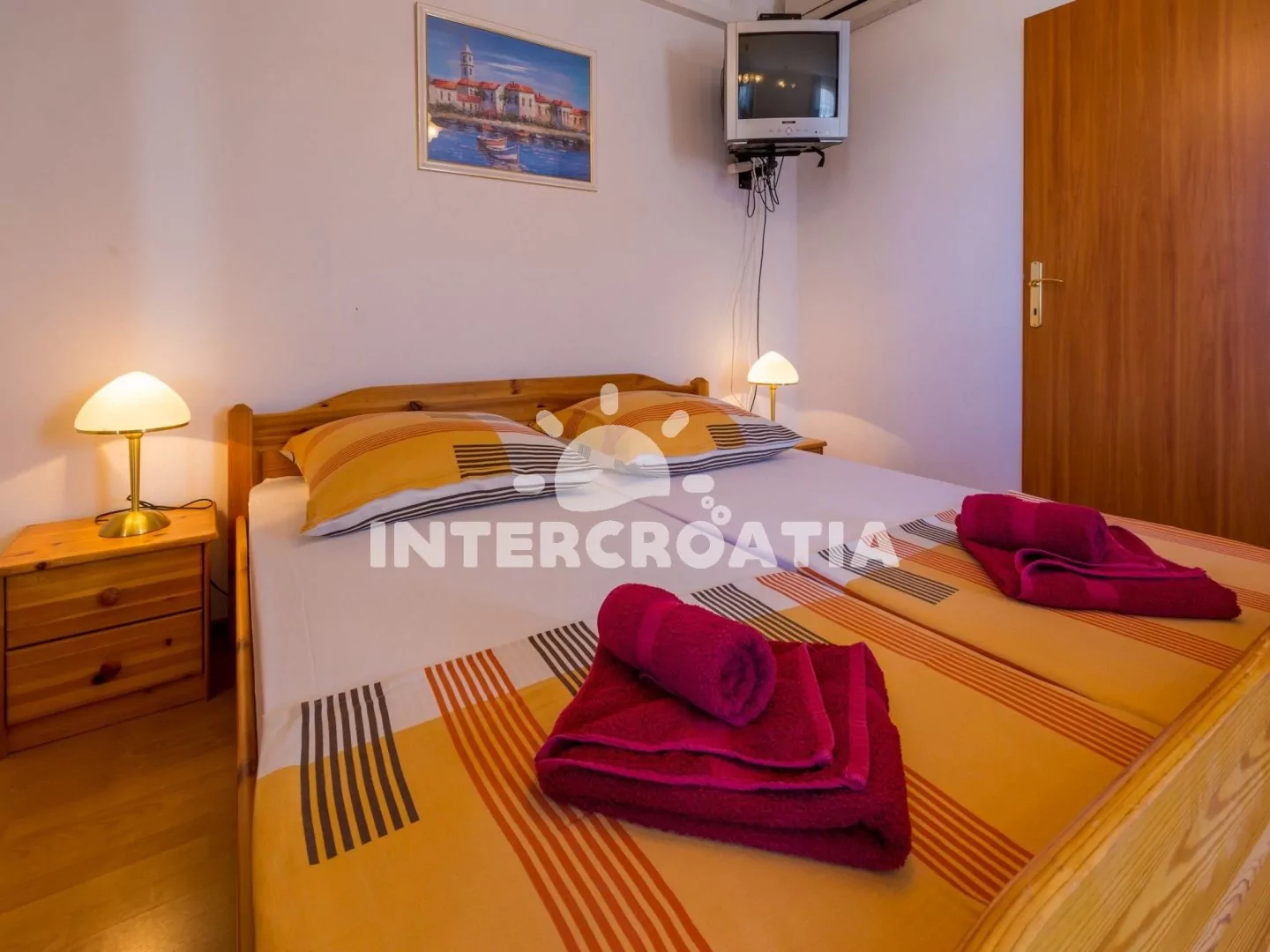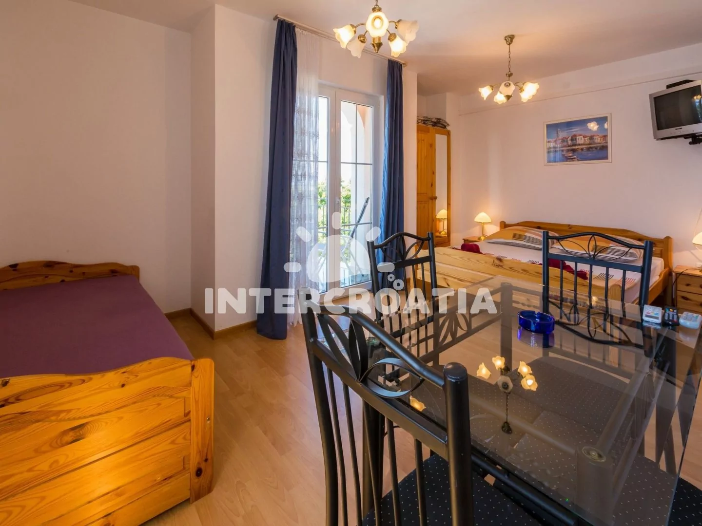 Apartmán s balkonem a výhledem na moře se nachází v 2. patře vily a je vhodný pro 2 až 3 osoby. Kuchyňská linka je vybavena dvouplotýnkovým vařičem, mikrovlnnou troubou, kávovarem, nádobím a lednicí s mrazákem. Obývací místnost s jídelním stolem pro 4 osoby, pohovkou (rozložitelná na extra lůžko pro 1 osobu), televizí se satelitním programem, dvoulůžkem, klimatizací a vstupem na balkon. Koupelna se sprchovým koutem, umyvadlem a wc. Hostům je k dispozici parkování u objektu zdarma.