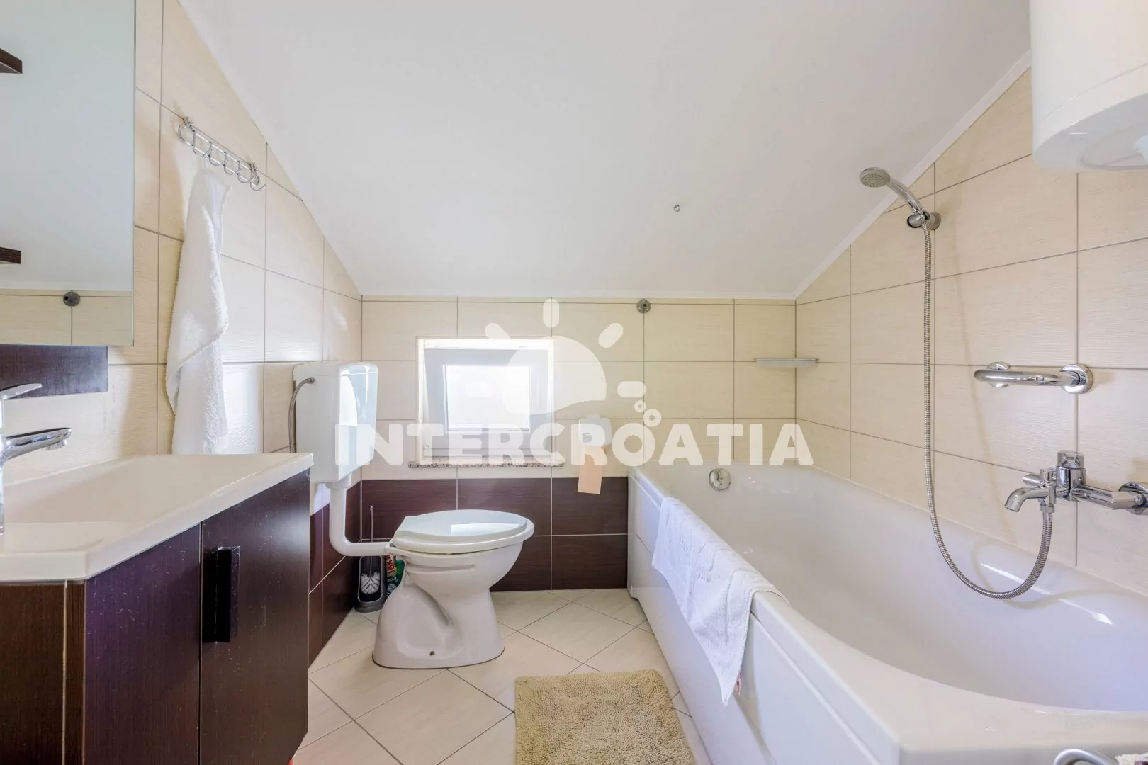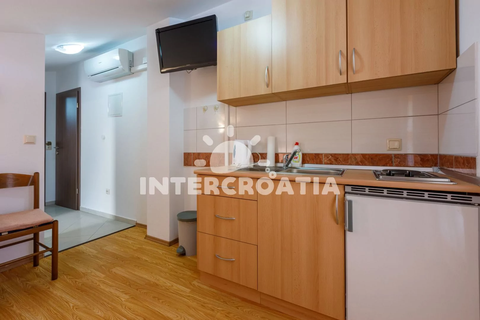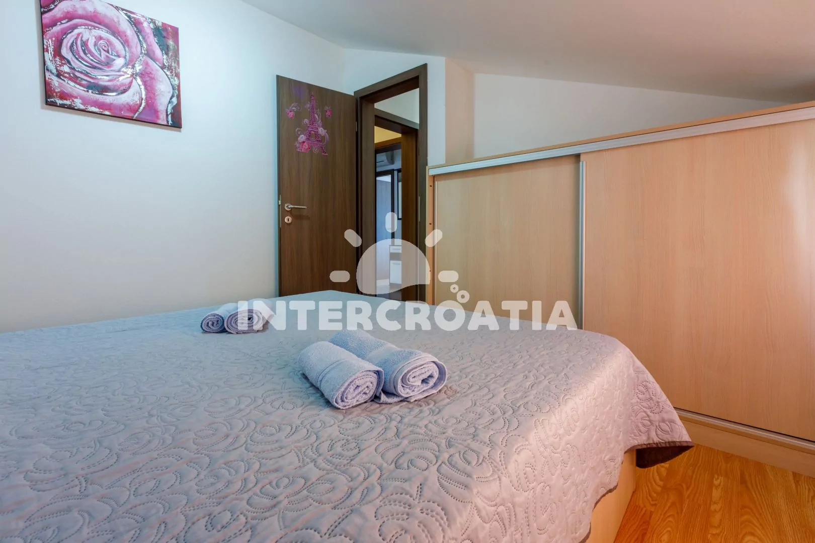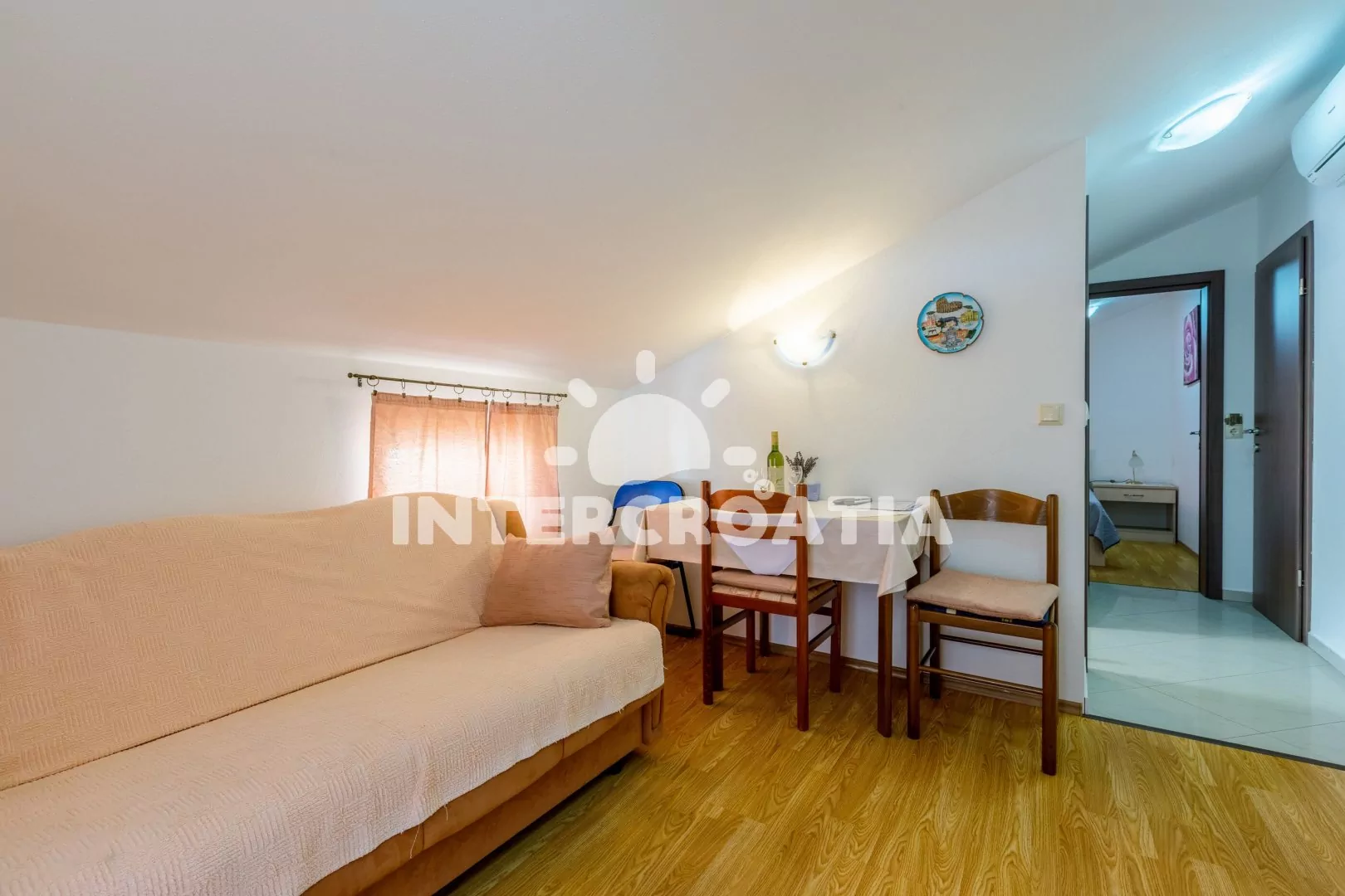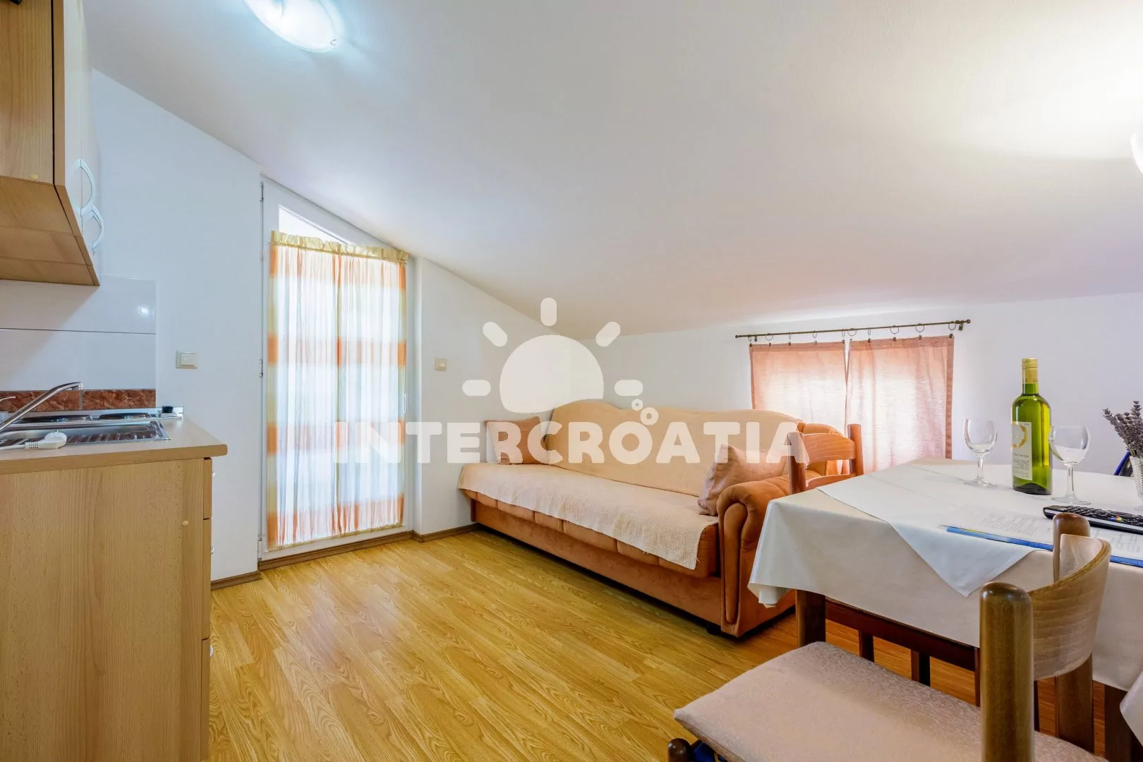 Podkrovní apartmán s balkonem a výhledem na moře je vhodný pro 2 až 3 osoby. Obývací pokoj je spojený s kuchyní. Kuchyňská linka je vybavena dvouplotýnkovým vařičem, rychlovarnou konvicí, nádobím a lednicí s mrazákem. Obývací pokoj s jídelním stolem pro 3 osoby, pohovkou (rozložitelná na extra lůžko pro 1 osobu), televizí se satelitním programem, klimatizací a vstupem na balkon. Ložnice s jedním dvoulůžkem. Koupelna s vanou, umyvadlem a wc. Hostům je k dispozici parkování u objektu zdarma.