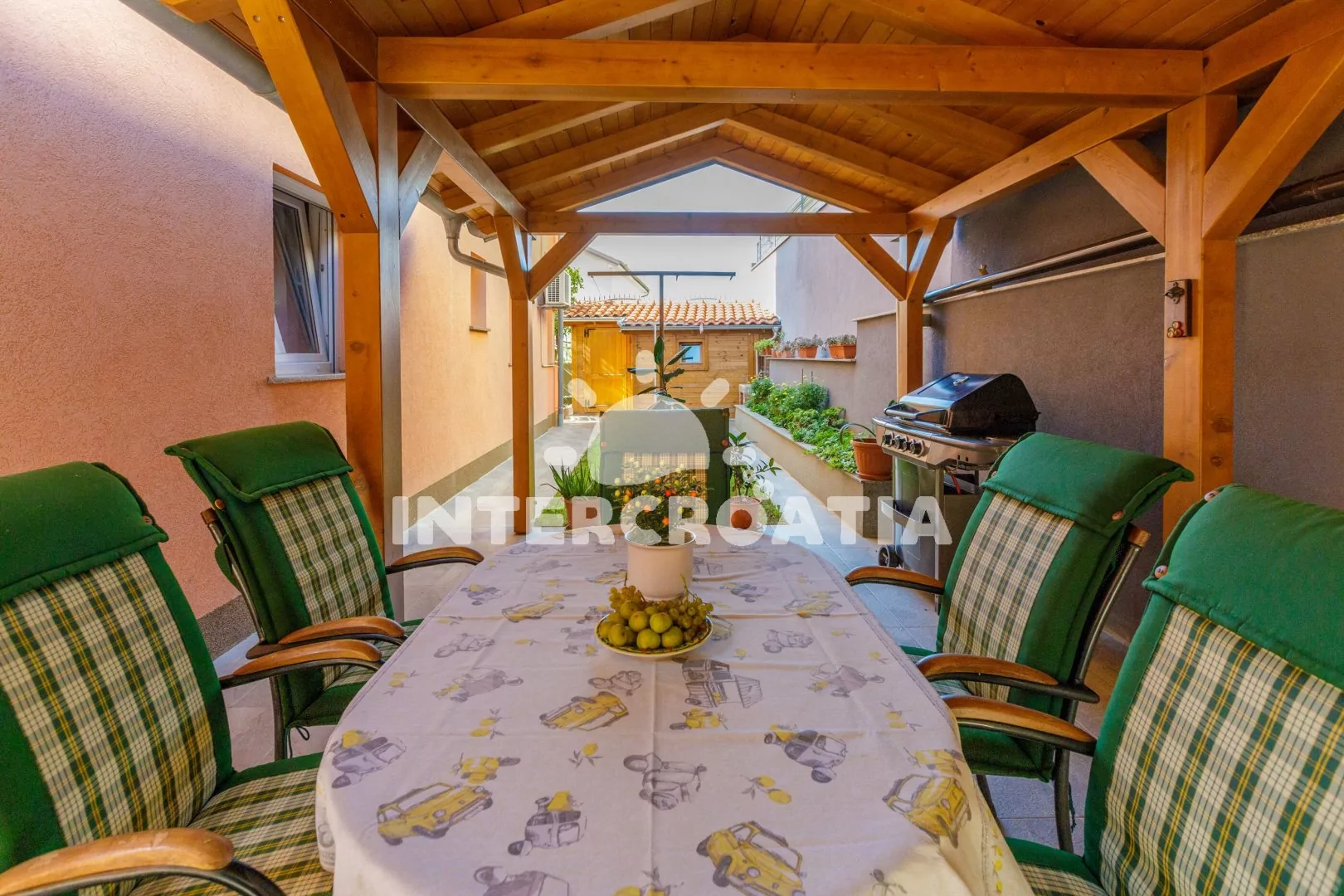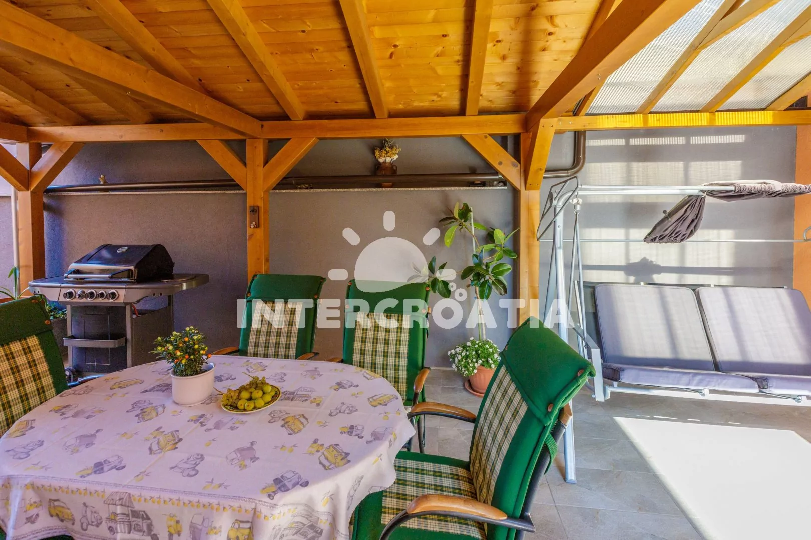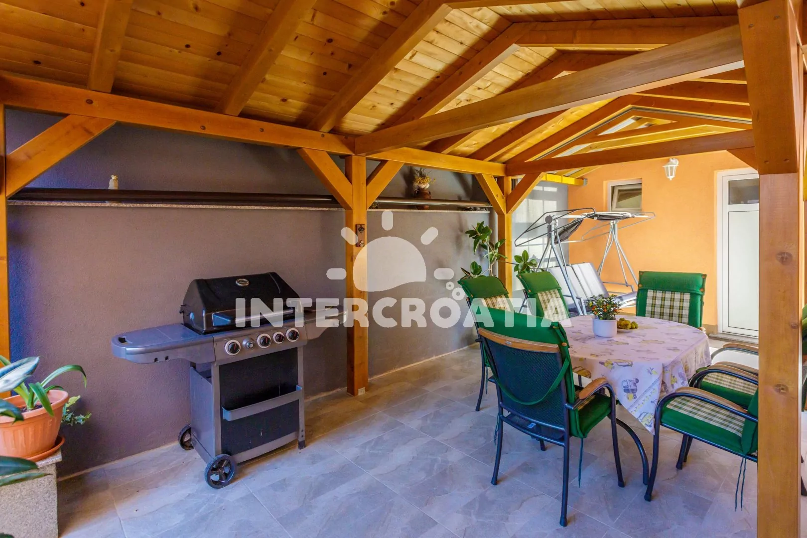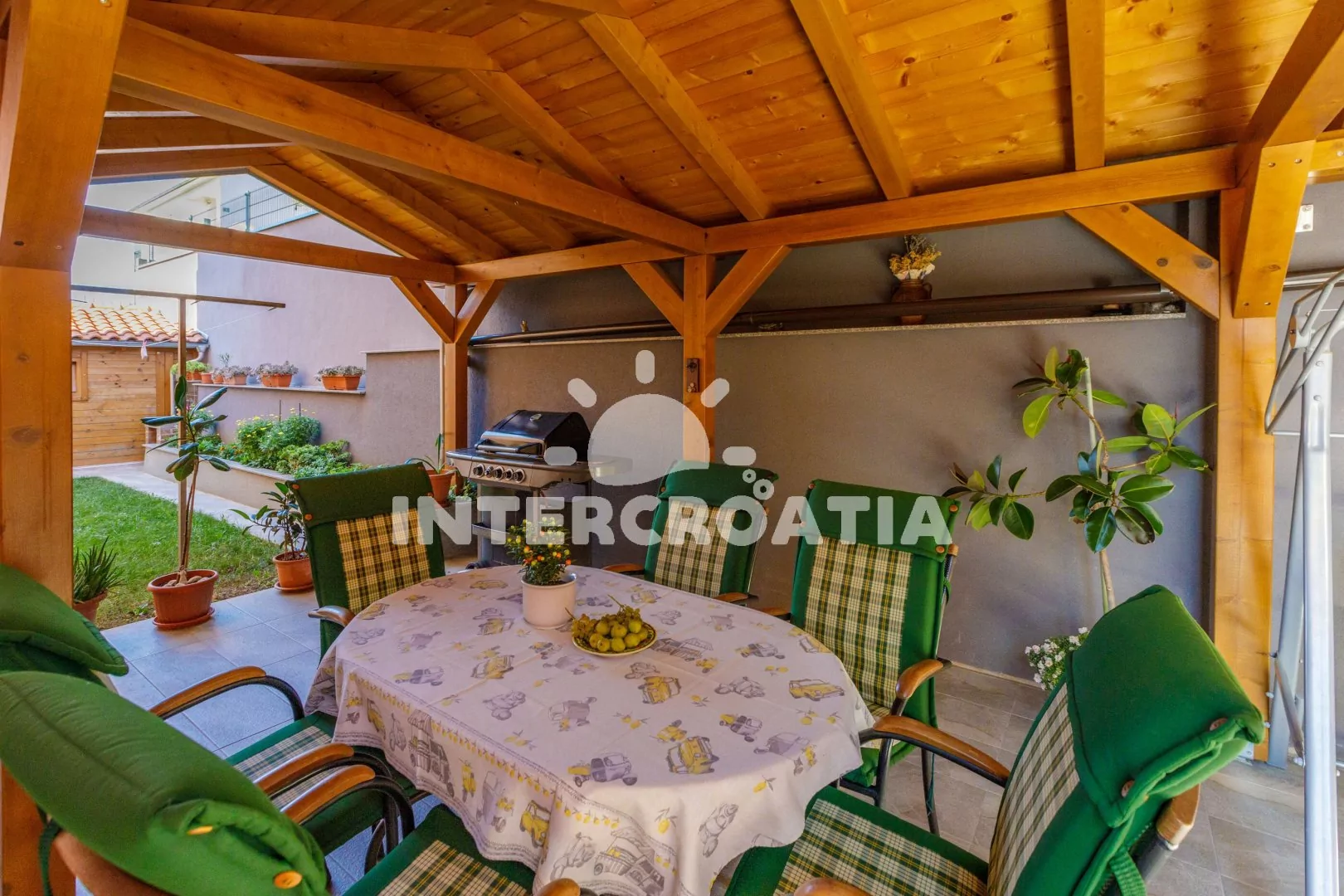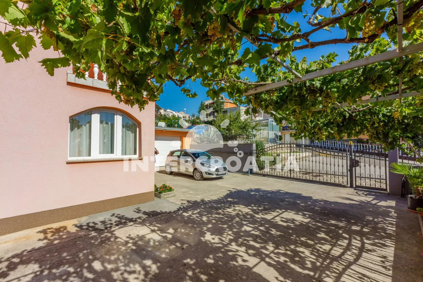 Patrová vilka s výhledem na moře a vlastním oploceným pozemkem, společnou terasou, pergolou, venkovním posezením a grilem. Apartmány s lodžiemi, výhledem na moře a posezením. Parkovací místa pro automobily přímo u vily.