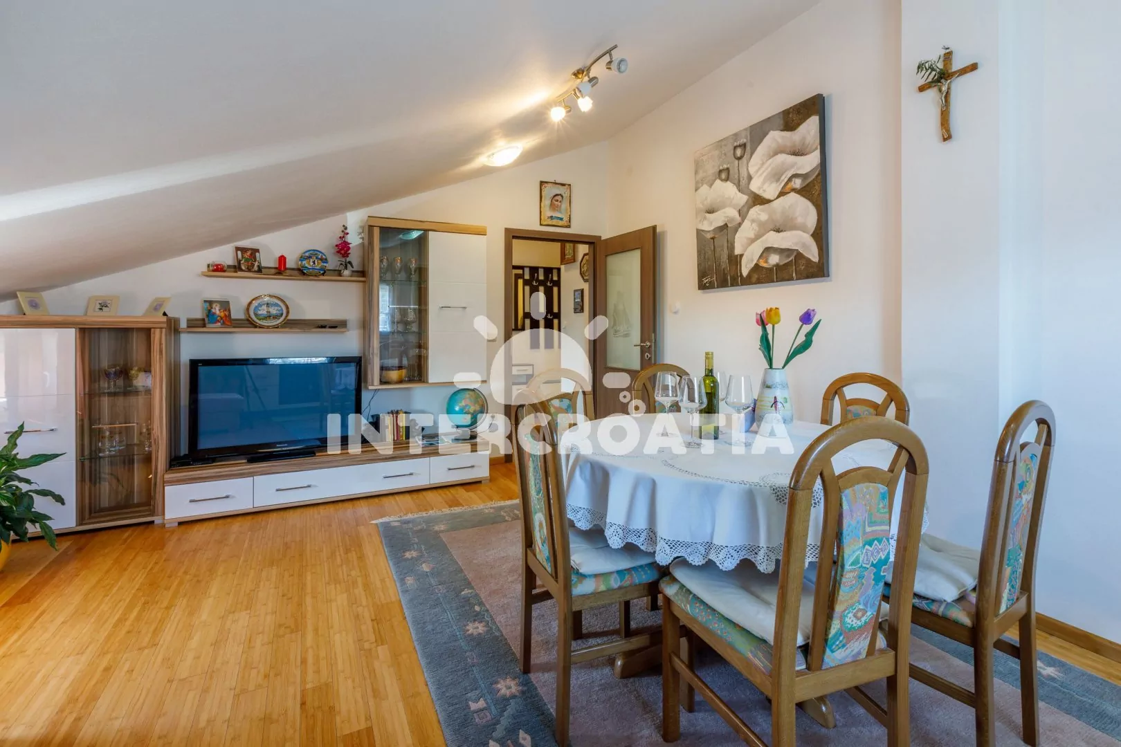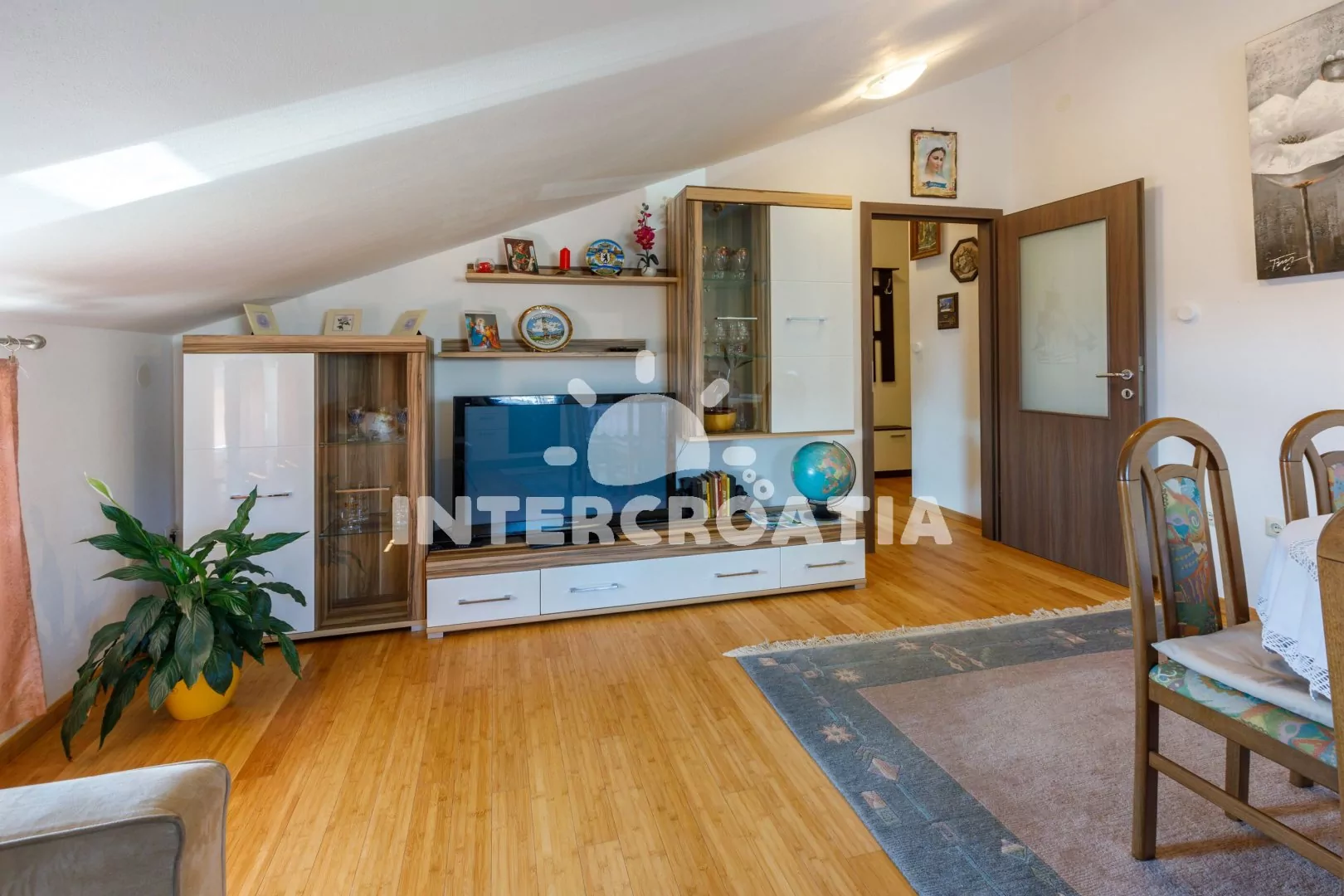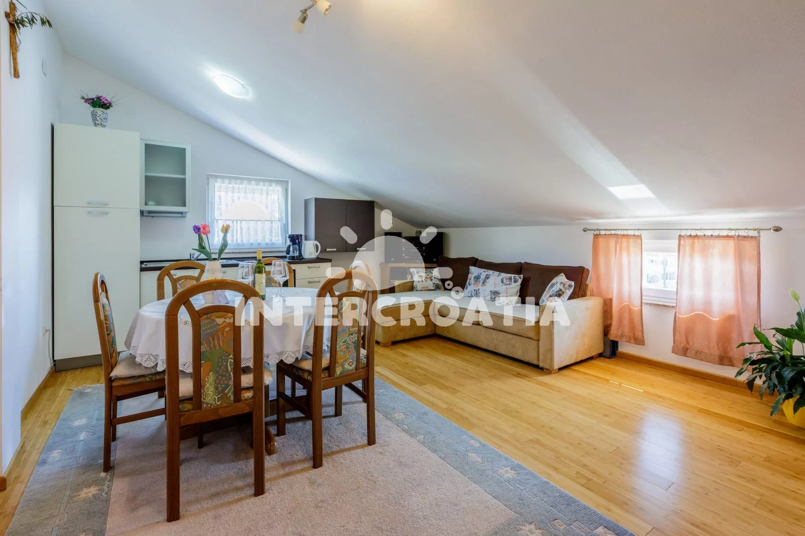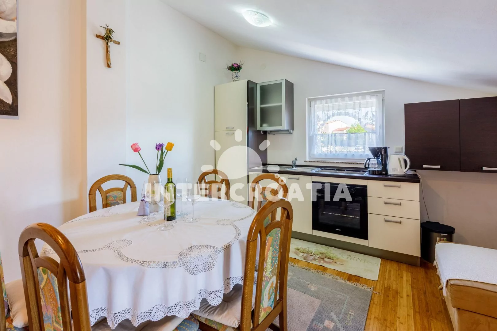 Podkrovní apartmán (65 m2) s terasou a výhledem na moře je vhodný pro 4 až 5 osob. Obývací pokoj je spojený s kuchyní. Kuchyňská linka je vybavena varnou deskou, troubou, rychlovarnou konvicí,…