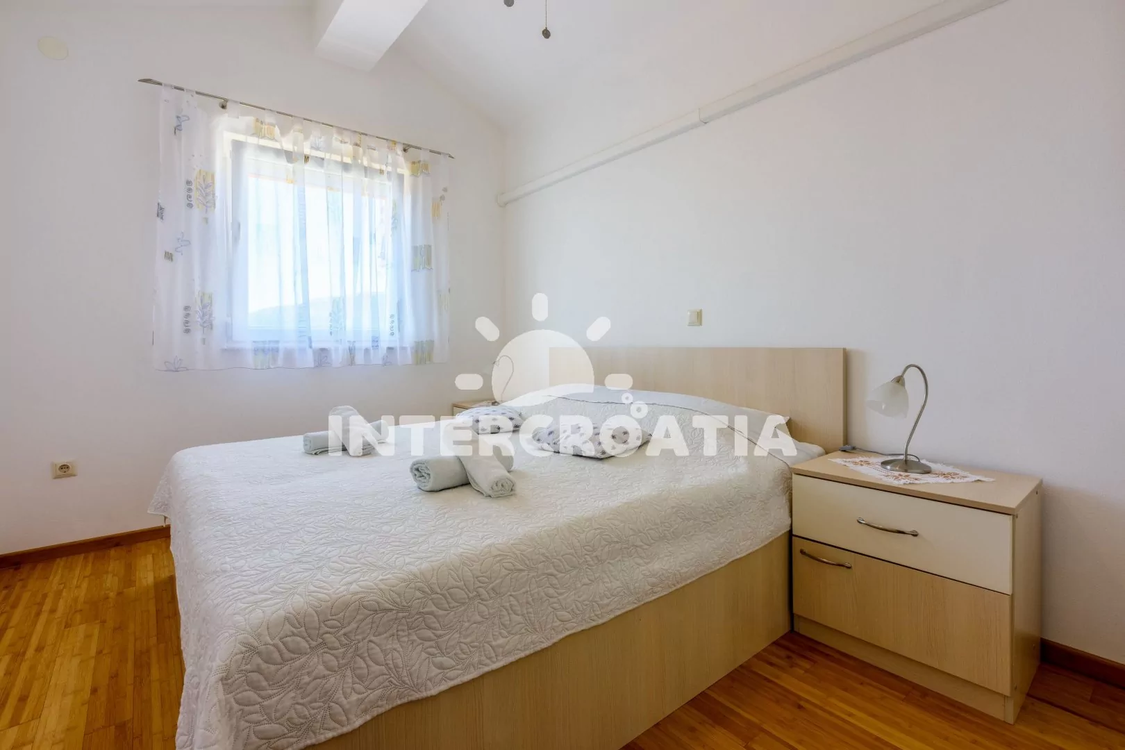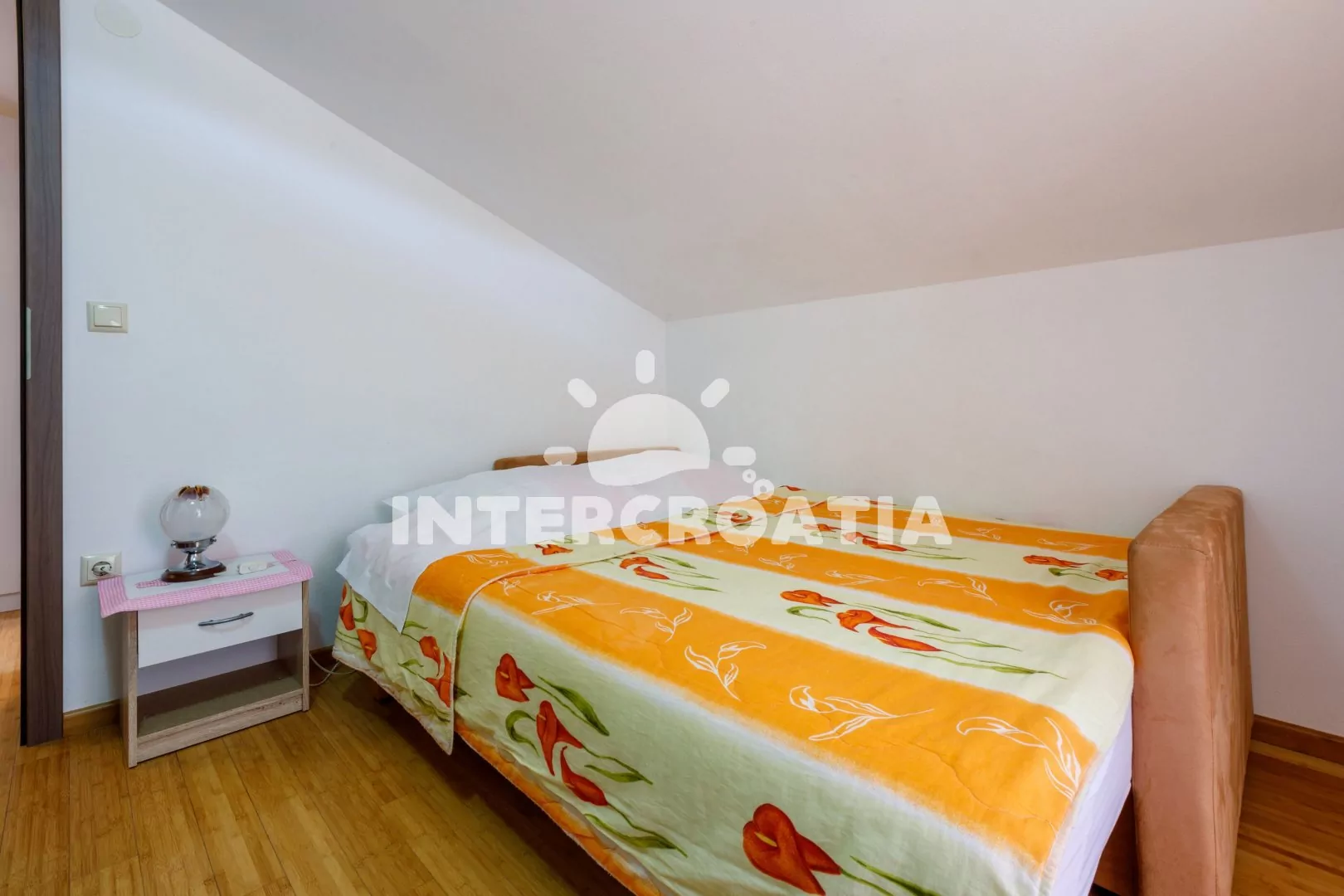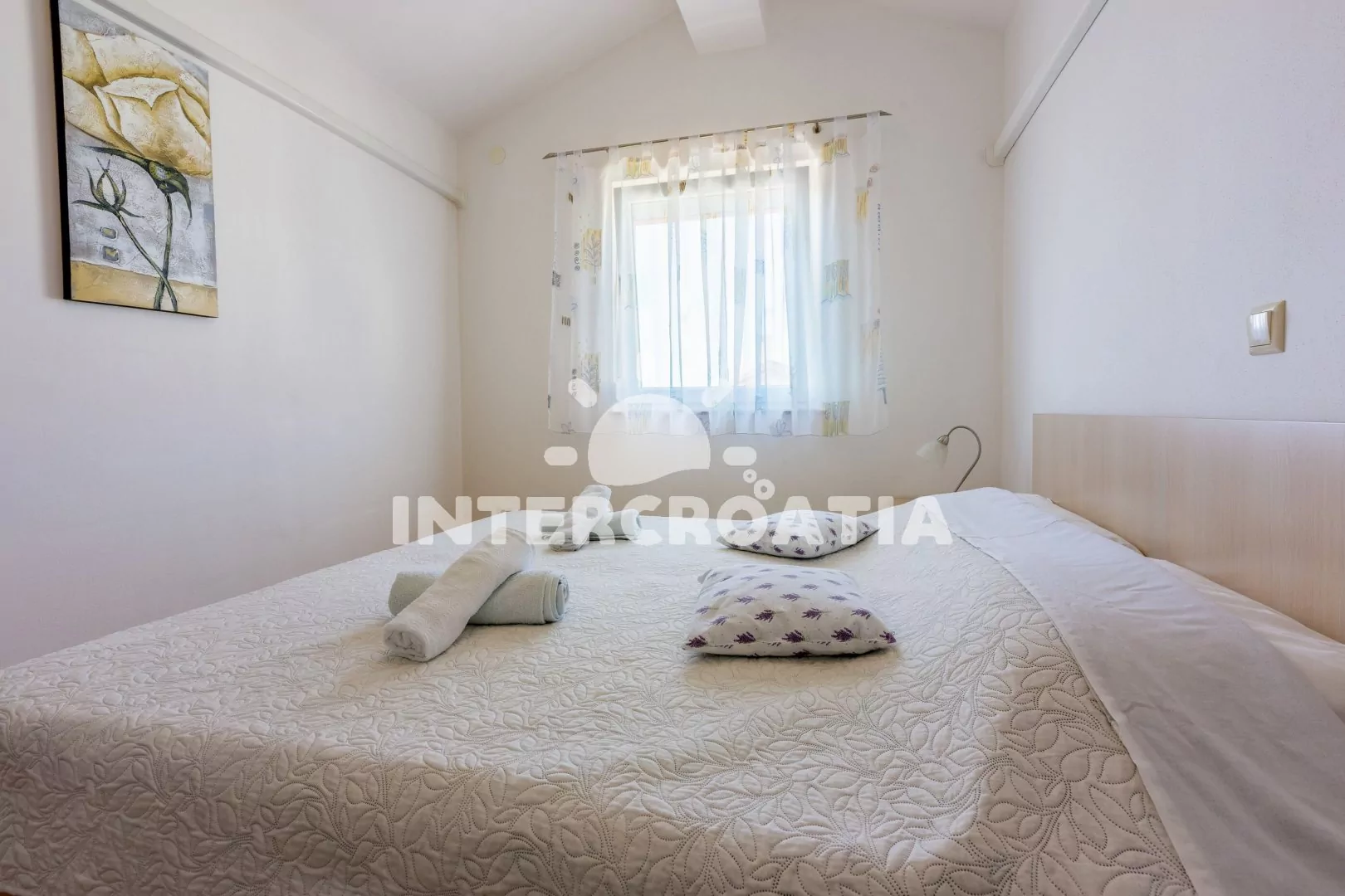 Podkrovní apartmán (65 m2) s terasou a výhledem na moře je vhodný pro 4 až 5 osob. Obývací pokoj je spojený s kuchyní. Kuchyňská linka je vybavena varnou deskou, troubou, rychlovarnou konvicí, nádobím a lednicí s mrazákem. Obývací pokoj s jídelním stolem pro 6 osob, pohovkou (rozložitelná na extra lůžko pro 1 osobu), televizí se satelitním programem a klimatizací. První Ložnice s jedním dvoulůžkem. Druhá ložnice s rozložitelným lůžkem pro 2 osoby a vstupem na terasu. Koupelna s vanou, umyvadlem a wc. Hostům je k dispozici parkování u objektu zdarma.