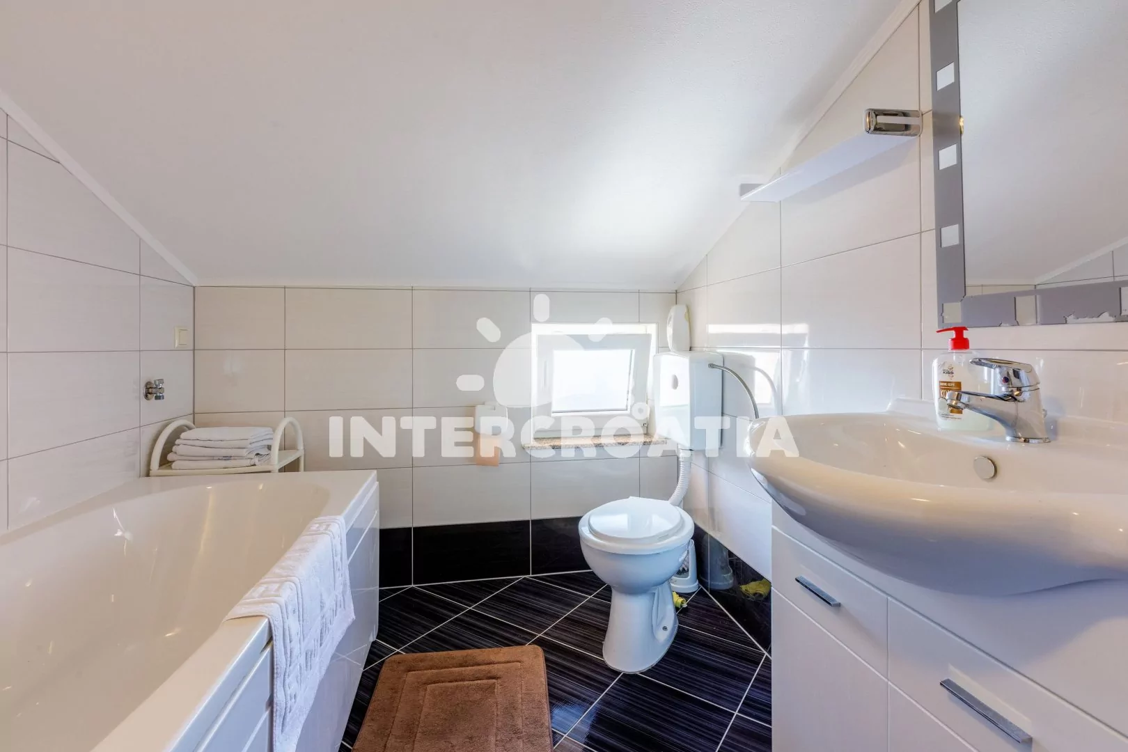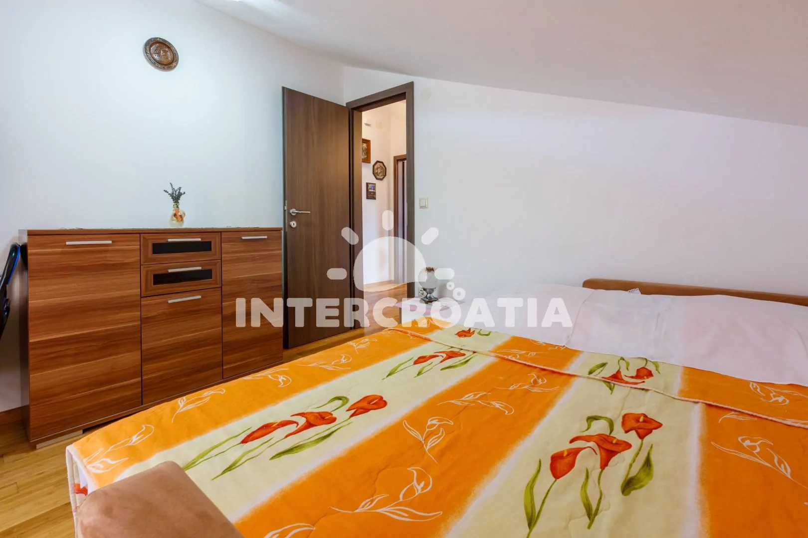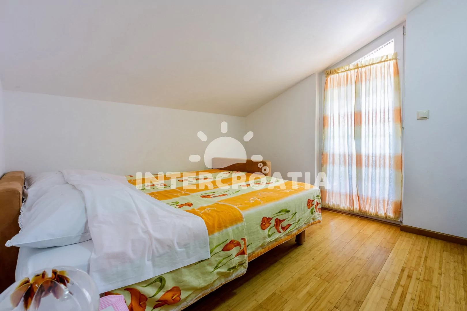 Podkrovní apartmán (65 m2) s terasou a výhledem na moře je vhodný pro 4 až 5 osob. Obývací pokoj je spojený s kuchyní. Kuchyňská linka je vybavena varnou deskou, troubou, rychlovarnou konvicí, nádobím a lednicí s mrazákem. Obývací pokoj s jídelním stolem pro 6 osob, pohovkou (rozložitelná na extra lůžko pro 1 osobu), televizí se satelitním programem a klimatizací. První Ložnice s jedním dvoulůžkem. Druhá ložnice s rozložitelným lůžkem pro 2 osoby a vstupem na terasu. Koupelna s vanou, umyvadlem a wc. Hostům je k dispozici parkování u objektu zdarma.