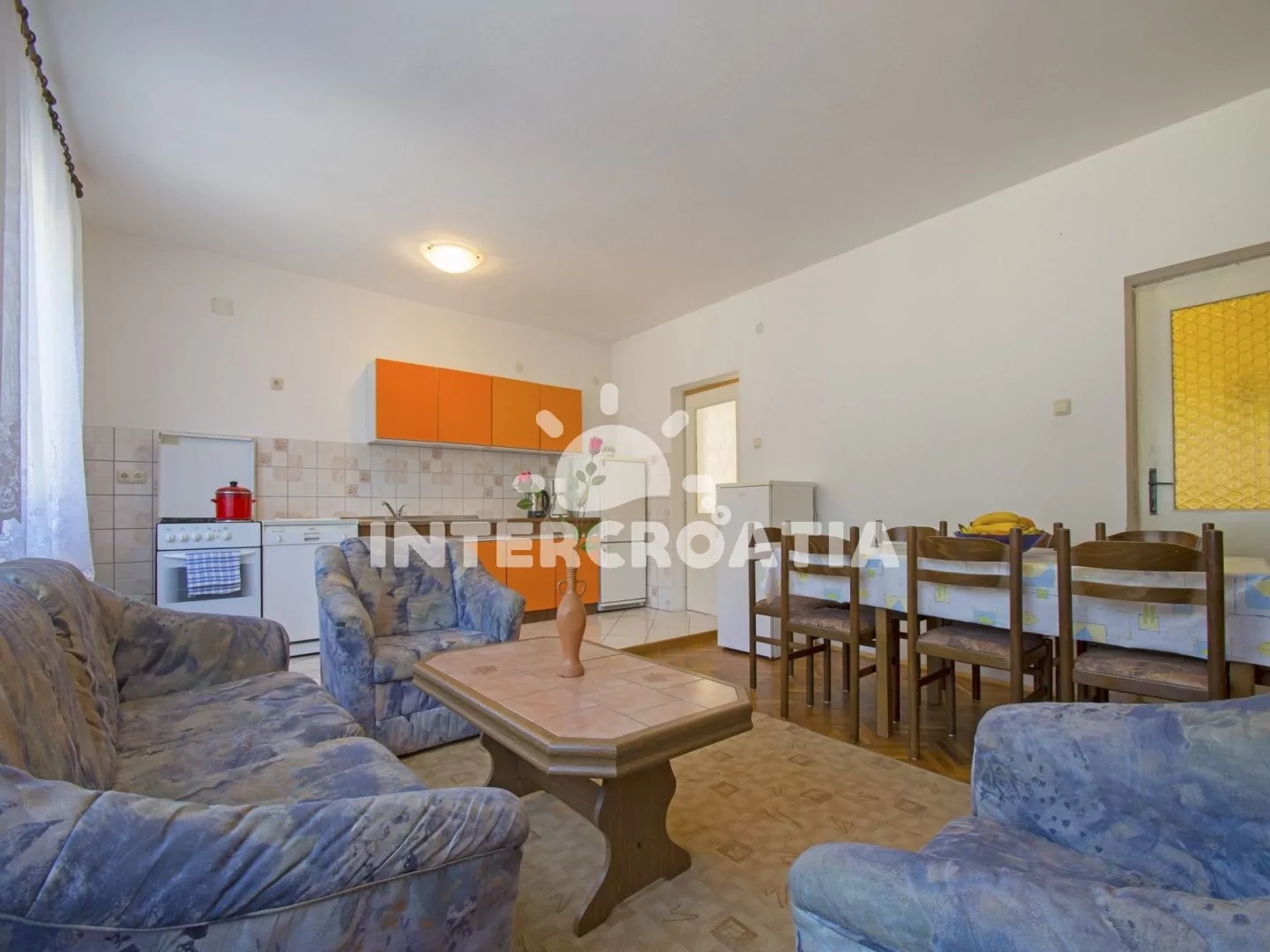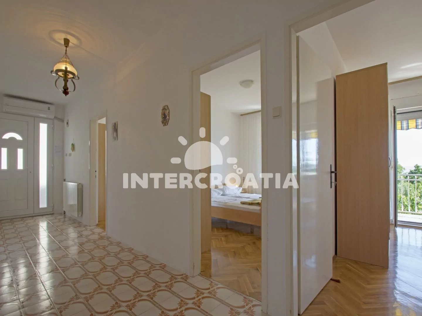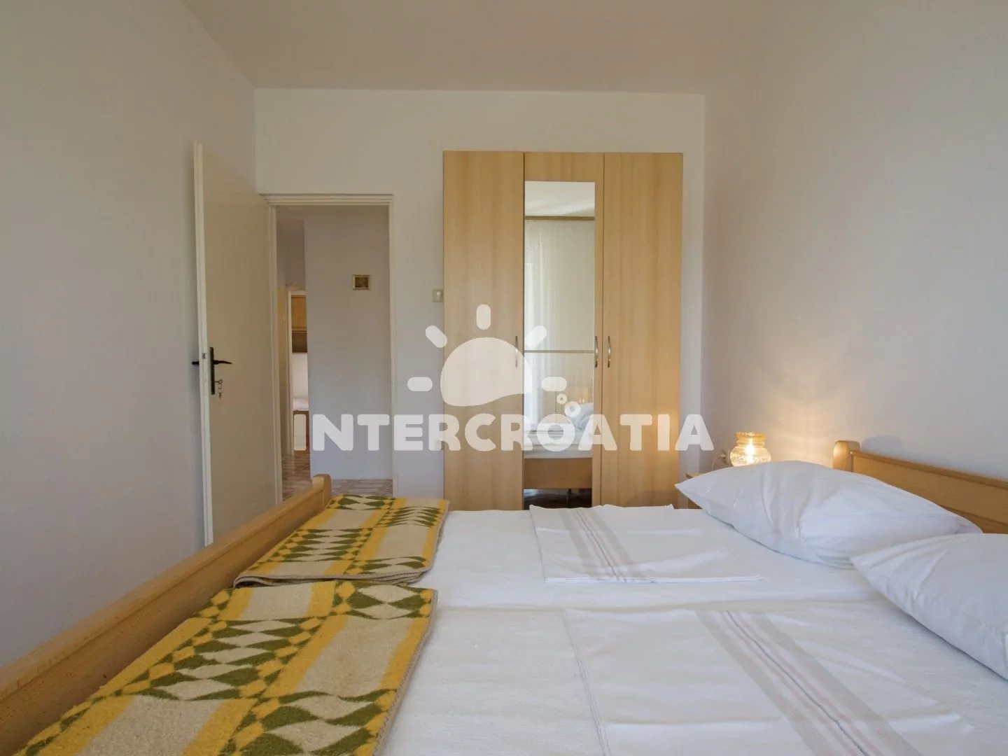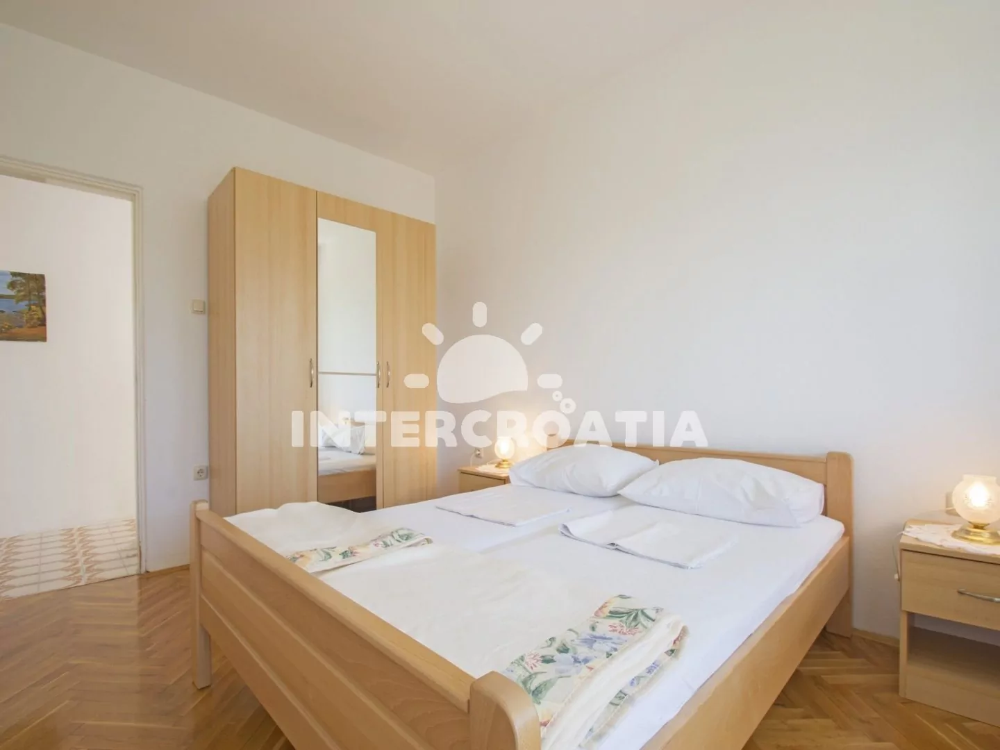 Apartmán (110 m2) s terasou, balkonem a výhledem na moře se nachází v 1. patře domu. Apartmán má 4 ložnice a je vhodný pro 8 osob. Obývací pokoj je spojený s kuchyní. Kuchyňská linka je vybavena sporákem, troubou, myčkou na nádobí, kávovarem, nádobím a lednicí s mrazákem. Obývací pokoj s jídelním stolem pro 8 osob, sedací soupravou, pohovkou a televizí se satelitním programem. Na chodbě klimatizace a vstupy do 4 ložnic. Všechny 4 ložnice jsou vybaveny vždy s jedním dvoulůžkem. První koupelna se sprchovým koutem, umyvadlem a wc. Druhá koupelna s vanou, sprchovou zástěnou, umyvadlem a wc. Hostům je k dispozici parkování u objektu zdarma.