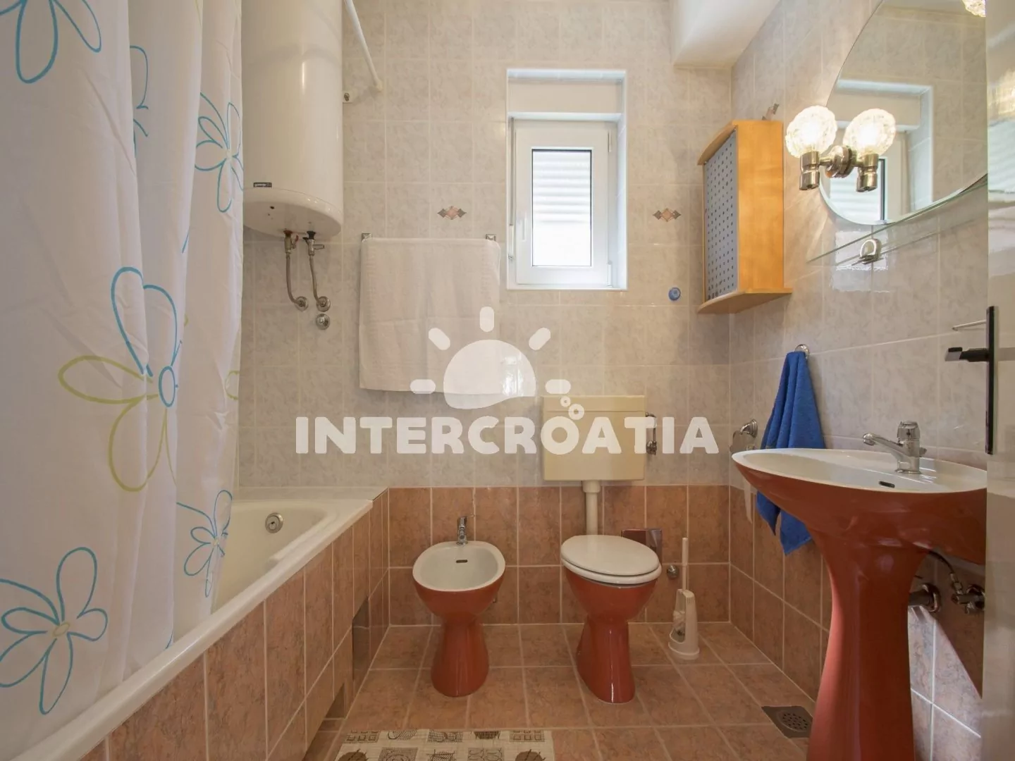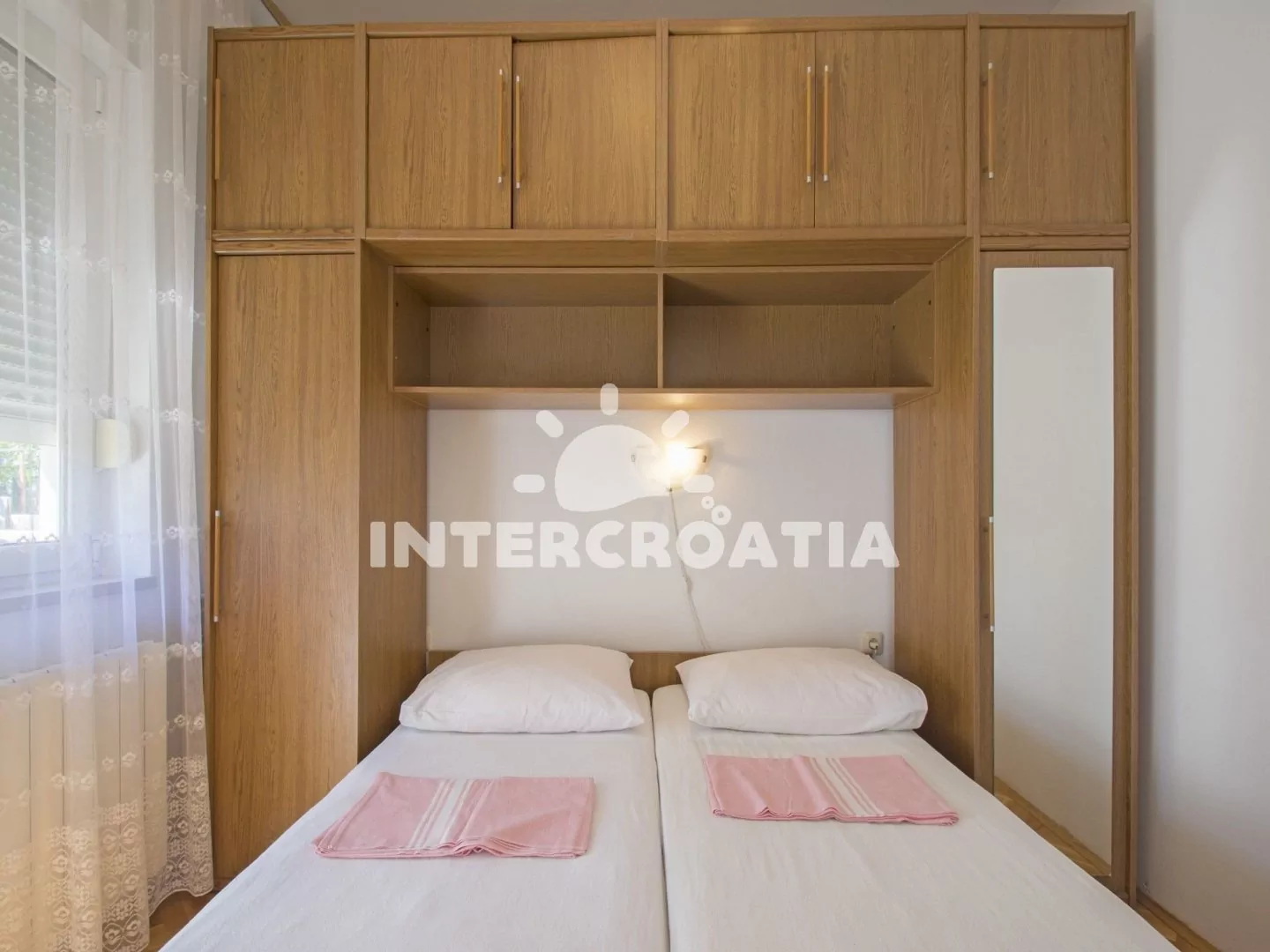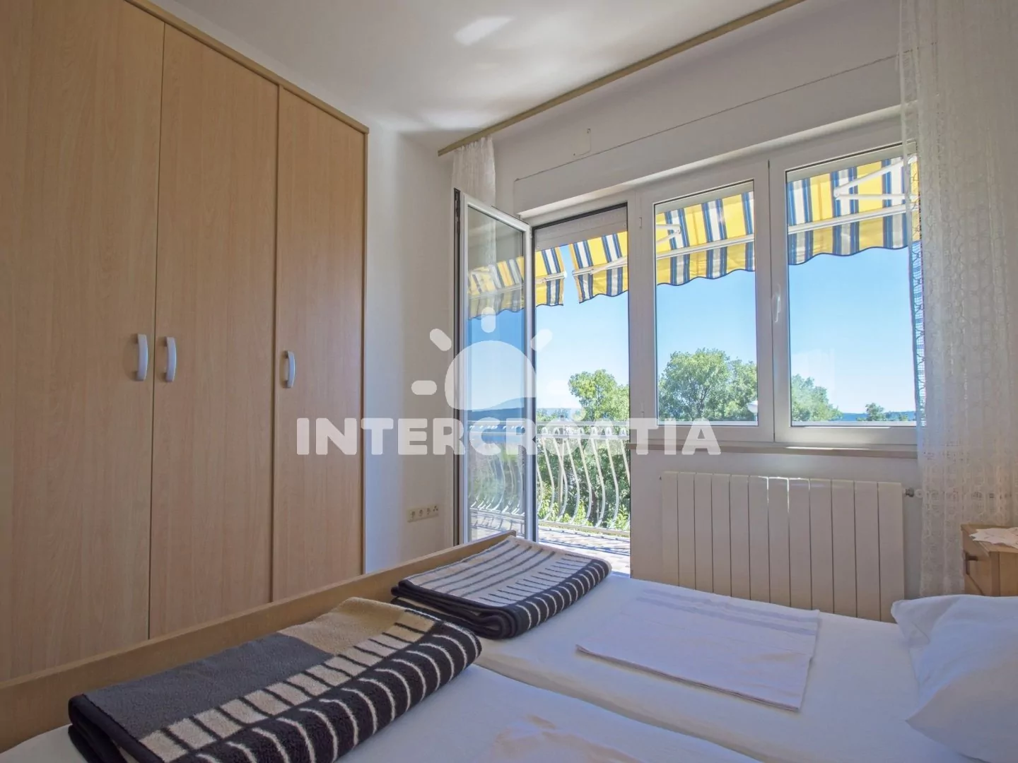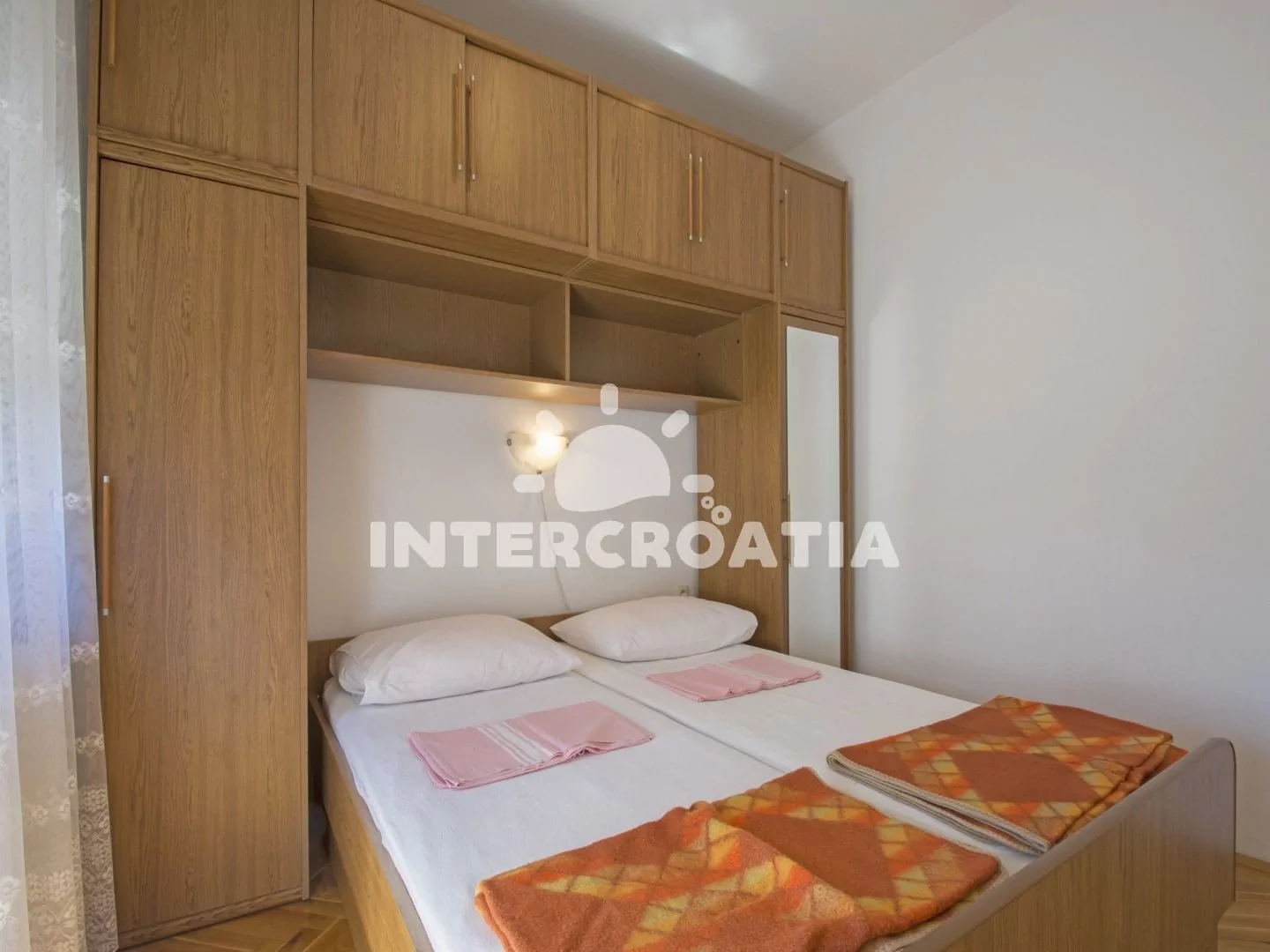 Apartmán (110 m2) s terasou, balkonem a výhledem na moře se nachází v 1. patře domu. Apartmán má 4 ložnice a je vhodný pro 8 osob. Obývací pokoj je spojený s kuchyní. Kuchyňská linka je vybavena sporákem, troubou, myčkou na nádobí, kávovarem, nádobím a lednicí s mrazákem. Obývací pokoj s jídelním stolem pro 8 osob, sedací soupravou, pohovkou a televizí se satelitním programem. Na chodbě klimatizace a vstupy do 4 ložnic. Všechny 4 ložnice jsou vybaveny vždy s jedním dvoulůžkem. První koupelna se sprchovým koutem, umyvadlem a wc. Druhá koupelna s vanou, sprchovou zástěnou, umyvadlem a wc. Hostům je k dispozici parkování u objektu zdarma.