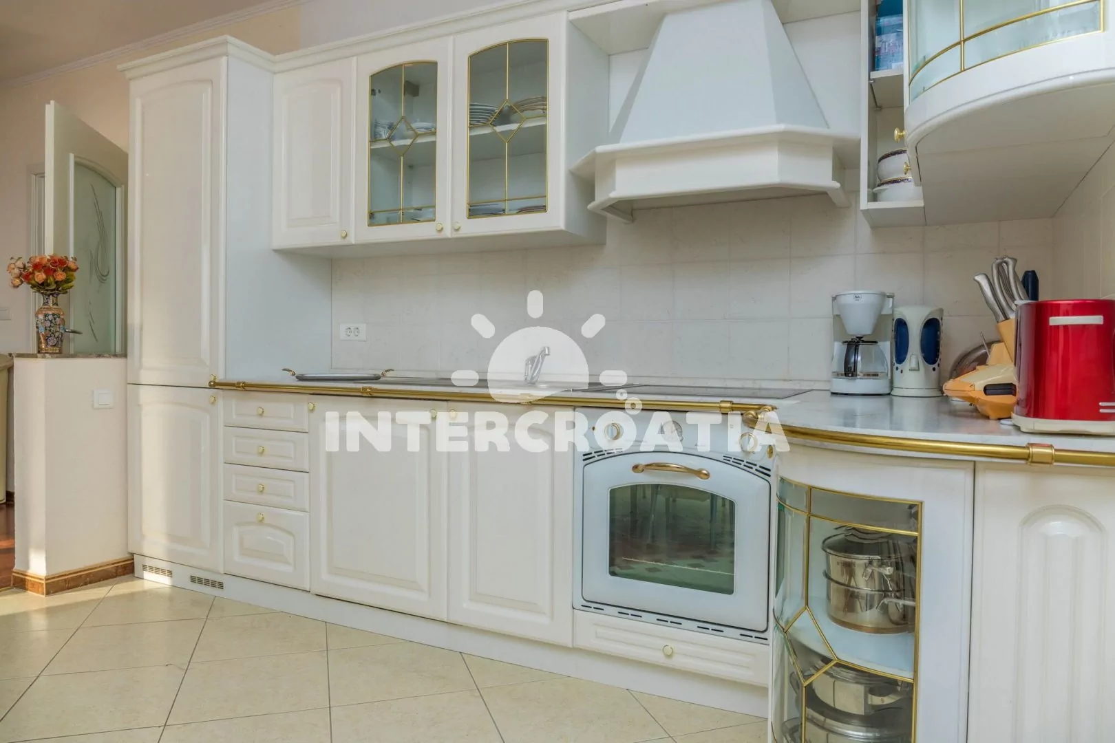 Luxusně zařízený apartmán (110 m2) s terasou a výhledem na moře se nachází v 1. patře vily a je vhodný pro 4 až 6 osob. Obývací pokoj je spojený s kuchyní. Kuchyňská linka je vybavena sklokeramickou varnou deskou, digestoří, troubou, myčkou na nádobí, rychlovarnou konvicí, kávovarem, toustovačem, nádobím a lednicí s mrazákem. Obývací pokoj se sedací soupravou, pohovkou (rozložitelná na extra lůžko pro 2 osoby), televizí se satelitním programem, klimatizací a vstupem na terasu. První i druhá ložnice je vybavena vždy s jedním dvoulůžkem. První koupelna se sprchovým koutem, umyvadlem a wc. Druhá koupelna s vanou, umyvadlem a wc. Hostům je k dispozici parkování u objektu zdarma.