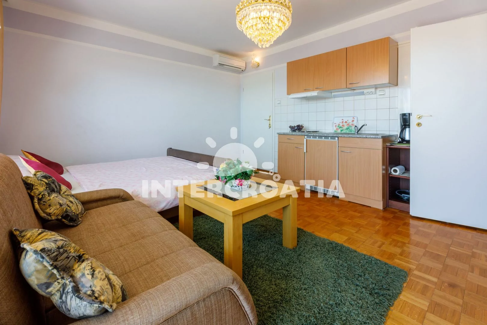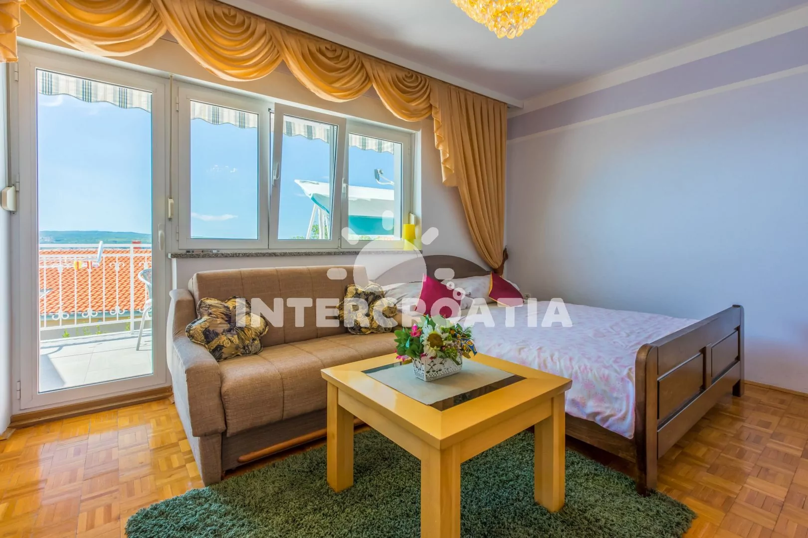 Apartmán typu studio s vlastním balkonem a výhledem na moře se nachází v 2. patře domu a je vhodný pro 2 osoby. Obývací místnost je spojena s kuchyní. Kuchyňská linka je vybavena dvouplotýnkovým vařičem, kávovarem, toustovačem, nádobím a lednicí s mrazákem. Obývací místnost s pohovkou, televizí se satelitním programem, jedním dvoulůžkem, klimatizací a vstupem na balkon. Koupelna se sprchovým koutem, umyvadlem a wc. Hostům je k dispozici parkování u objektu zdarma.