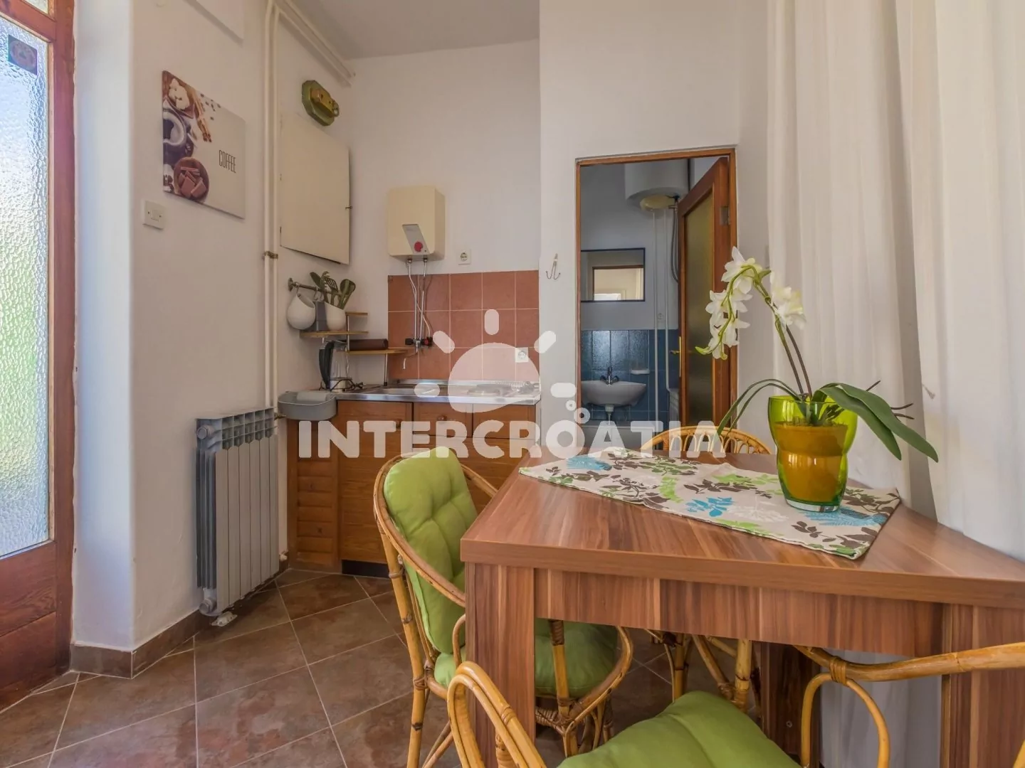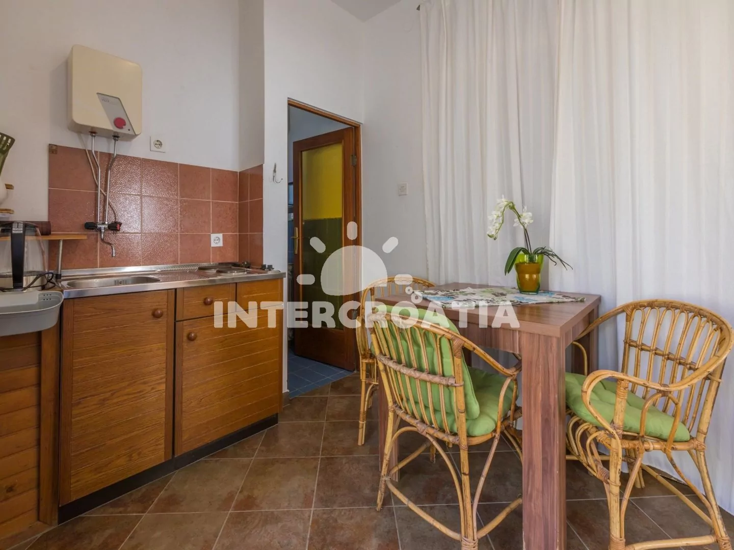 Apartmán s terasou se nachází v přízemí domu a je vhodný pro 2 až 3 osoby. Kuchyň s jídelním stolem pro 3 osoby, kuchyňskou linkou s dvouplotýnkovým vařičem, rychlovarnou konvicí, kávovarem, nádobím…