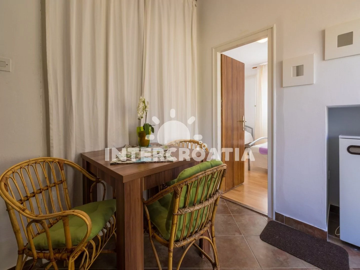 Apartmán s terasou se nachází v přízemí domu a je vhodný pro 2 až 3 osoby. Kuchyň s jídelním stolem pro 3 osoby, kuchyňskou linkou s dvouplotýnkovým vařičem, rychlovarnou konvicí, kávovarem, nádobím a lednicí s mrazákem. Ložnice s dvoulůžkem, jedním jednolůžkem, televizí se satelitním programem a klimatizací. Koupelna se sprchovým koutem, umyvadlem a wc. Hostům je k dispozici parkování u objektu zdarma.