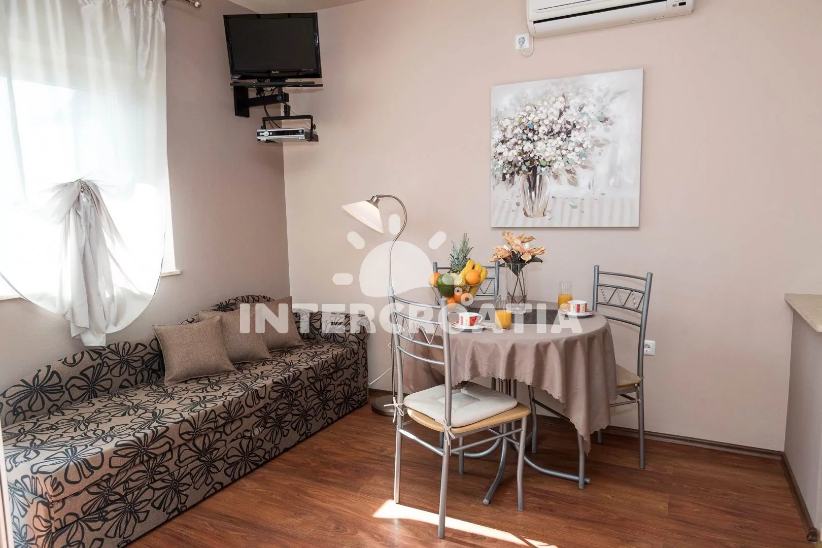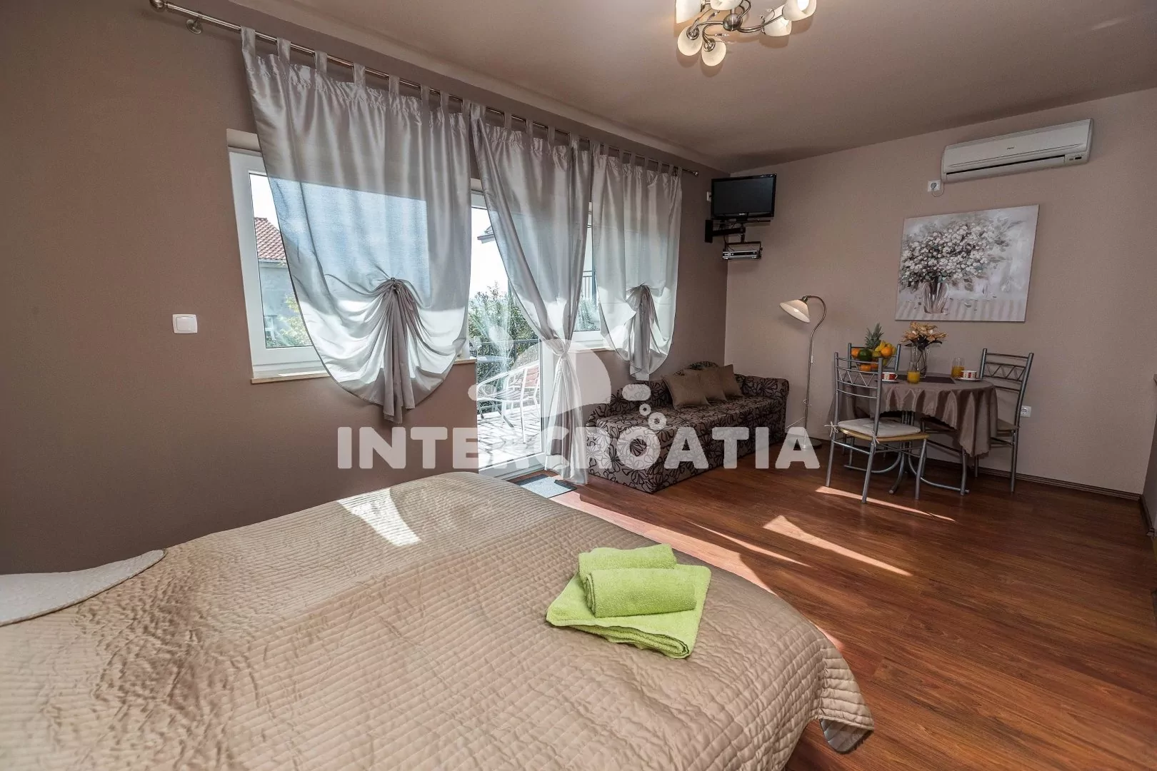 Apartmán (30 m2) typu studio, s vlastní terasou se nachází v 1. patře domu a je vhodný pro 2 osoby. Obývací místnost je spojena s kuchyní. Kuchyňská linka je vybavena dvouplotýnkovým vařičem, kávovarem, nádobím a lednicí s mrazákem. Obývací místnost s jídelním stolem pro 3 osoby, pohovkou, televizí se satelitním programem, jedním dvoulůžkem, klimatizací a vstupem na terasu. Koupelna se sprchovým koutem, umyvadlem a wc. Hostům je k dispozici parkování u objektu zdarma.