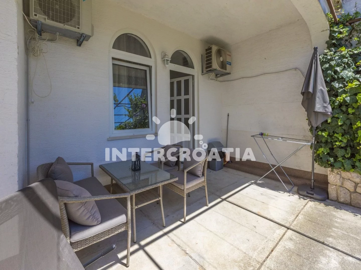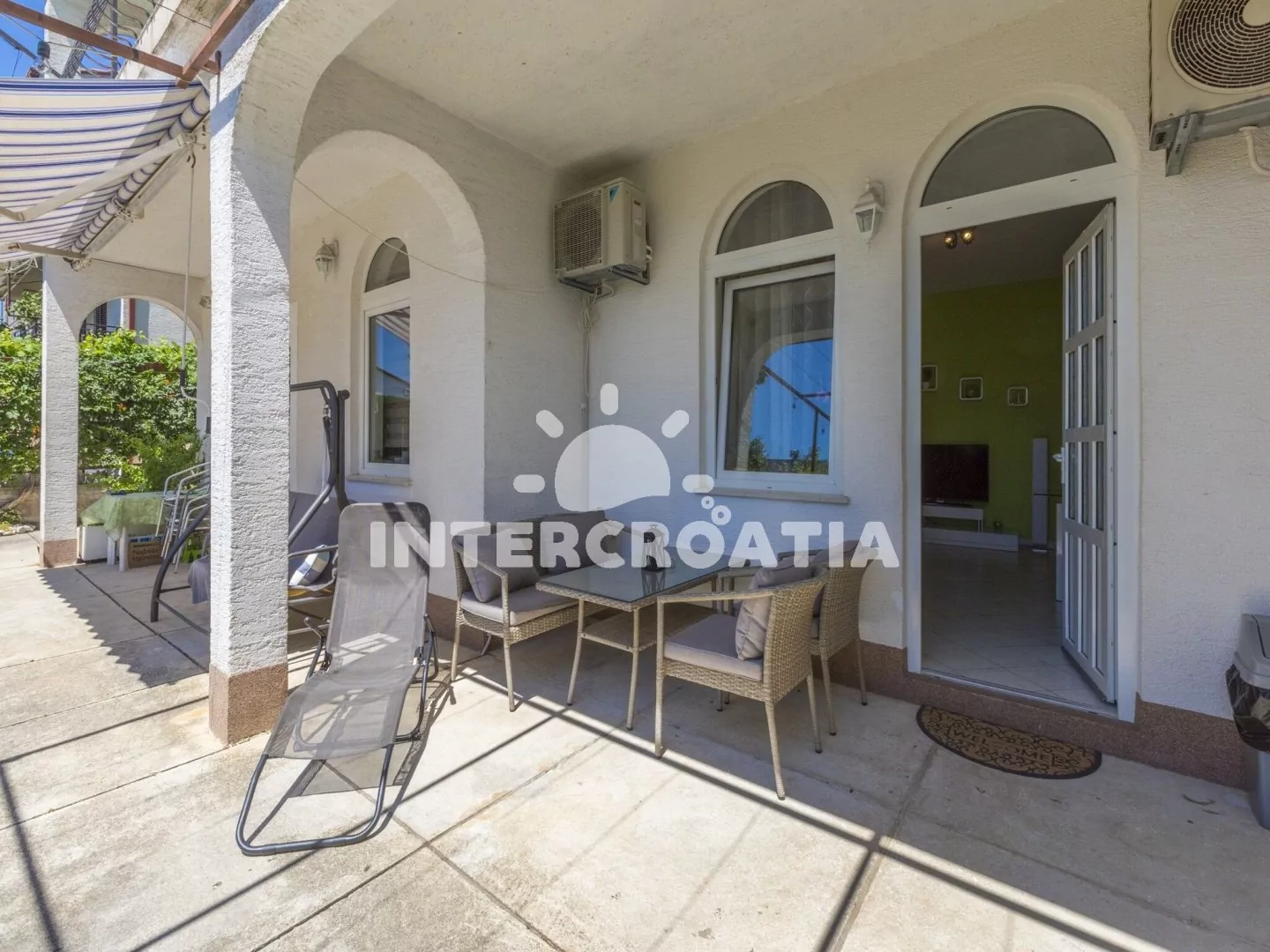 Apartmán s terasou se nachází v přízemí domu a je vhodný pro 2 až 4 osoby. Kuchyňská linka je vybavena sklokeramickou varnou deskou, digestoří, troubou, kávovarem, mikrovlnnou troubou, toustovačem, rychlovarnou konvicí, nádobím a lednicí s mrazákem. Obývací pokoj s jídelním stolem pro 4 osoby, pohovkou (rozložitelná na extra lůžko pro 2 osoby), televizí se satelitním programem, radiem, klimatizací a vstupem na terasu. Ložnice s jedním dvoulůžkem. Koupelna se sprchovým koutem, umyvadlem, fénem a wc. Hostům je k dispozici parkování u objektu zdarma.