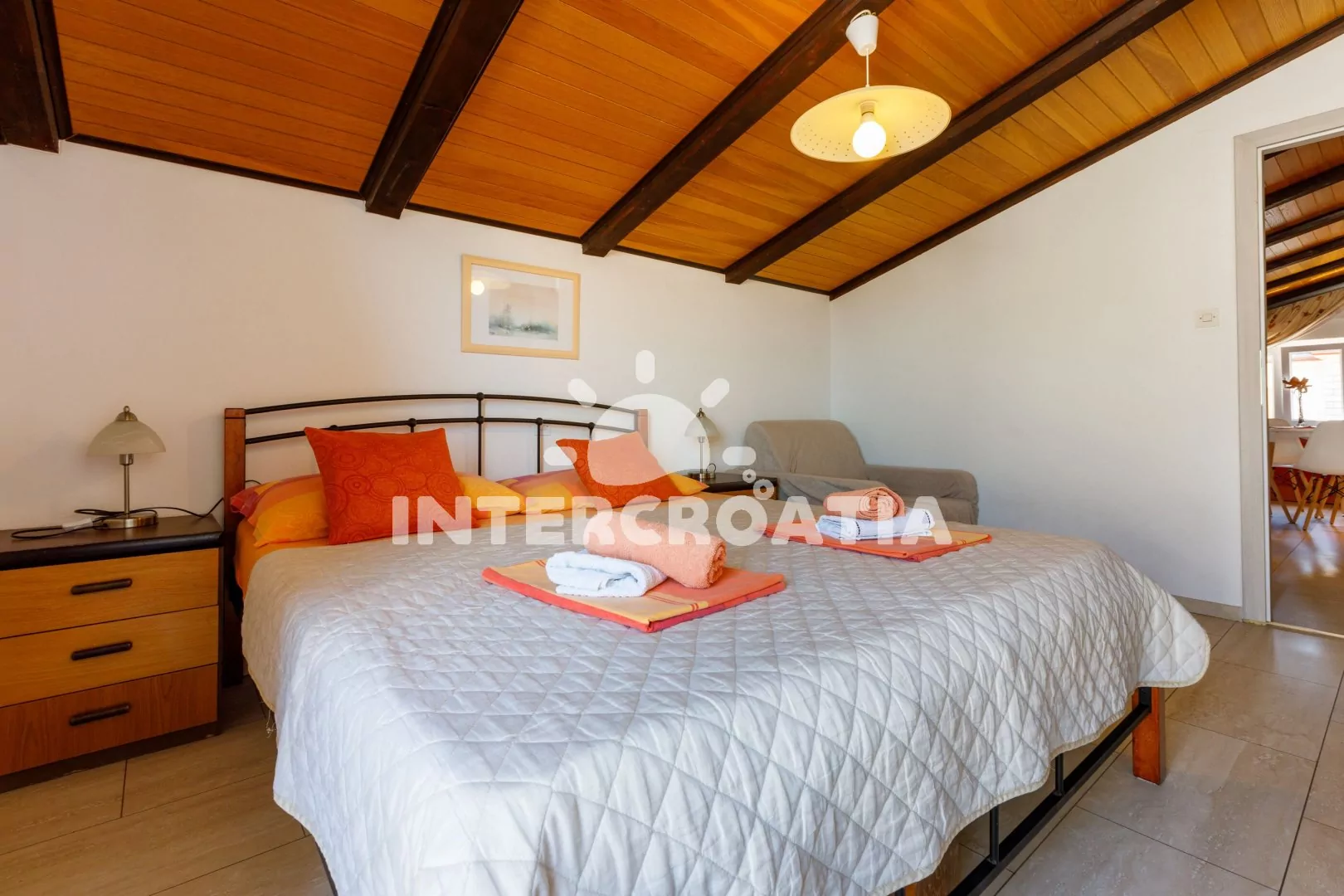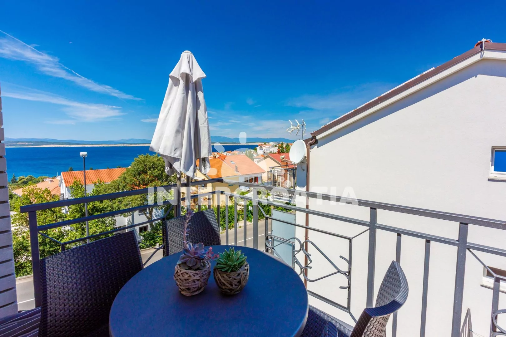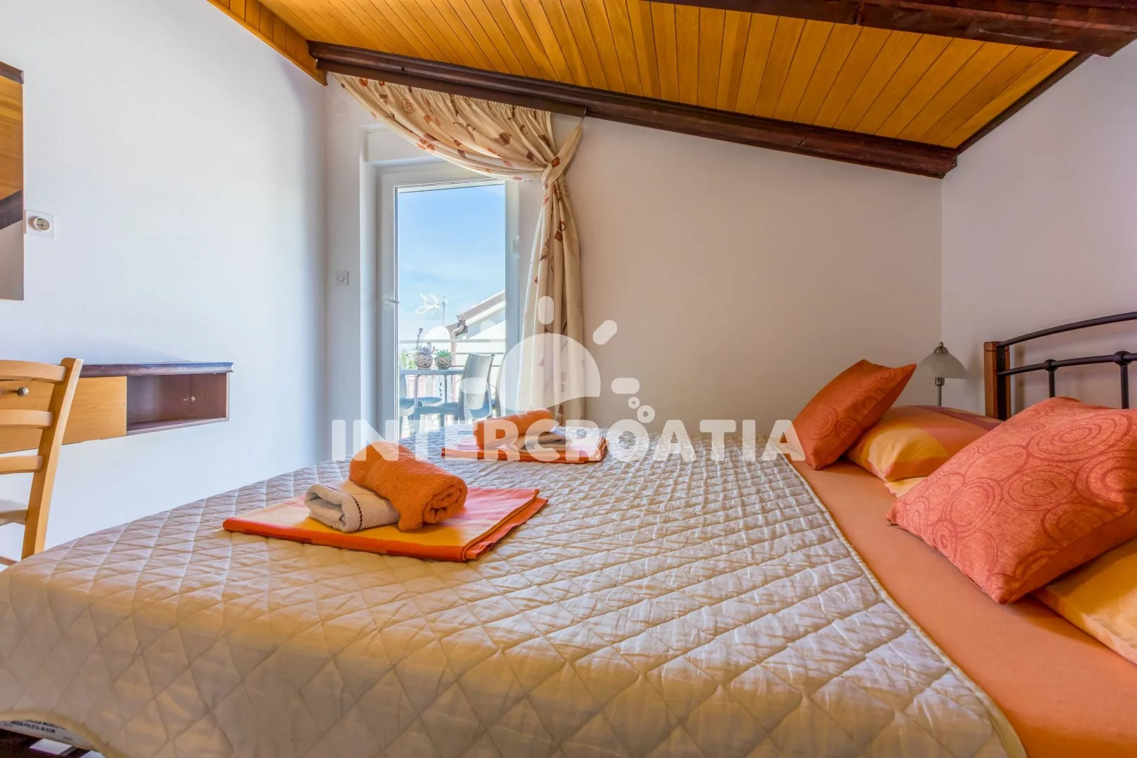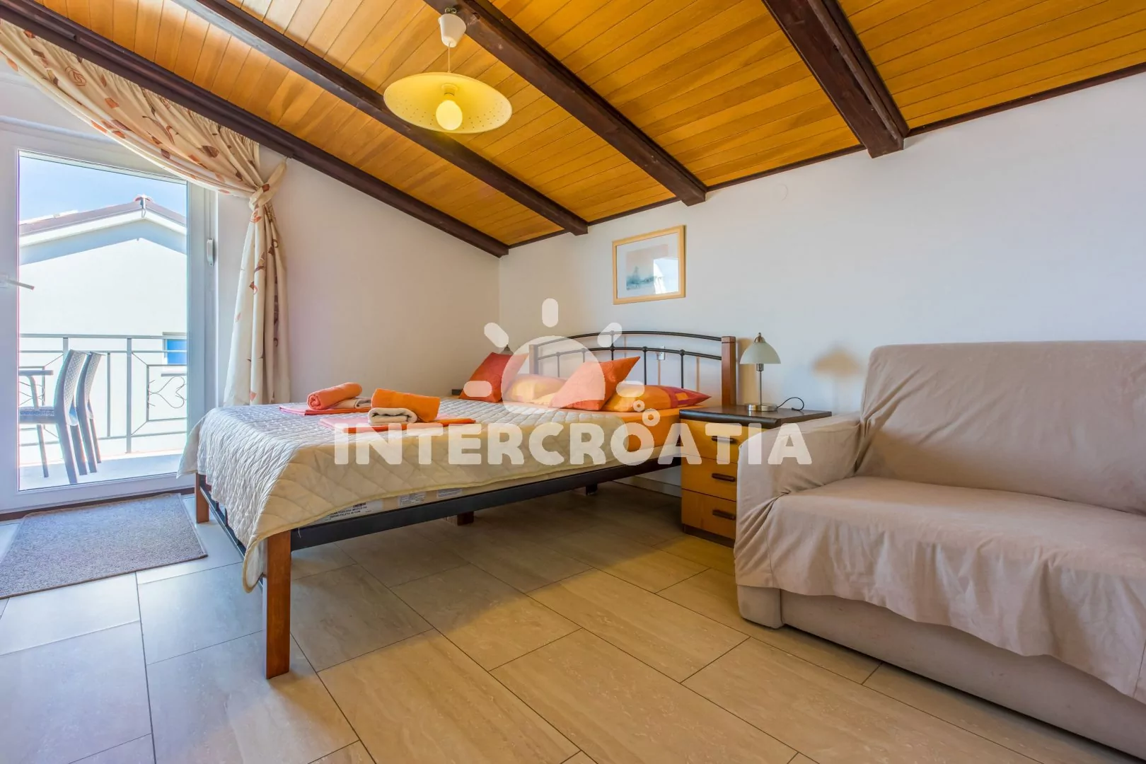 Apartmán (40 m2) s balkonem a výhledem na moře se nachází v podkroví domu a je vhodný pro až 4 osoby. Obývací pokoj je spojený s kuchyní. Kuchyňská linka je vybavena sklokeramickou varnou deskou, digestoří, troubou, myčkou na nádobí, kávovarem, toustovačem, mikrovlnnou troubou, rychlovarnou konvicí, nádobím a lednicí s mrazákem. Obývací pokoj s jídelním stolem pro 4 osoby, pohovkou (rozložitelná na extra lůžko pro 2 osoby), televizí se satelitním programem a klimatizací. Ložnice s dvoulůžkem a vstupem na balkon. Koupelna se sprchovým koutem, umyvadlem, fénem a wc. Hostům je k dispozici parkování u objektu zdarma.