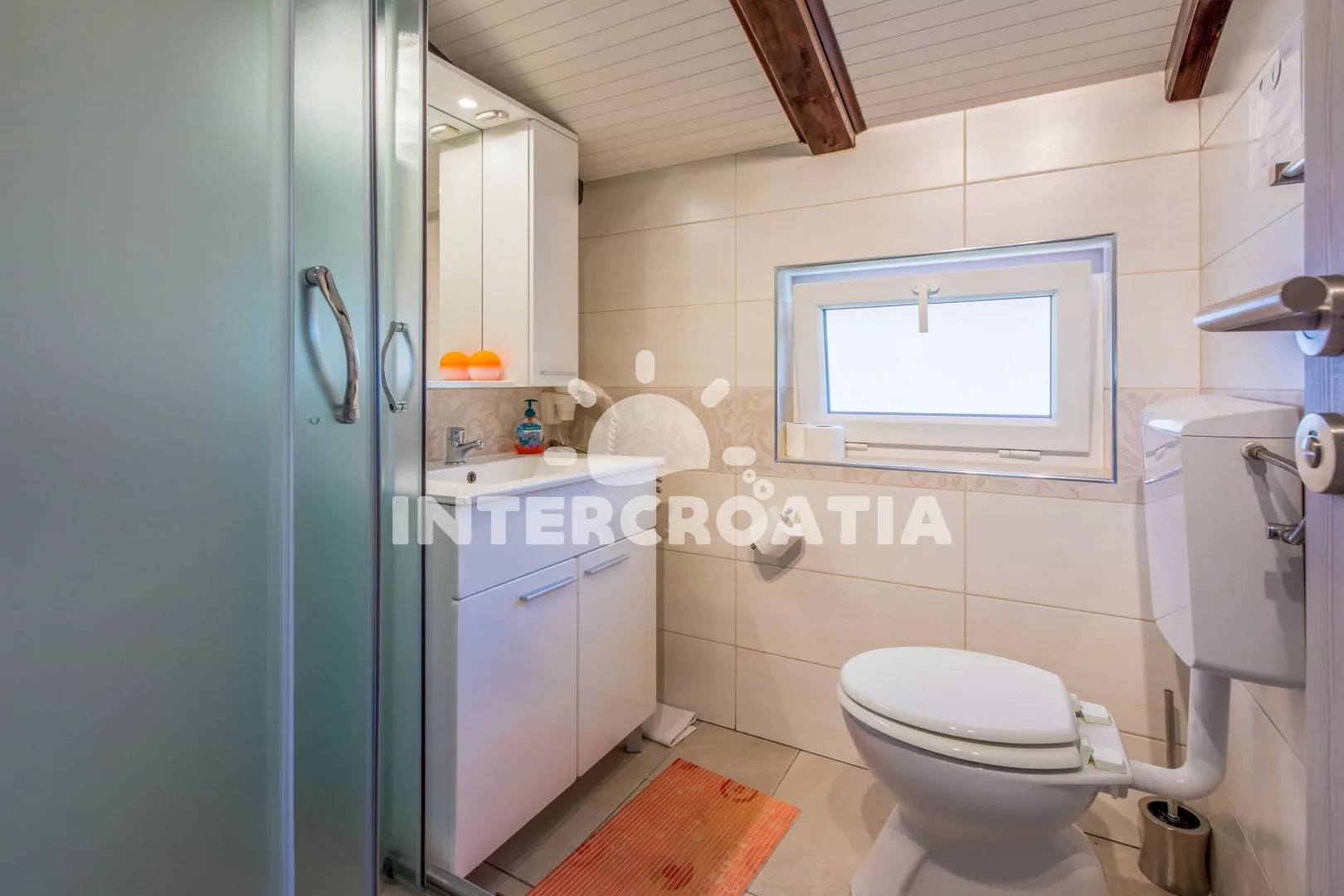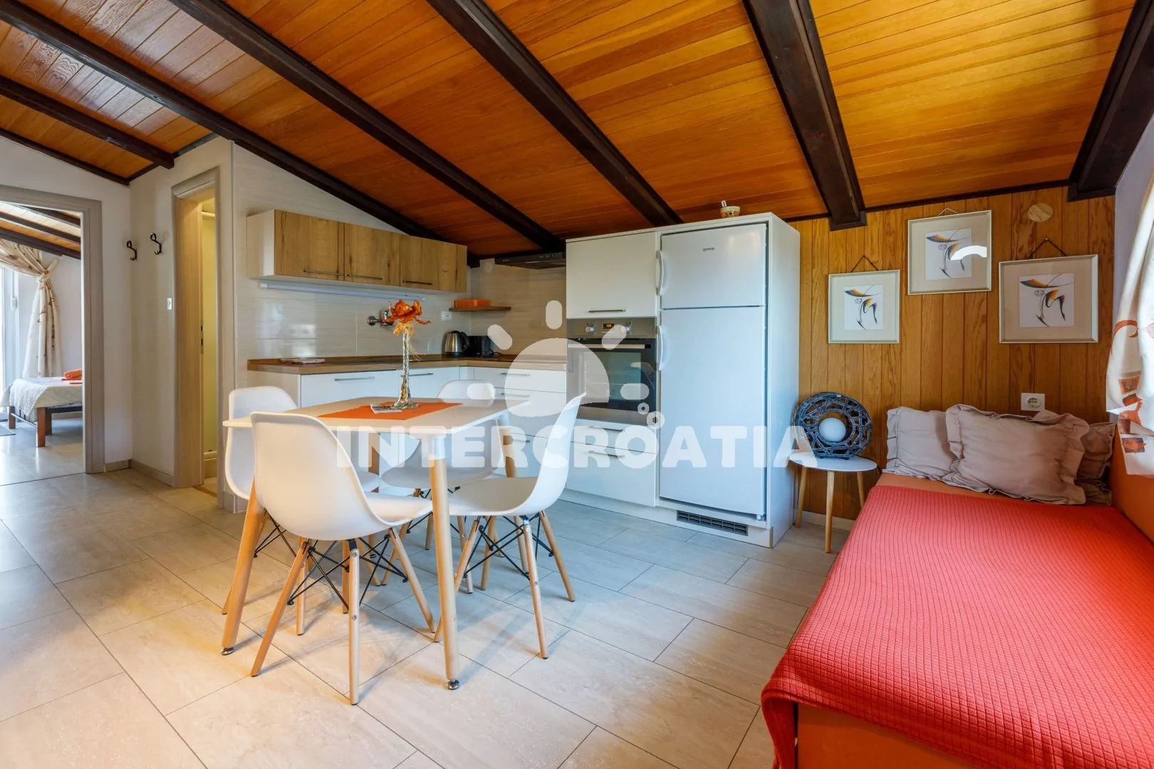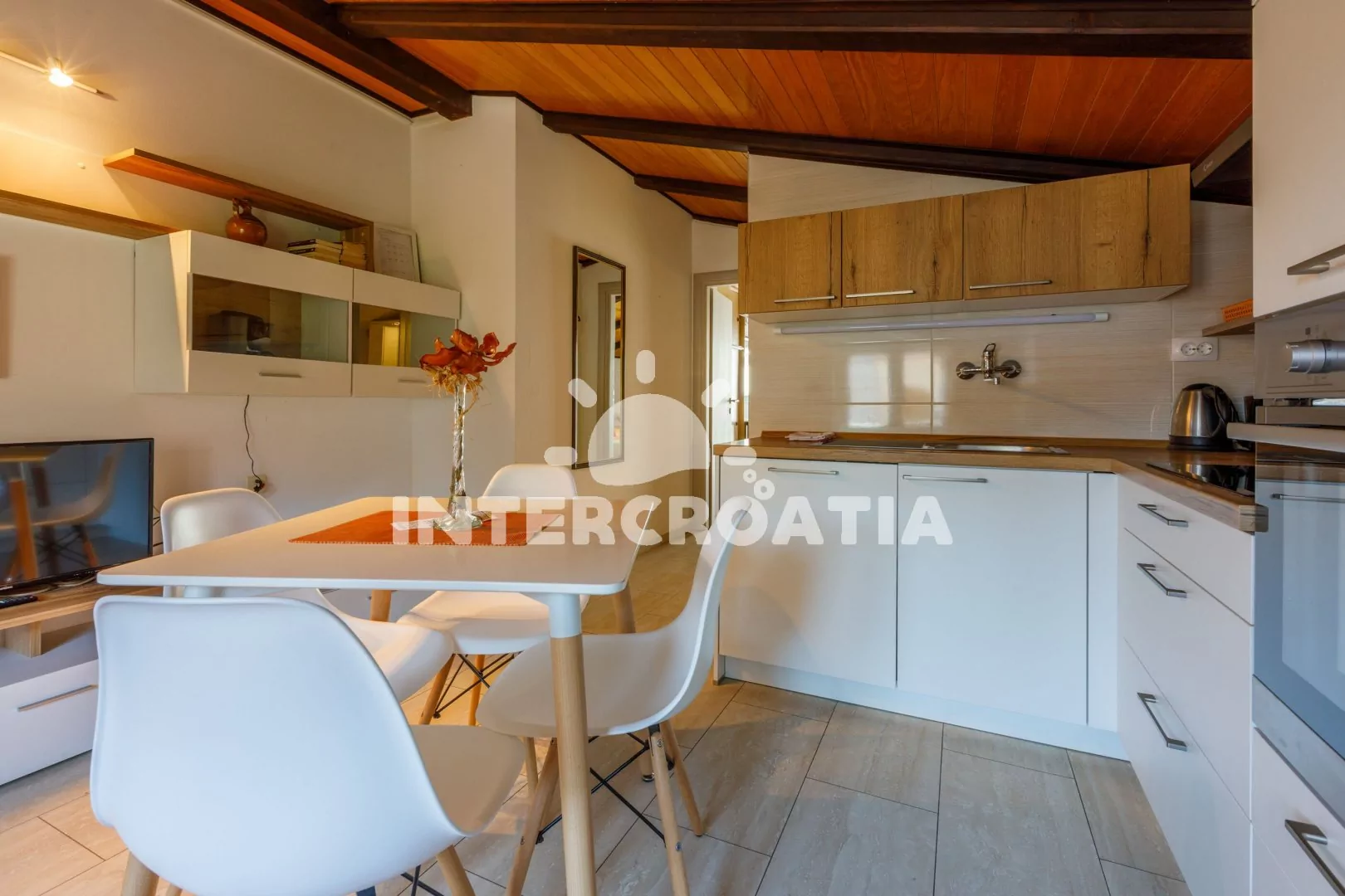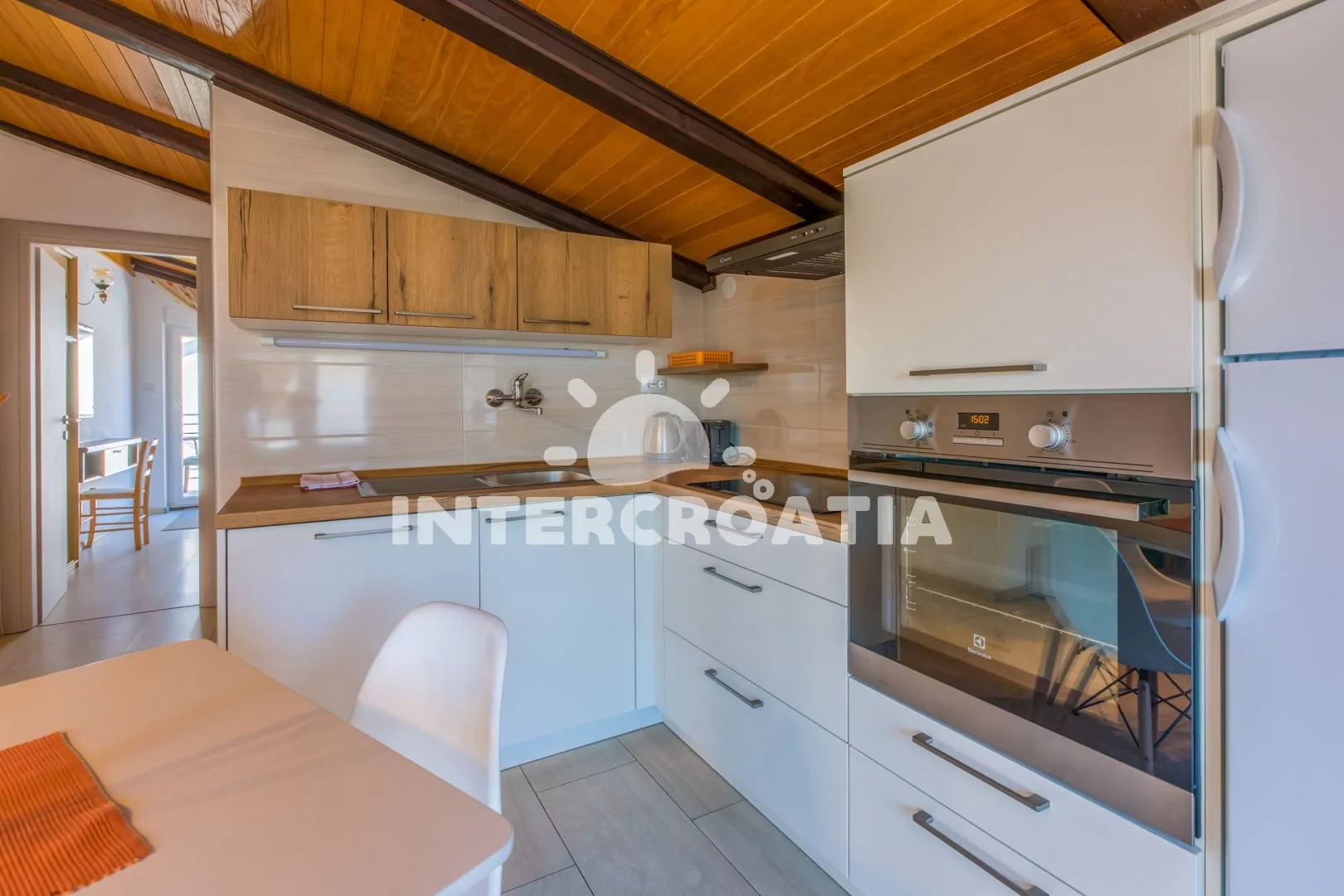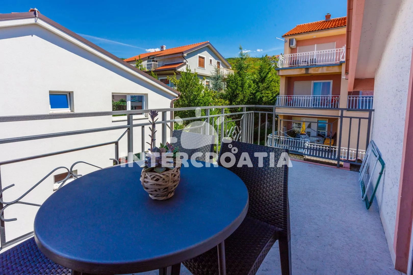 Apartmán (40 m2) s balkonem a výhledem na moře se nachází v podkroví domu a je vhodný pro až 4 osoby. Obývací pokoj je spojený s kuchyní. Kuchyňská linka je vybavena sklokeramickou varnou deskou, digestoří, troubou, myčkou na nádobí, kávovarem, toustovačem, mikrovlnnou troubou, rychlovarnou konvicí, nádobím a lednicí s mrazákem. Obývací pokoj s jídelním stolem pro 4 osoby, pohovkou (rozložitelná na extra lůžko pro 2 osoby), televizí se satelitním programem a klimatizací. Ložnice s dvoulůžkem a vstupem na balkon. Koupelna se sprchovým koutem, umyvadlem, fénem a wc. Hostům je k dispozici parkování u objektu zdarma.