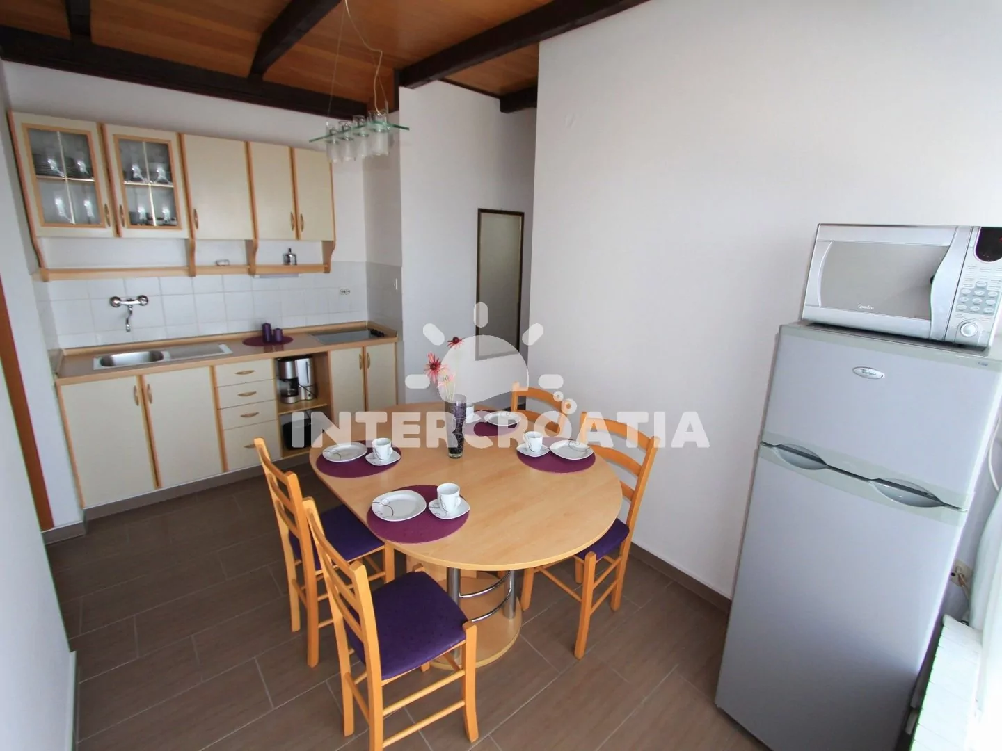 Podkrovní apartmán (55 m2) s terasou a výhledem na moře je vhodný pro 4 až 6 osob. Kuchyňská linka je vybavena varnou deskou, mikrovlnnou troubou, kávovarem, toustovačem, rychlovarnou konvicí,…