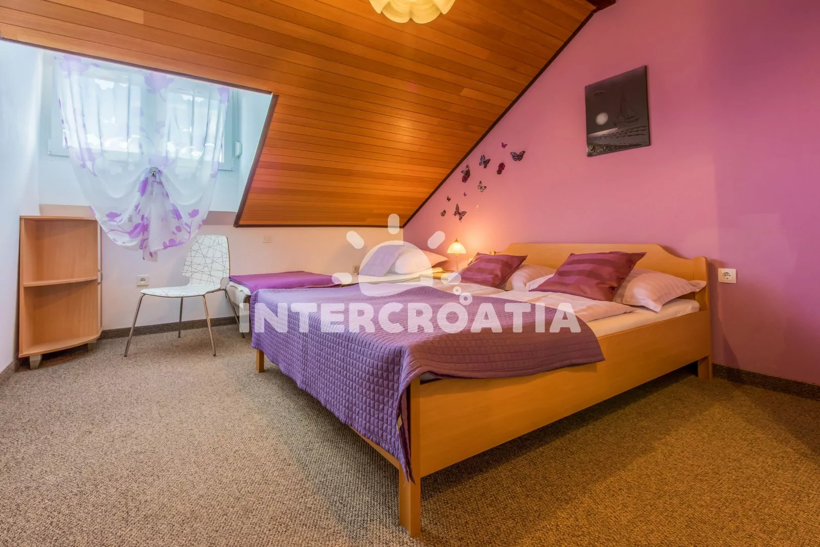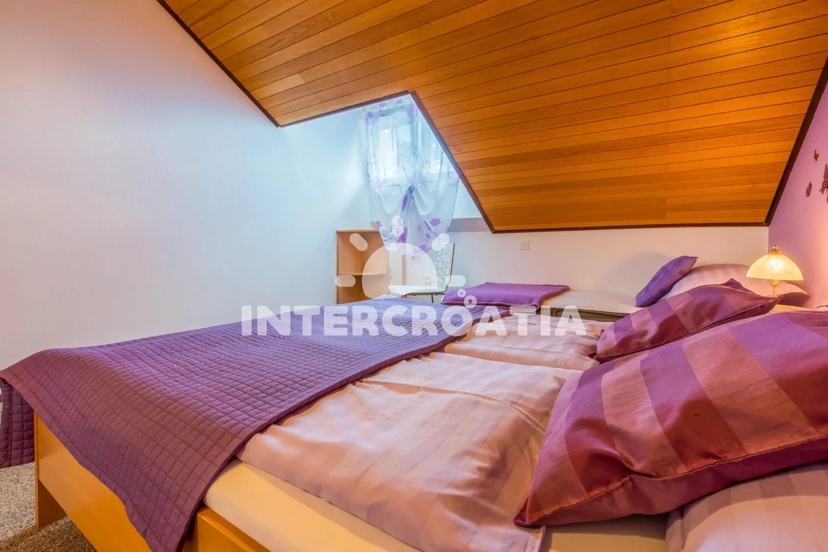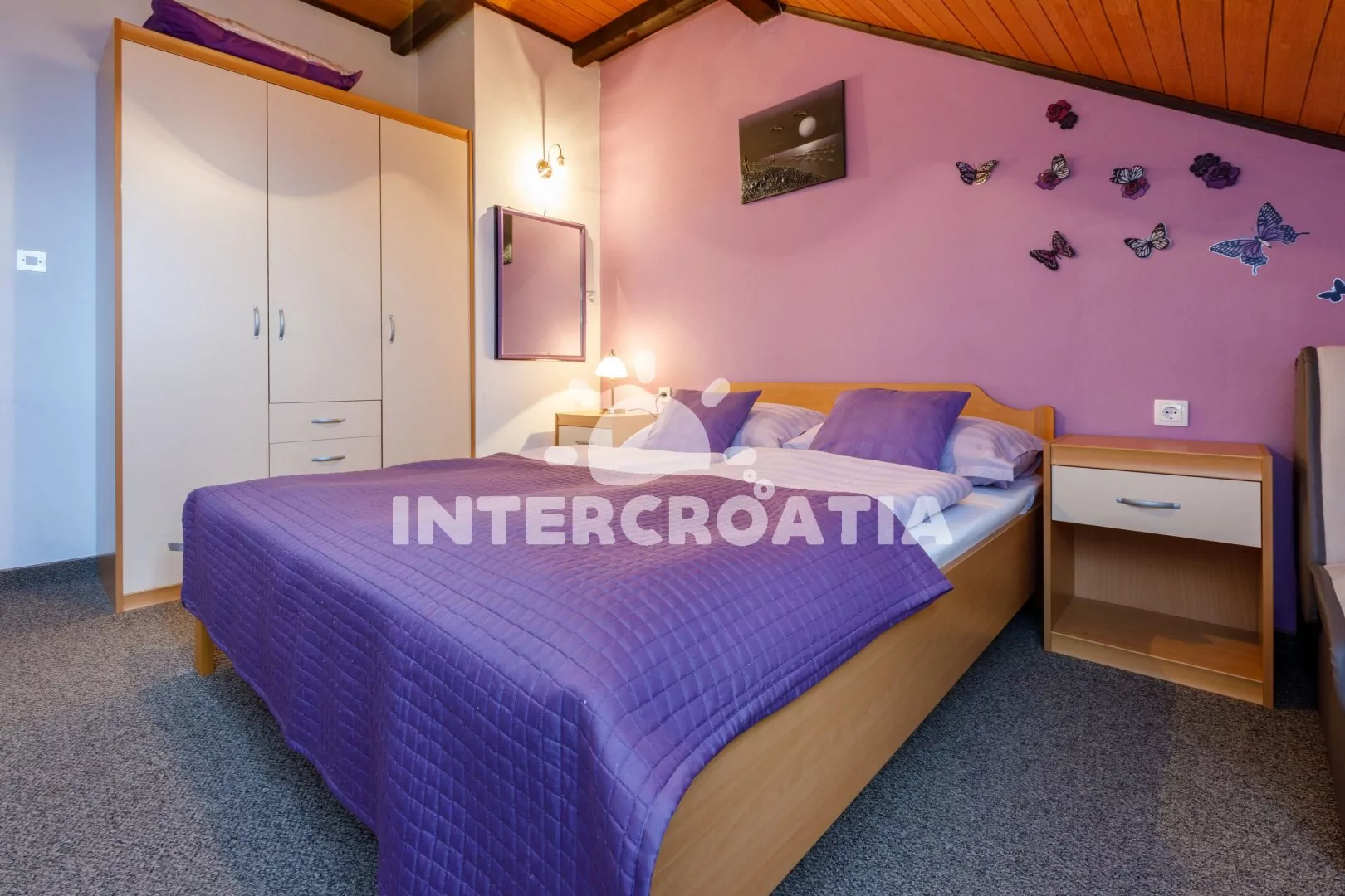 Podkrovní apartmán (55 m2) s terasou a výhledem na moře je vhodný pro 4 až 6 osob. Kuchyňská linka je vybavena varnou deskou, mikrovlnnou troubou, kávovarem, toustovačem, rychlovarnou konvicí, nádobím a lednicí s mrazákem. Dále jídelní stůl pro 4 osoby, klimatizace a vstup na terasu. První i druhá ložnice je vybavena vždy s dvoulůžkem a jednou přistýlkou. Koupelna se sprchovým koutem, umyvadlem, fénem a wc. Hostům je k dispozici parkování u objektu zdarma.