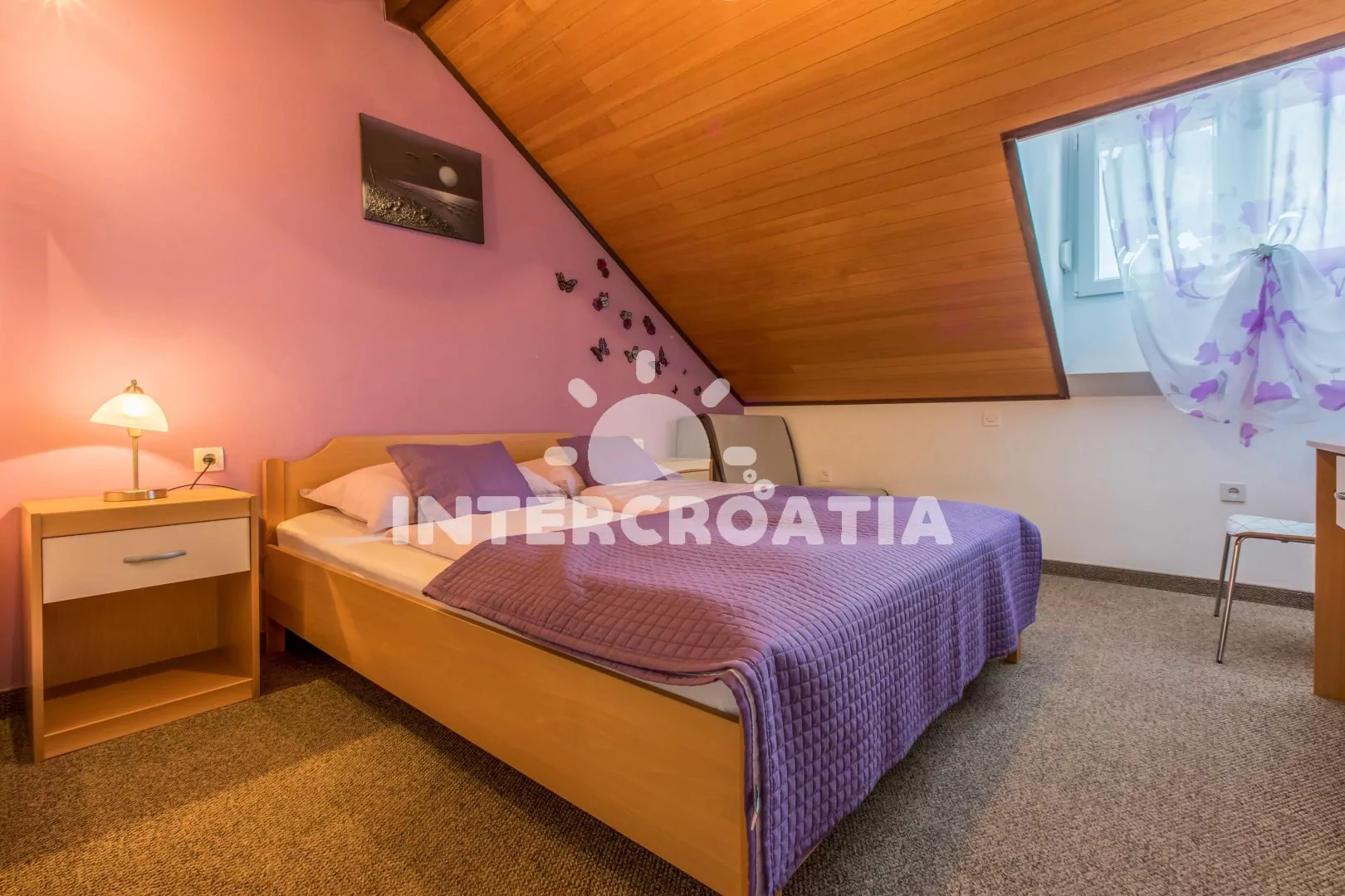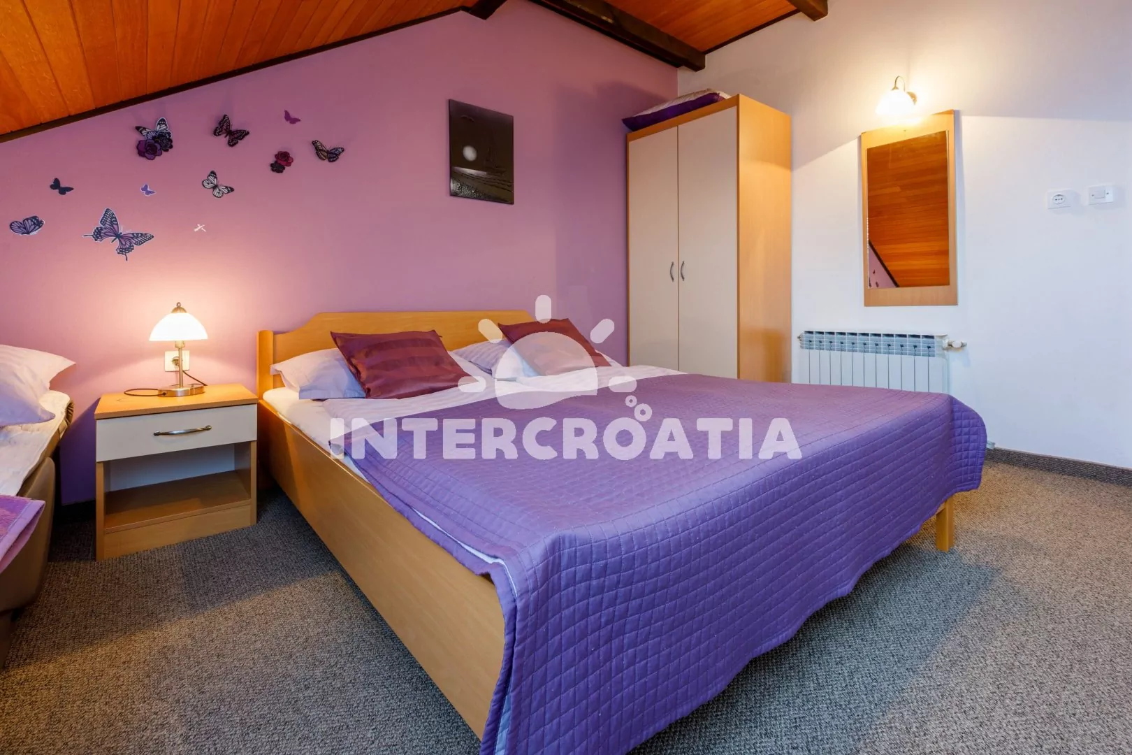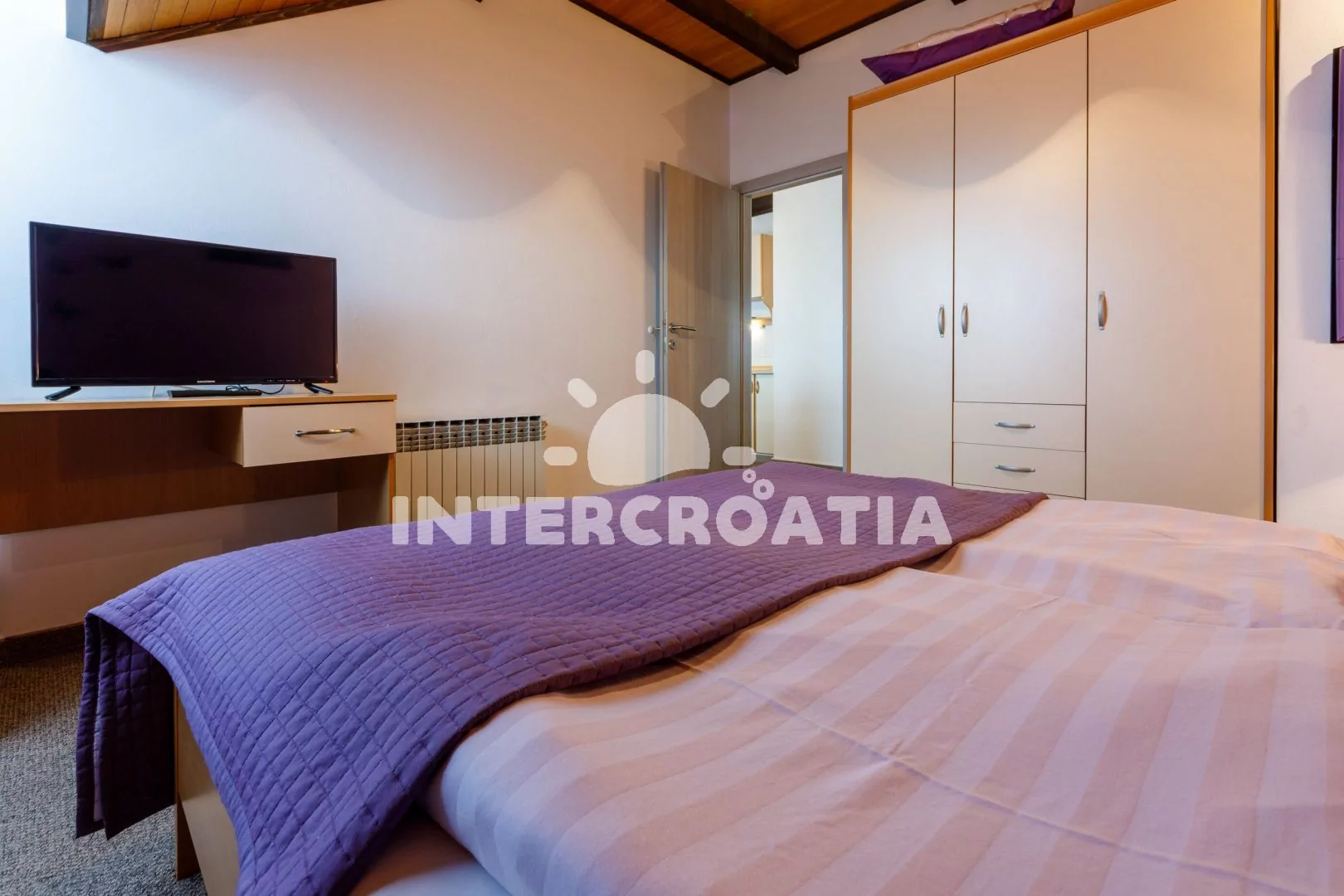 Podkrovní apartmán (55 m2) s terasou a výhledem na moře je vhodný pro 4 až 6 osob. Kuchyňská linka je vybavena varnou deskou, mikrovlnnou troubou, kávovarem, toustovačem, rychlovarnou konvicí, nádobím a lednicí s mrazákem. Dále jídelní stůl pro 4 osoby, klimatizace a vstup na terasu. První i druhá ložnice je vybavena vždy s dvoulůžkem a jednou přistýlkou. Koupelna se sprchovým koutem, umyvadlem, fénem a wc. Hostům je k dispozici parkování u objektu zdarma.