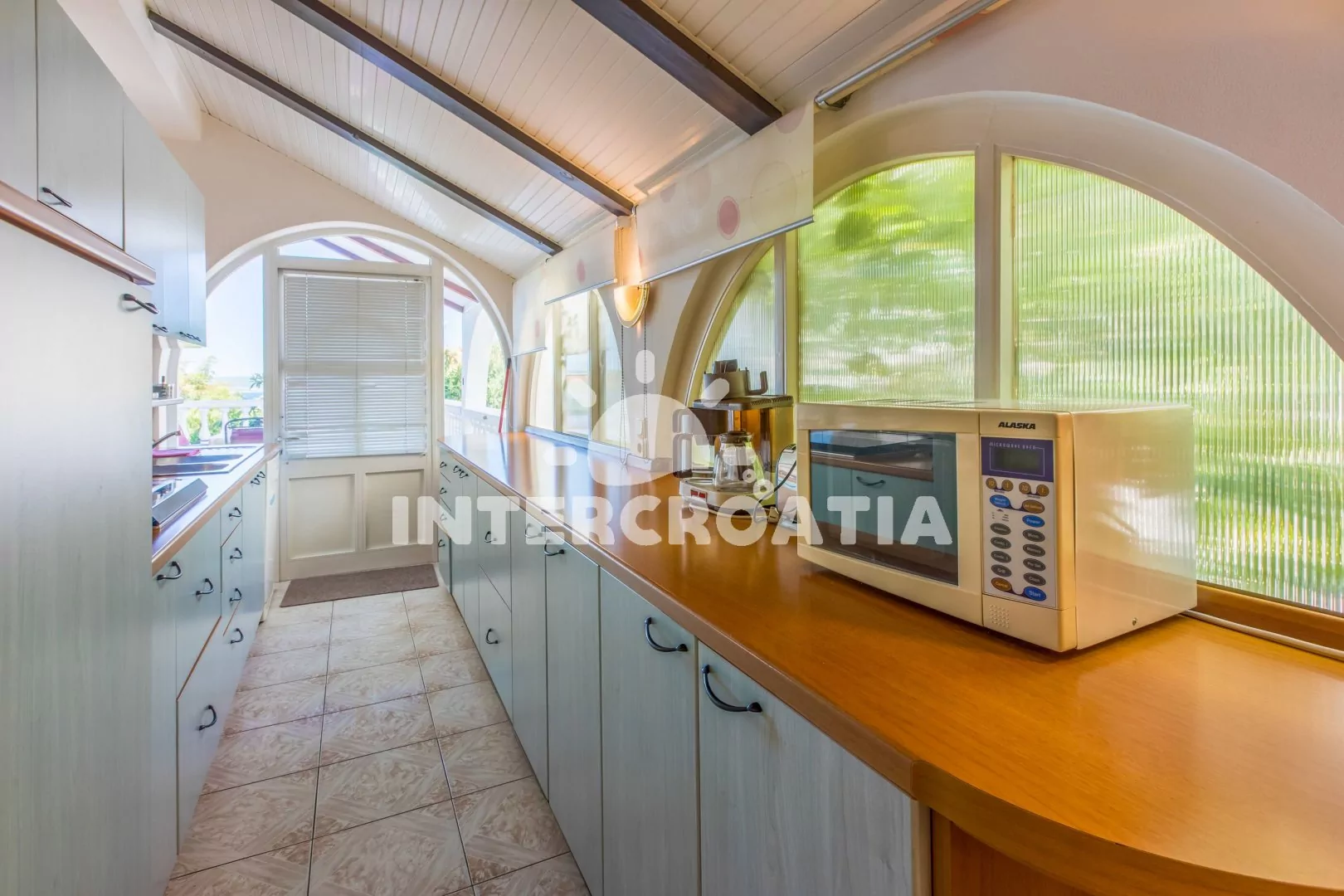 Apartmán (50 m2) s terasou a výhledem na moře se nachází v 1. patře domu a je vhodný pro až 4 osoby. Obývací pokoj je spojený s kuchyní. Kuchyňská linka je vybavena varnou deskou, myčkou na nádobí, mikrovlnnou troubou, kávovarem, toustovačem, rychlovarnou konvicí, nádobím a lednicí s mrazákem. Obývací pokoj s jídelním stolem pro 5 osob, pohovkou, dvěma přistýlkami, televizí se satelitním programem, klimatizací a vstupem na terasu. Ložnice s jedním dvoulůžkem. Koupelna se sprchovým koutem, umyvadlem a wc. Hostům je k dispozici parkování u objektu zdarma.