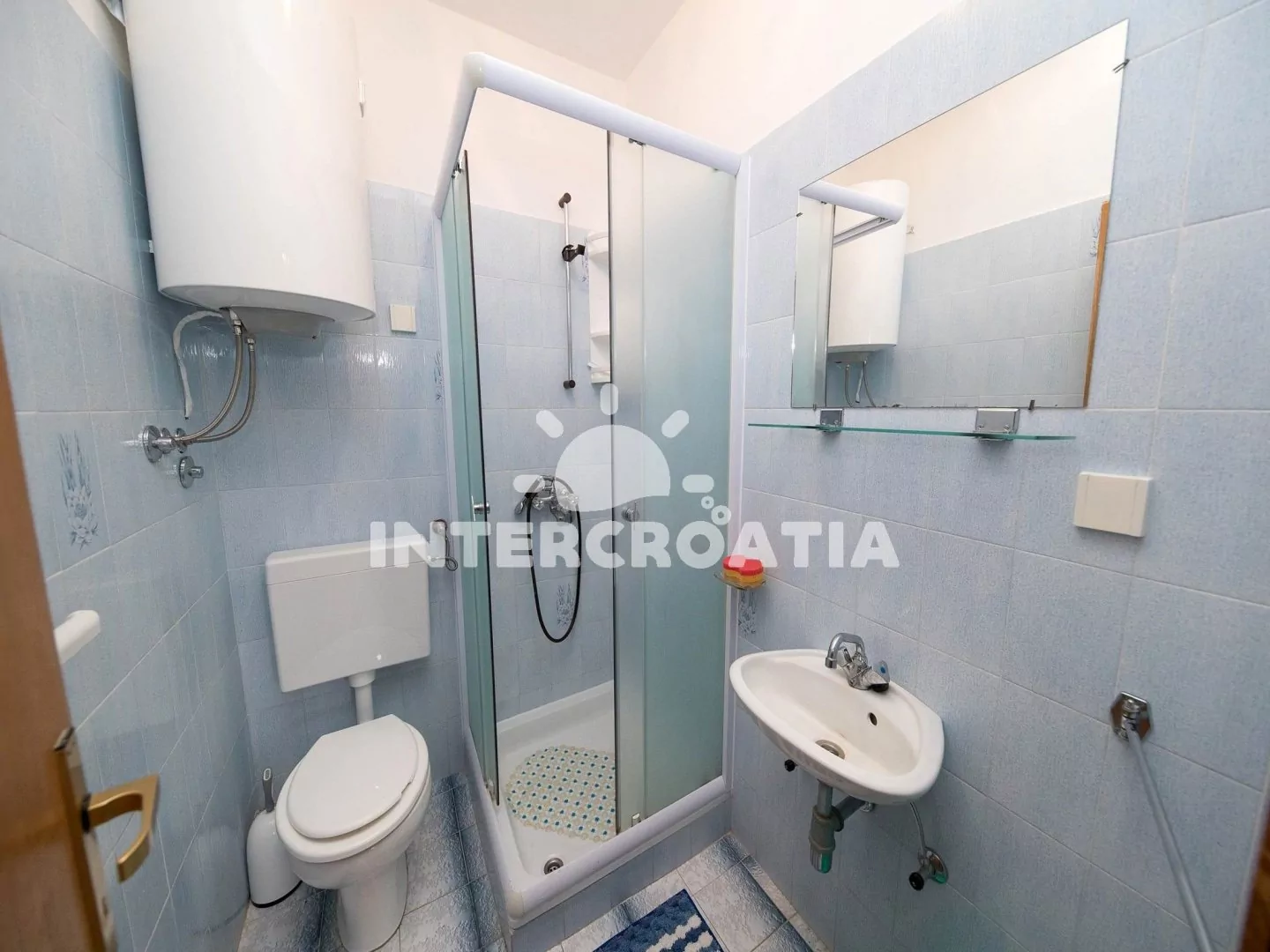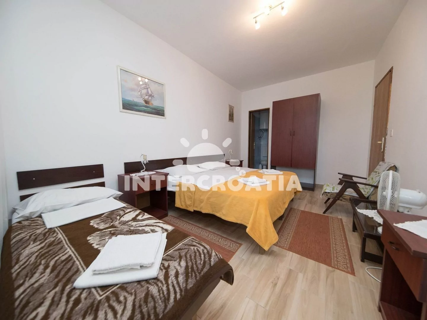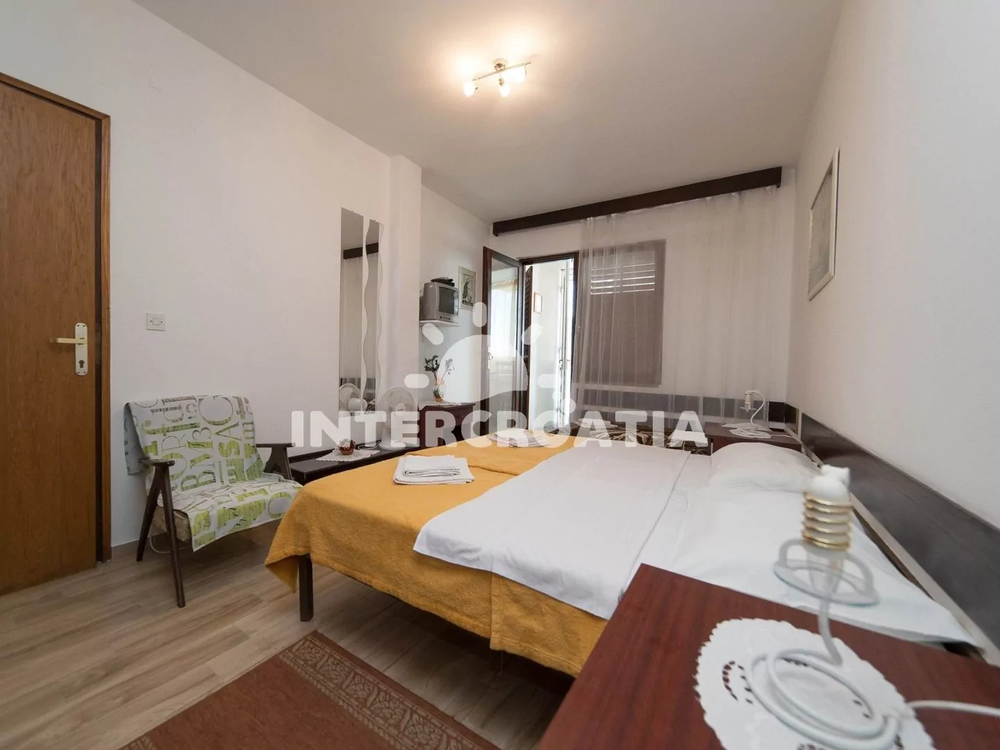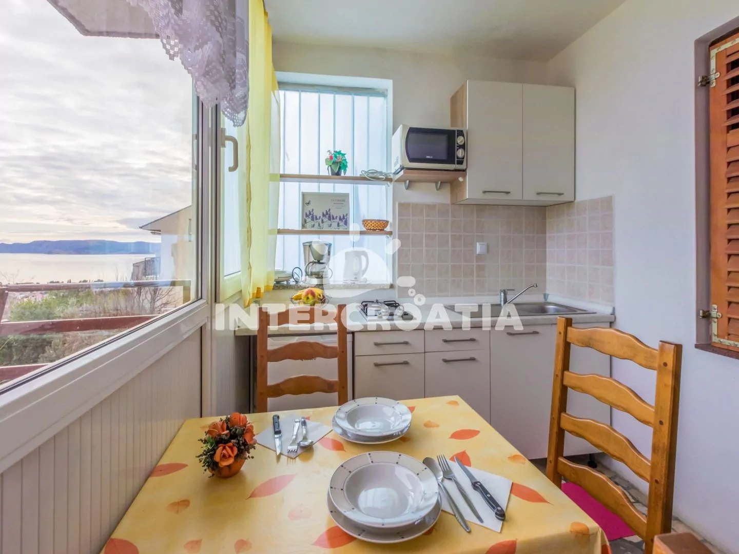 Apartmán typu studio s balkonem a bočním výhledem na moře se nachází v 1. patře a je vhodný pro 2 osoby. Kuchyňská linka je vybavena dvouplotýnkovým vařičem, mikrovlnnou troubou, kávovarem, rychlovarnou konvicí, toustovačem, nádobím a lednicí s mrazákem. Obývací místnost s jídelním stolem pro 3 osoby, televizí se satelitním programem, dvoulůžkem a vstupem na balkon. Koupelna se sprchovým koutem, umyvadlem a wc. Hostům je k dispozici parkování u objektu zdarma.