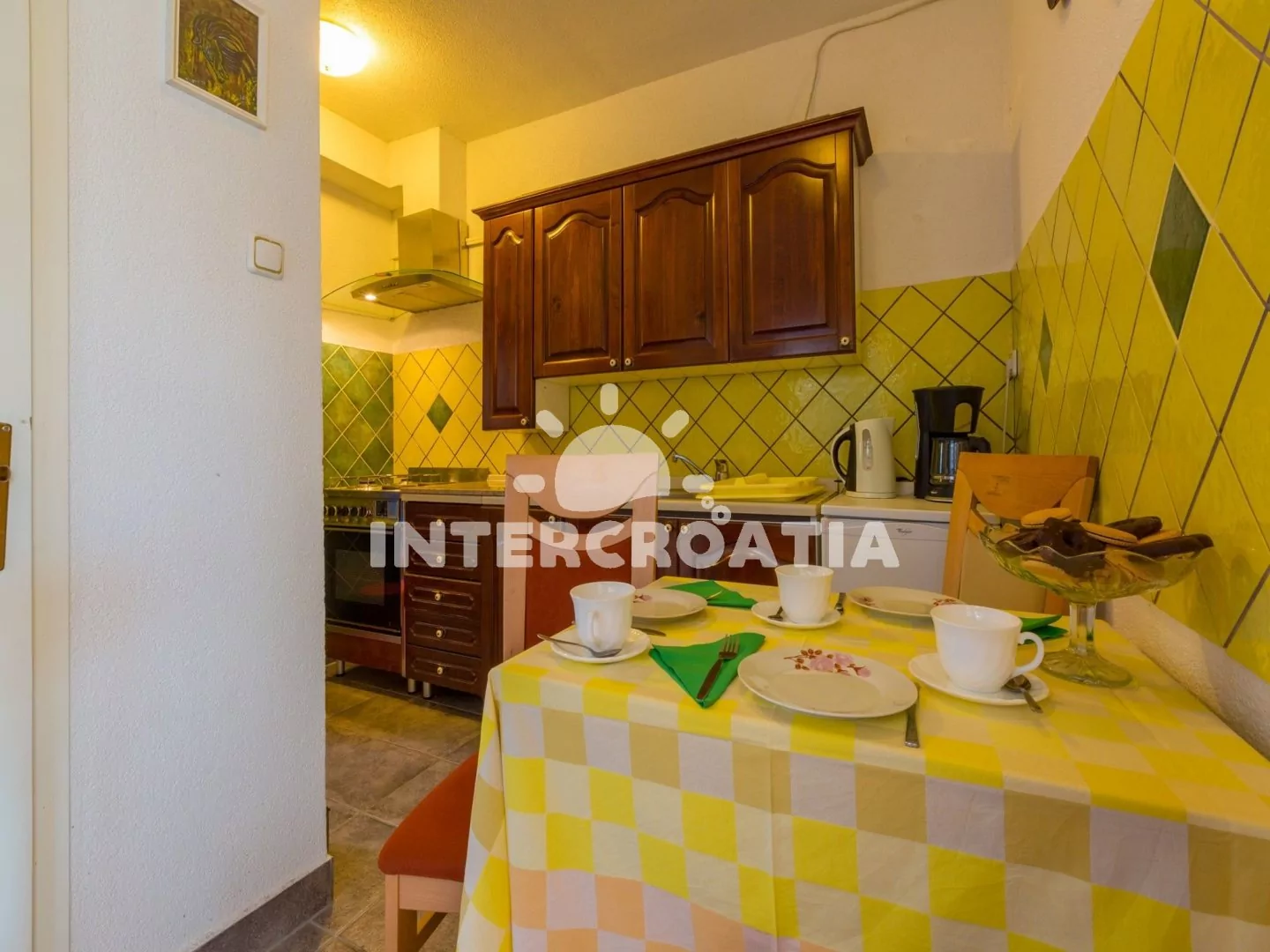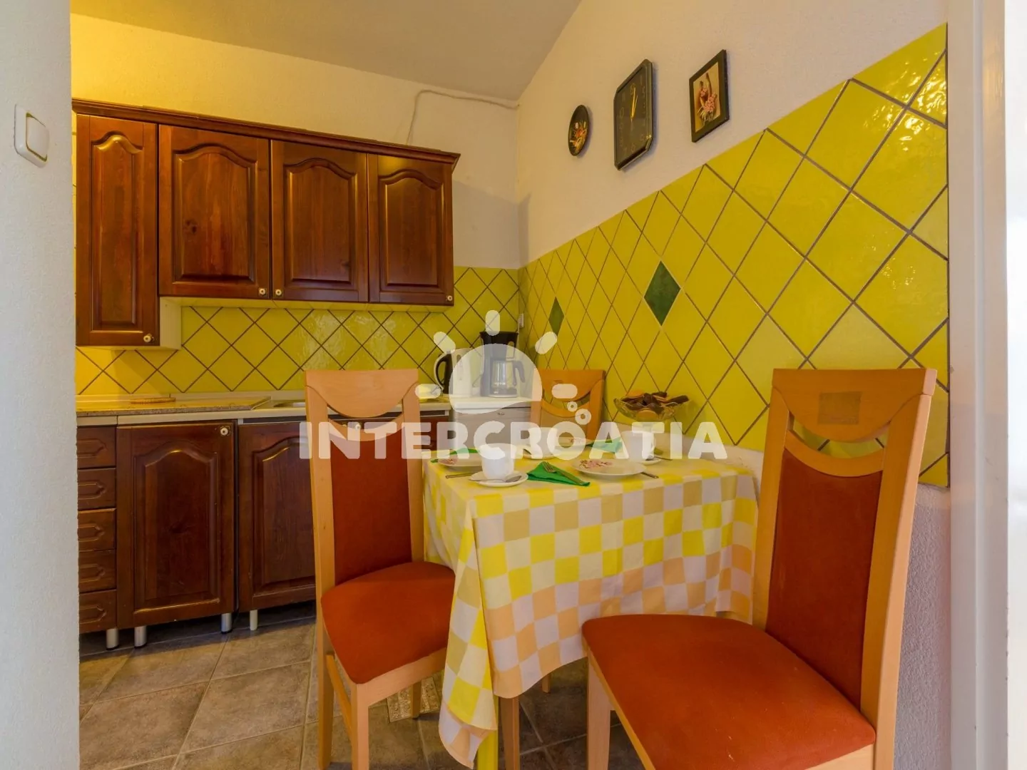 Apartmán s terasou se nachází v přízemí domu a je vhodný pro 2 až 4 osoby. Kuchyň s jídelním stolem pro 3 osoby, kuchyňskou linkou s varnou deskou, digestoří, troubou, rychlovarnou konvicí, kávovarem…