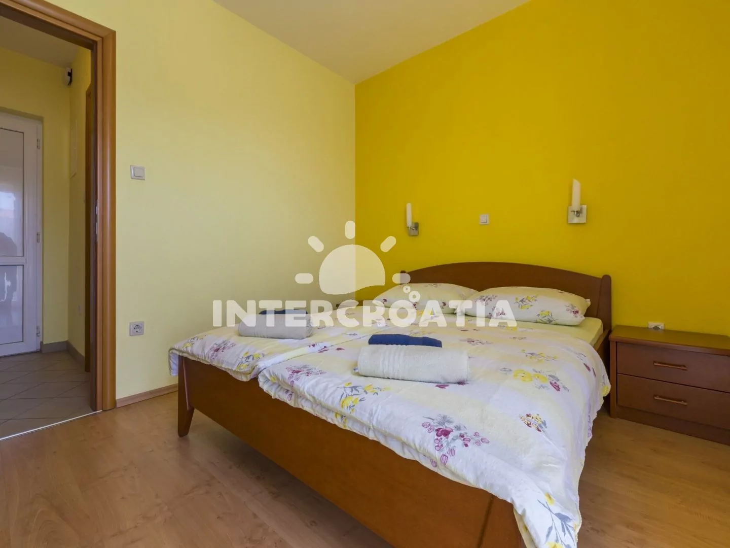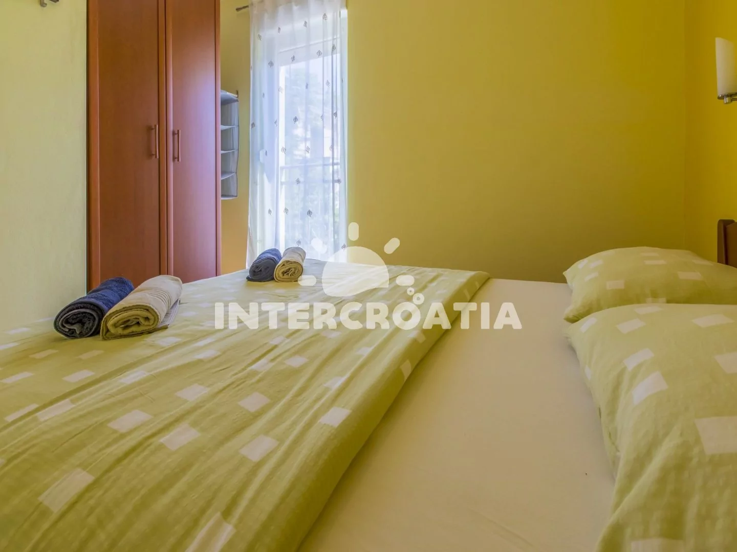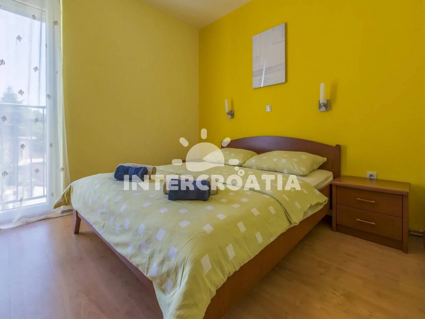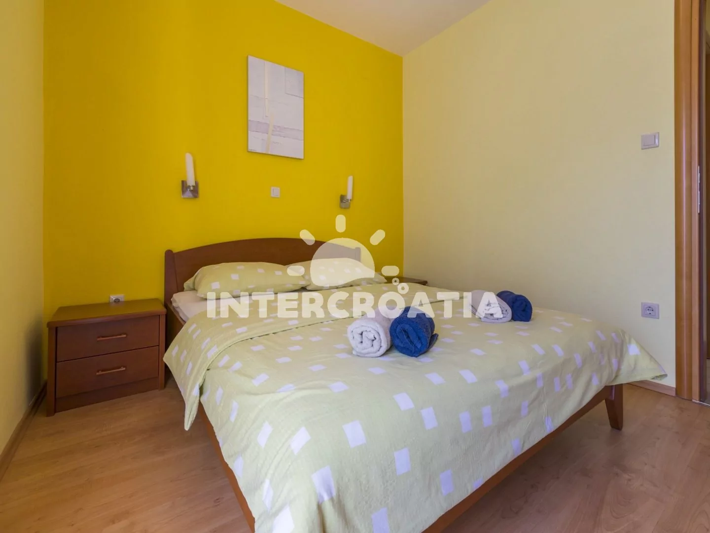 Světlý a příjemně zařízený apartmán (60 m2), s vlastní terasou a výhledem na moře. Apartmán se nachází v 1. patře domu a je vhodný pro 4 až 5 osob. Obývací pokoj je spojený s kuchyní. Kuchyňská linka je vybavena sklokeramickou varnou deskou, digestoří, rychlovarnou konvicí, kávovarem, toustovačem, nádobím a lednicí s mrazákem. Obývací pokoj s jídelním stolem pro 5 osob, pohovkou (rozložitelná na extra lůžko pro 1 osobu), televizí se satelitním programem, DVD přehrávačem, radiem, klimatizací a vstupem na terasu. První i druhá ložnice je vybavena vždy s jedním dvoulůžkem. Koupelna se sprchovým koutem, umyvadlem, fénem a wc. Hostům je k dispozici parkování v garáži zdarma.