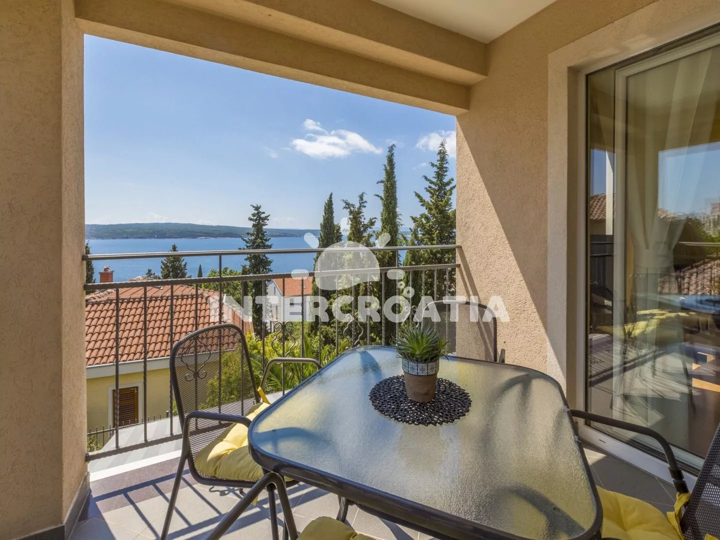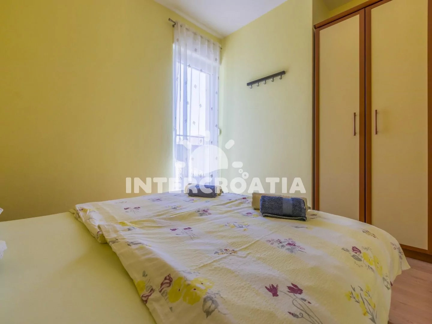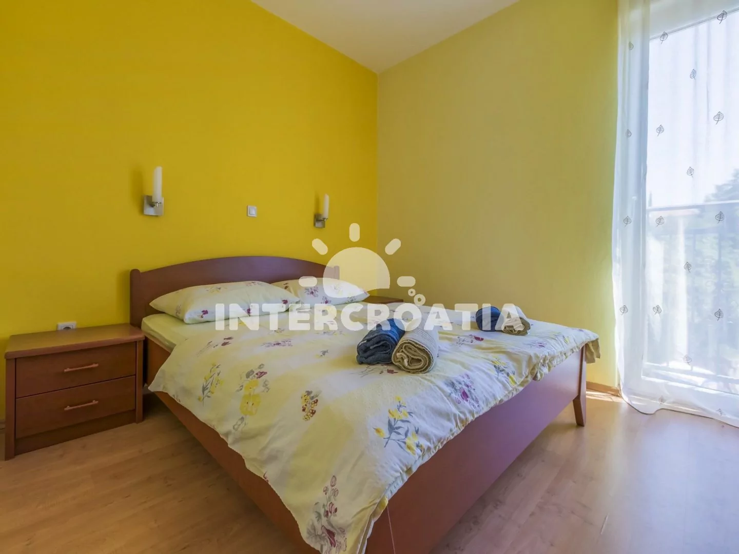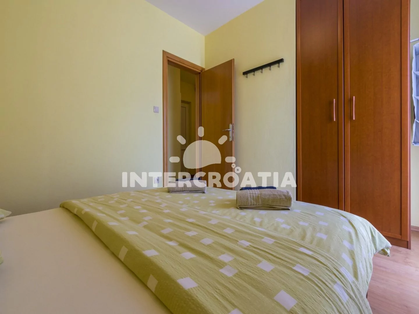 Světlý a příjemně zařízený apartmán (60 m2), s vlastní terasou a výhledem na moře. Apartmán se nachází v 1. patře domu a je vhodný pro 4 až 5 osob. Obývací pokoj je spojený s kuchyní. Kuchyňská linka je vybavena sklokeramickou varnou deskou, digestoří, rychlovarnou konvicí, kávovarem, toustovačem, nádobím a lednicí s mrazákem. Obývací pokoj s jídelním stolem pro 5 osob, pohovkou (rozložitelná na extra lůžko pro 1 osobu), televizí se satelitním programem, DVD přehrávačem, radiem, klimatizací a vstupem na terasu. První i druhá ložnice je vybavena vždy s jedním dvoulůžkem. Koupelna se sprchovým koutem, umyvadlem, fénem a wc. Hostům je k dispozici parkování v garáži zdarma.