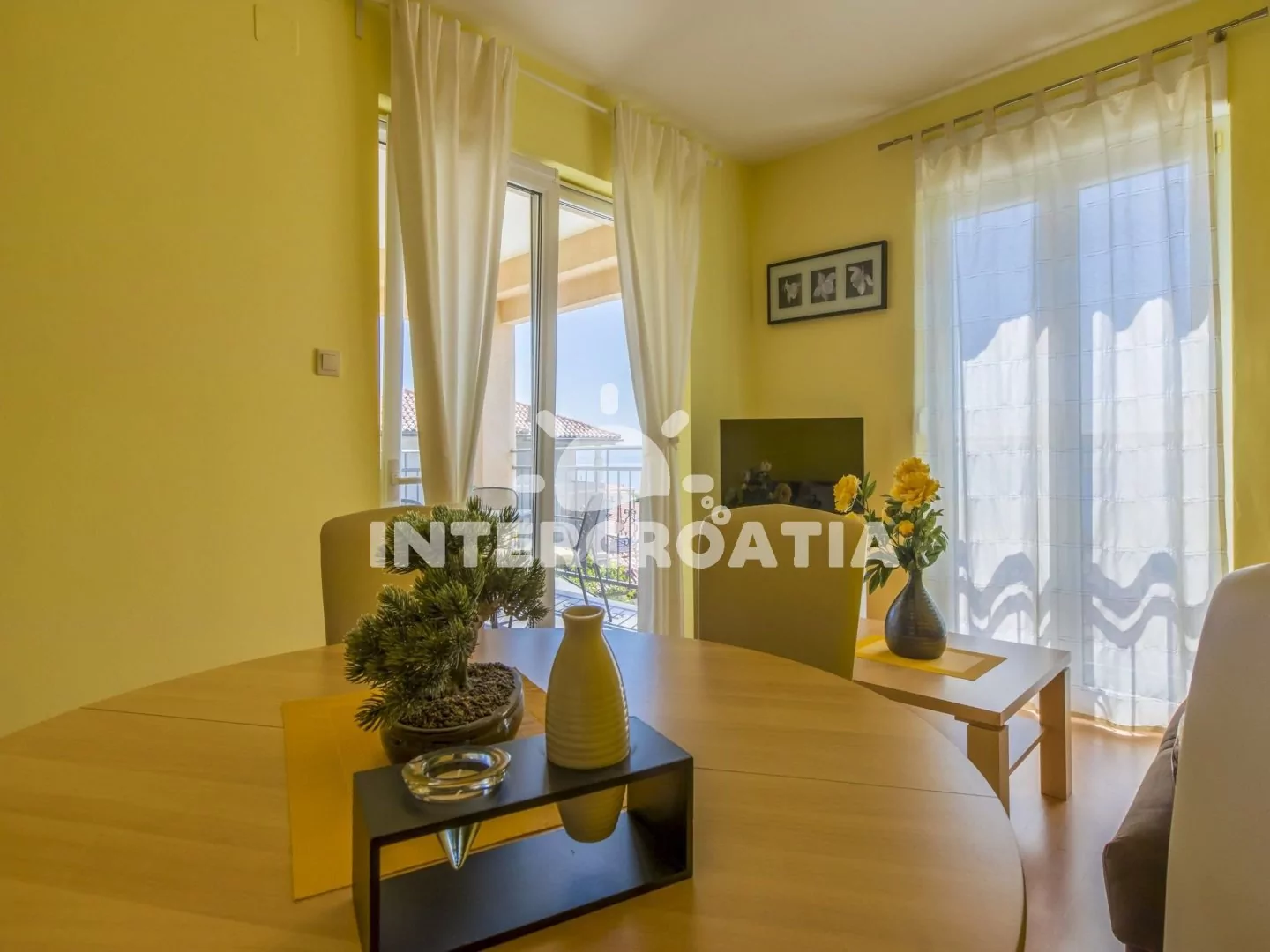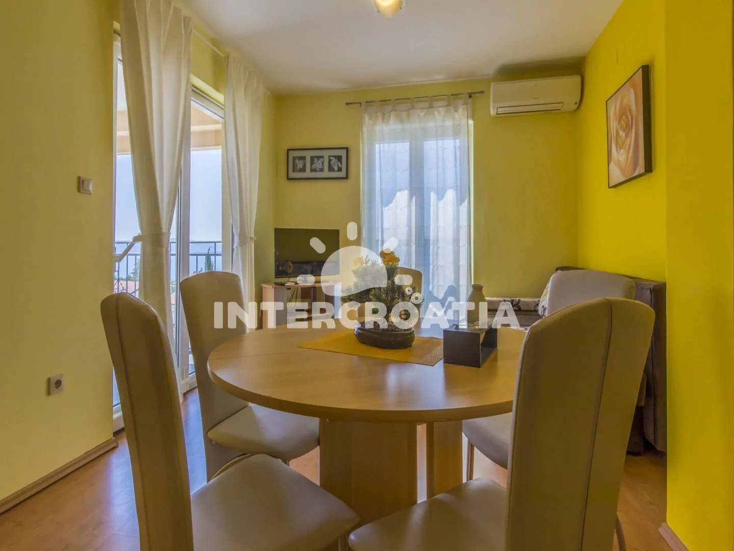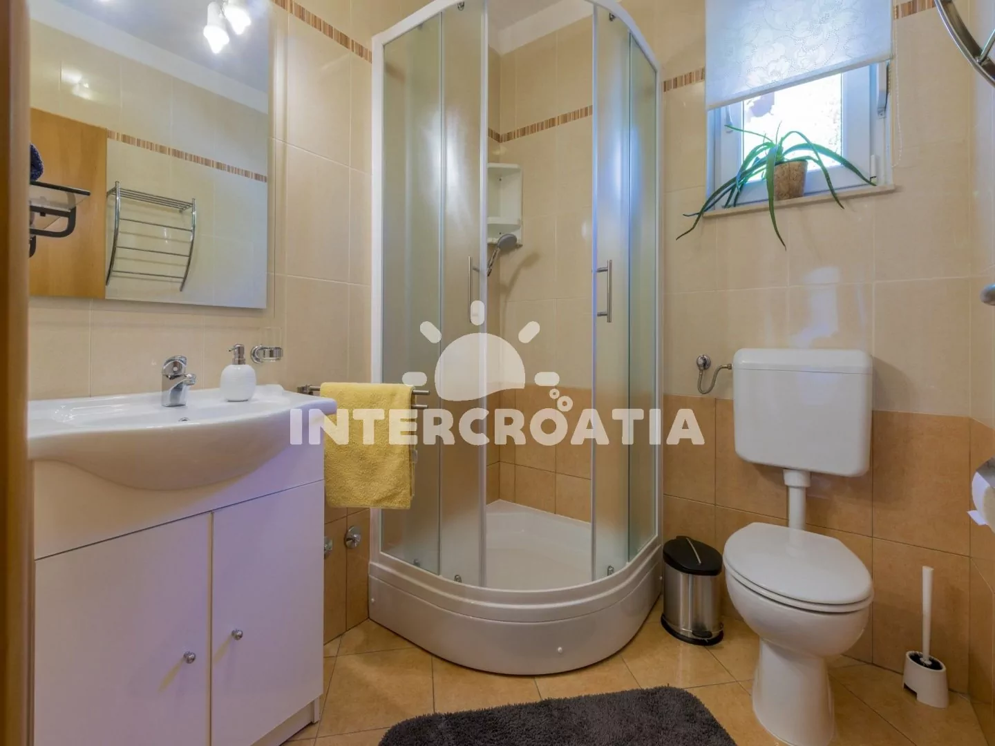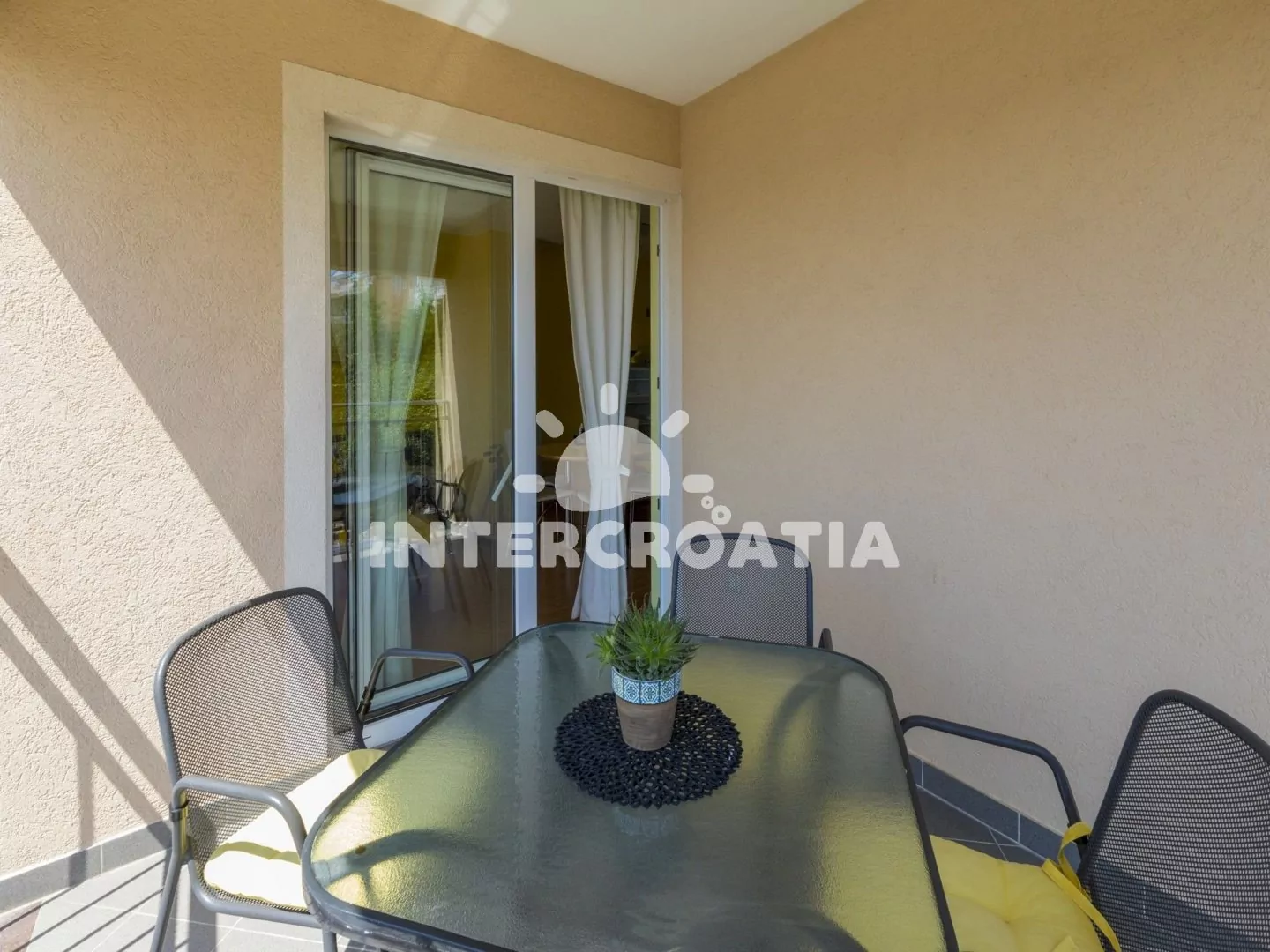 Světlý a příjemně zařízený apartmán (60 m2), s vlastní terasou a výhledem na moře. Apartmán se nachází v 1. patře domu a je vhodný pro 4 až 5 osob. Obývací pokoj je spojený s kuchyní. Kuchyňská linka je vybavena sklokeramickou varnou deskou, digestoří, rychlovarnou konvicí, kávovarem, toustovačem, nádobím a lednicí s mrazákem. Obývací pokoj s jídelním stolem pro 5 osob, pohovkou (rozložitelná na extra lůžko pro 1 osobu), televizí se satelitním programem, DVD přehrávačem, radiem, klimatizací a vstupem na terasu. První i druhá ložnice je vybavena vždy s jedním dvoulůžkem. Koupelna se sprchovým koutem, umyvadlem, fénem a wc. Hostům je k dispozici parkování v garáži zdarma.