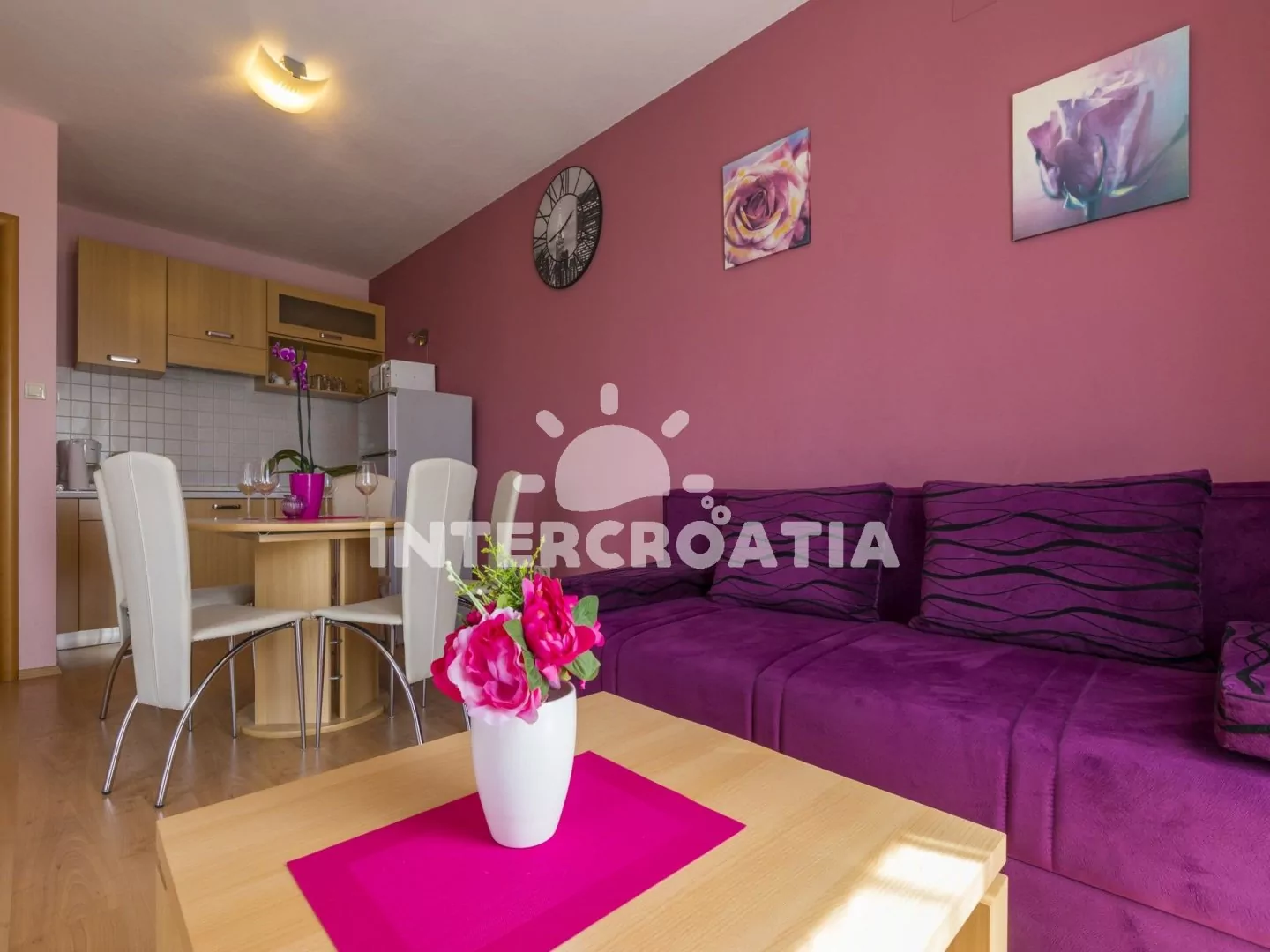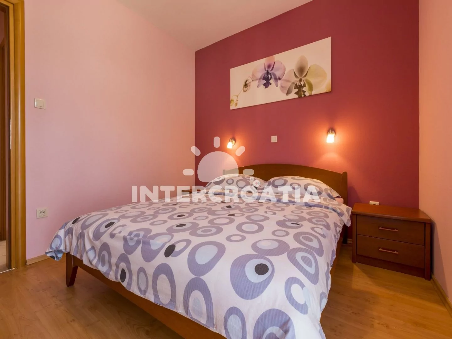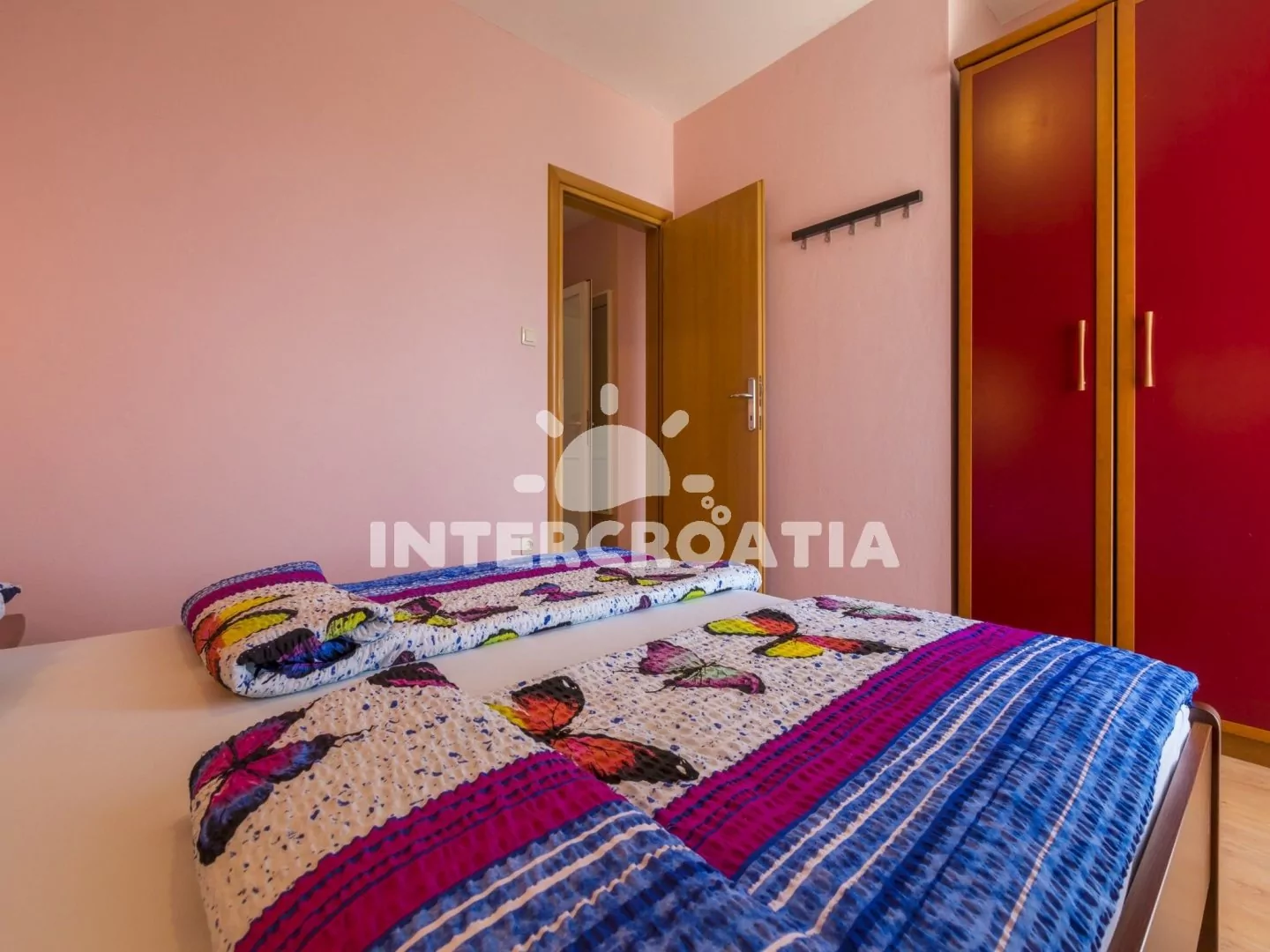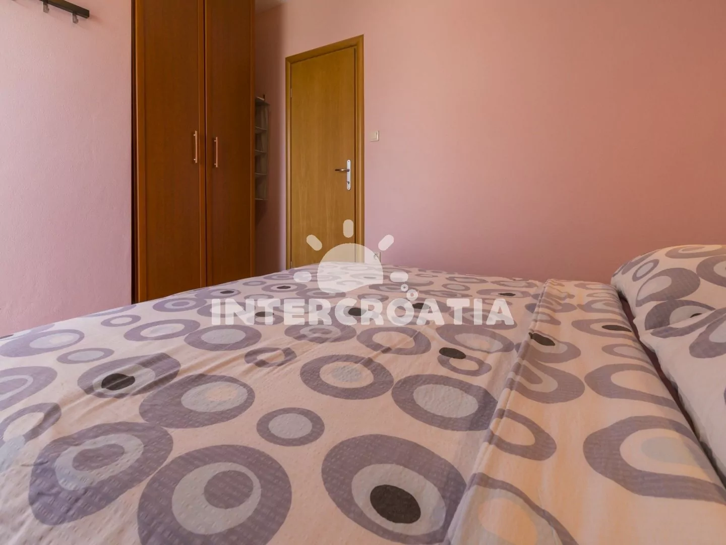 Vkusně zařízený apartmán (60 m2), s vlastní terasou a výhledem na moře. Apartmán se nachází v 1. patře domu a je vhodný pro 4 až 5 osob. Obývací pokoj je spojený s kuchyní. Kuchyňská linka je vybavena sklokeramickou varnou deskou, digestoří, rychlovarnou konvicí, kávovarem, toustovačem, nádobím a lednicí s mrazákem. Obývací pokoj s jídelním stolem pro 5 osob, pohovkou (rozložitelná na extra lůžko pro 1 osobu), televizí se satelitním programem, DVD přehrávačem, radiem, klimatizací a vstupem na terasu. První i druhá ložnice je vybavena vždy s jedním dvoulůžkem. Koupelna se sprchovým koutem, umyvadlem, fénem a wc. Hostům je k dispozici parkování v garáži zdarma.