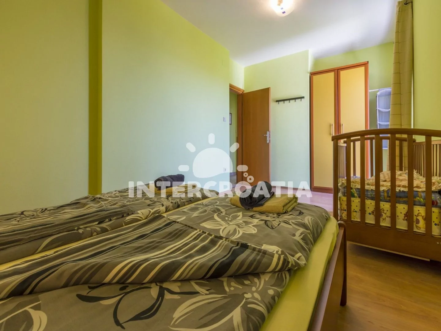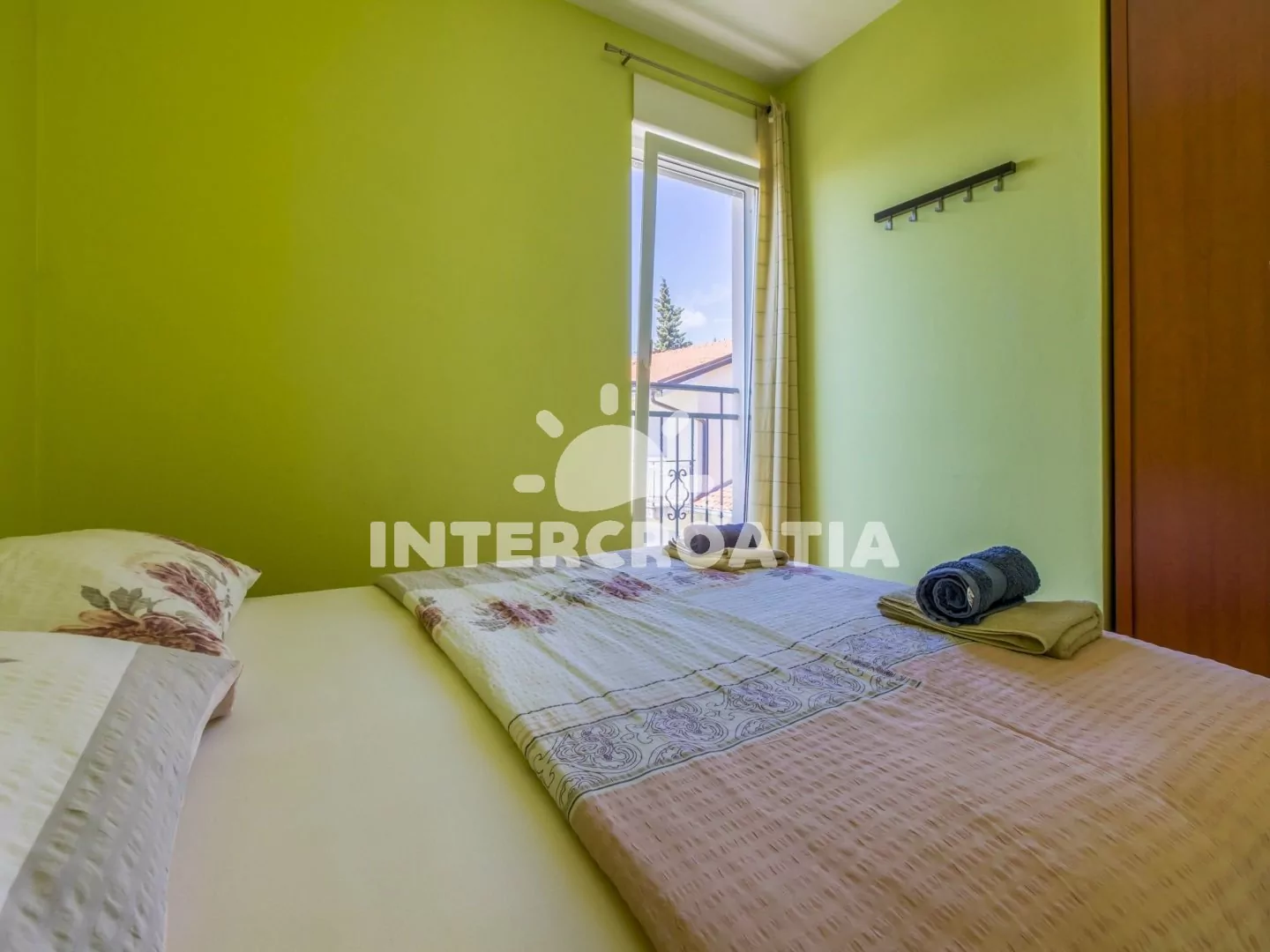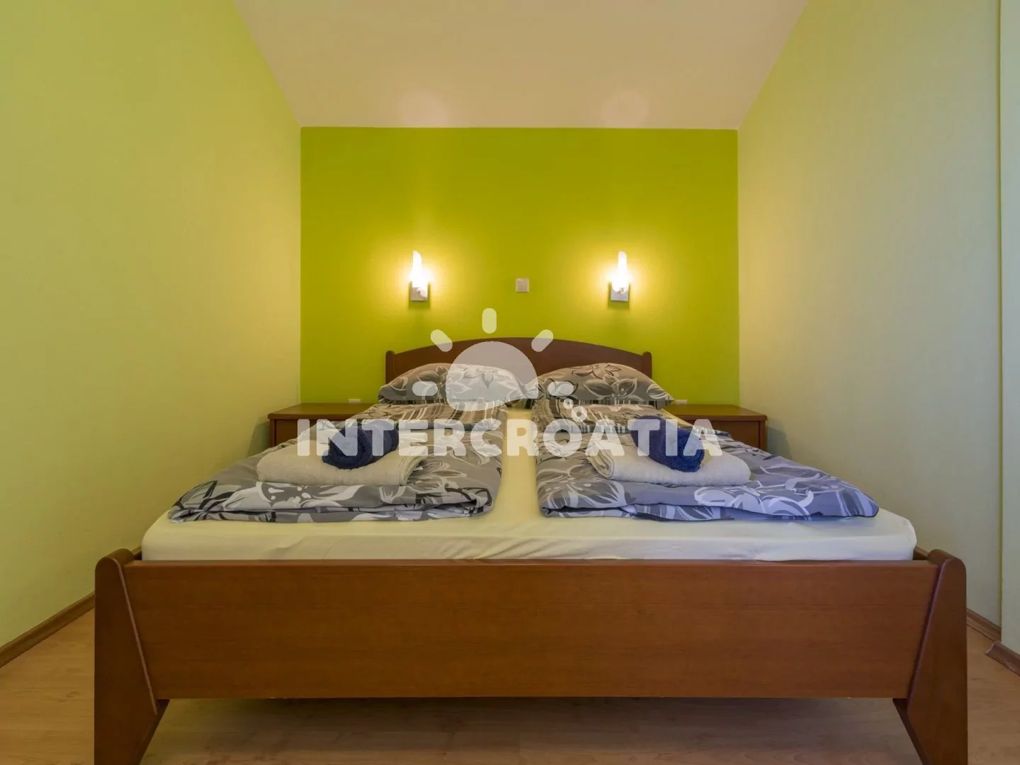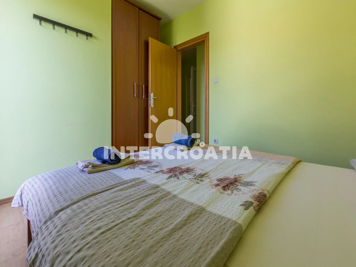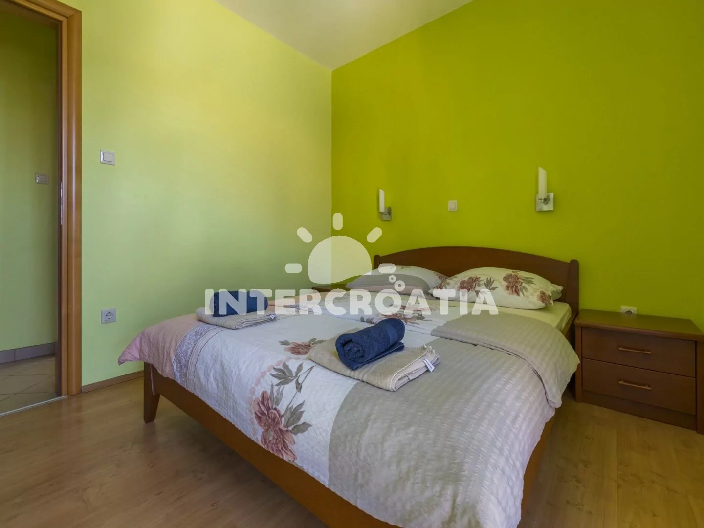 Moderně zařízený apartmán (60 m2), s vlastní terasou a výhledem na moře. Apartmán se nachází v 2. patře domu a je vhodný pro 4 až 5 osob. Obývací pokoj je spojený s kuchyní. Kuchyňská linka je vybavena sklokeramickou varnou deskou, digestoří, rychlovarnou konvicí, kávovarem, toustovačem, nádobím a lednicí s mrazákem. Obývací pokoj s jídelním stolem pro 5 osob, pohovkou (rozložitelná na extra lůžko pro 1 osobu), televizí se satelitním programem, DVD přehrávačem, radiem, klimatizací a vstupem na terasu. První i druhá ložnice je vybavena vždy s jedním dvoulůžkem. Koupelna se sprchovým koutem, umyvadlem, fénem a wc. Hostům je k dispozici parkování v garáži zdarma.