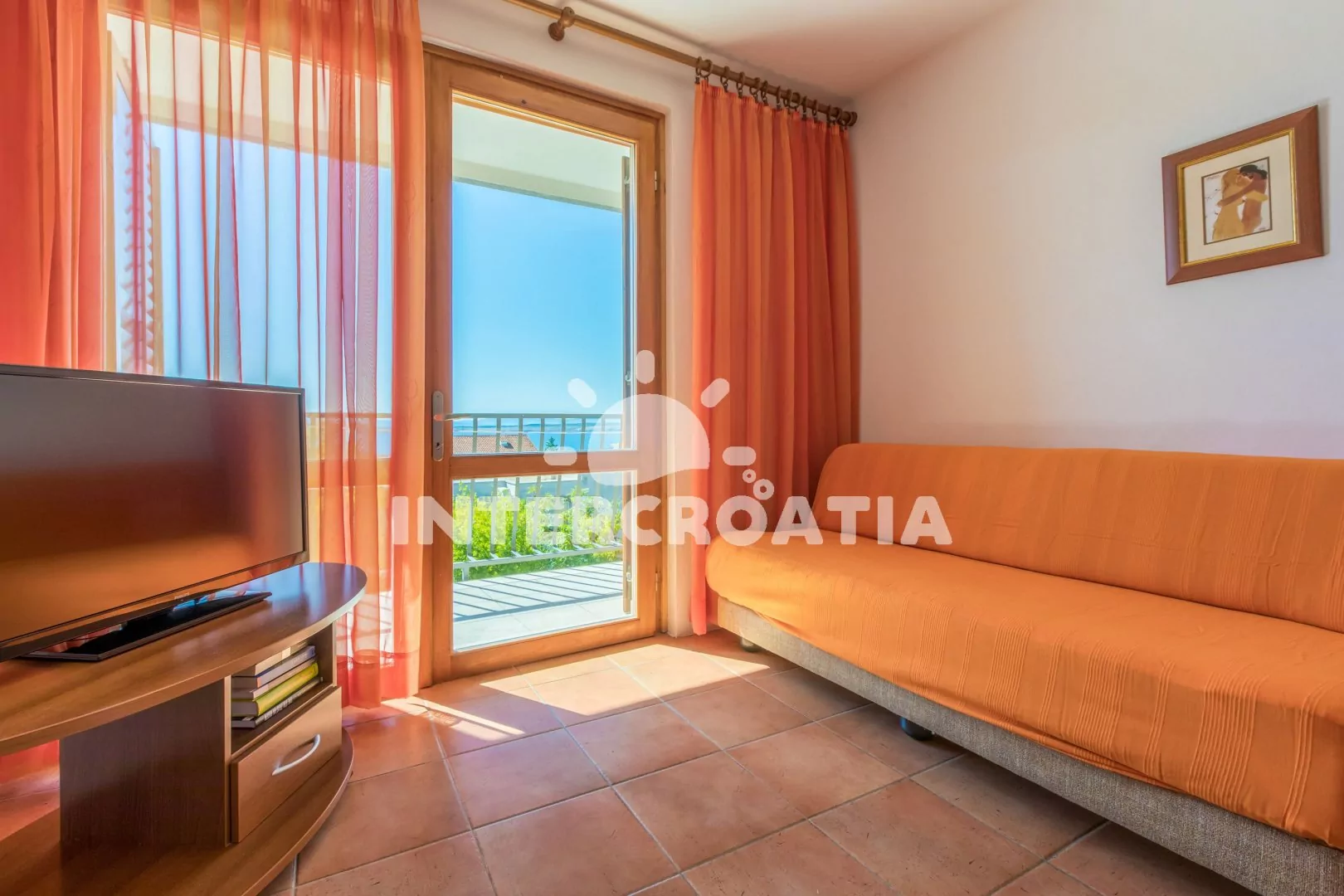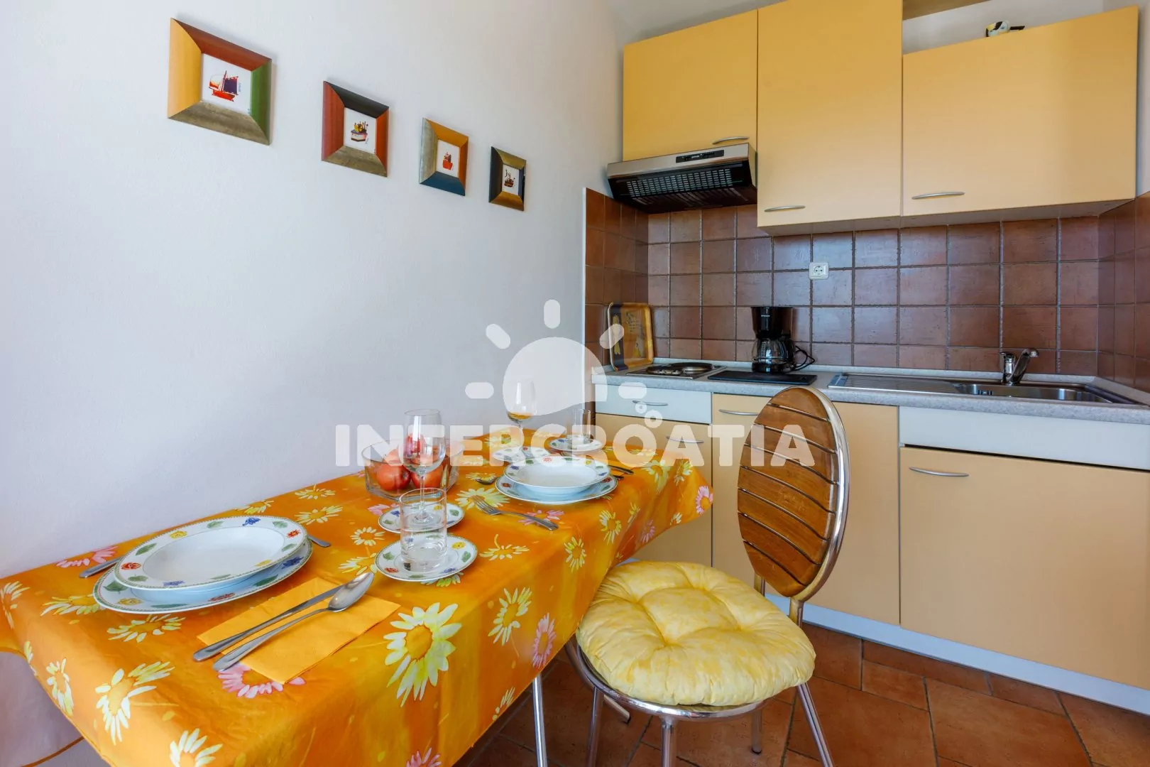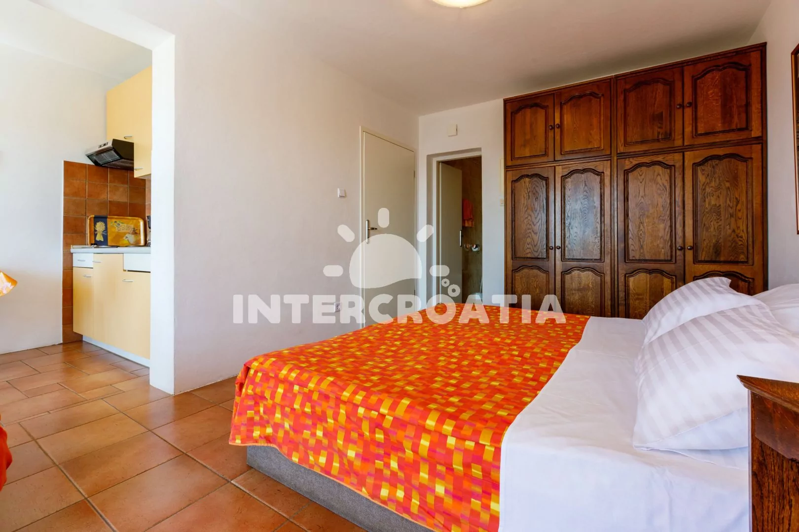 Apartmán typu studio (35 m2) s výhledem na moře, vlastním balkonem, se nachází v 2. patře domu a je vhodný pro 2 až 4 osoby. Obývací místnost je spojena s kuchyní. Kuchyňská linka je vybavena dvouplotýnkovým vařičem, digestoří, rychlovarnou konvicí, kávovarem, nádobím a lednicí s mrazákem. Obývací místnost s jídelním stolem, pohovkou (rozložitelná na extra lůžko pro 2 osoby), jedním dvoulůžkem, televizí se satelitním programem, klimatizací a vstupy na balkon. Koupelna se sprchovým koutem, umyvadlem, bidetem a wc. Hostům je k dispozici parkování u objektu zdarma.