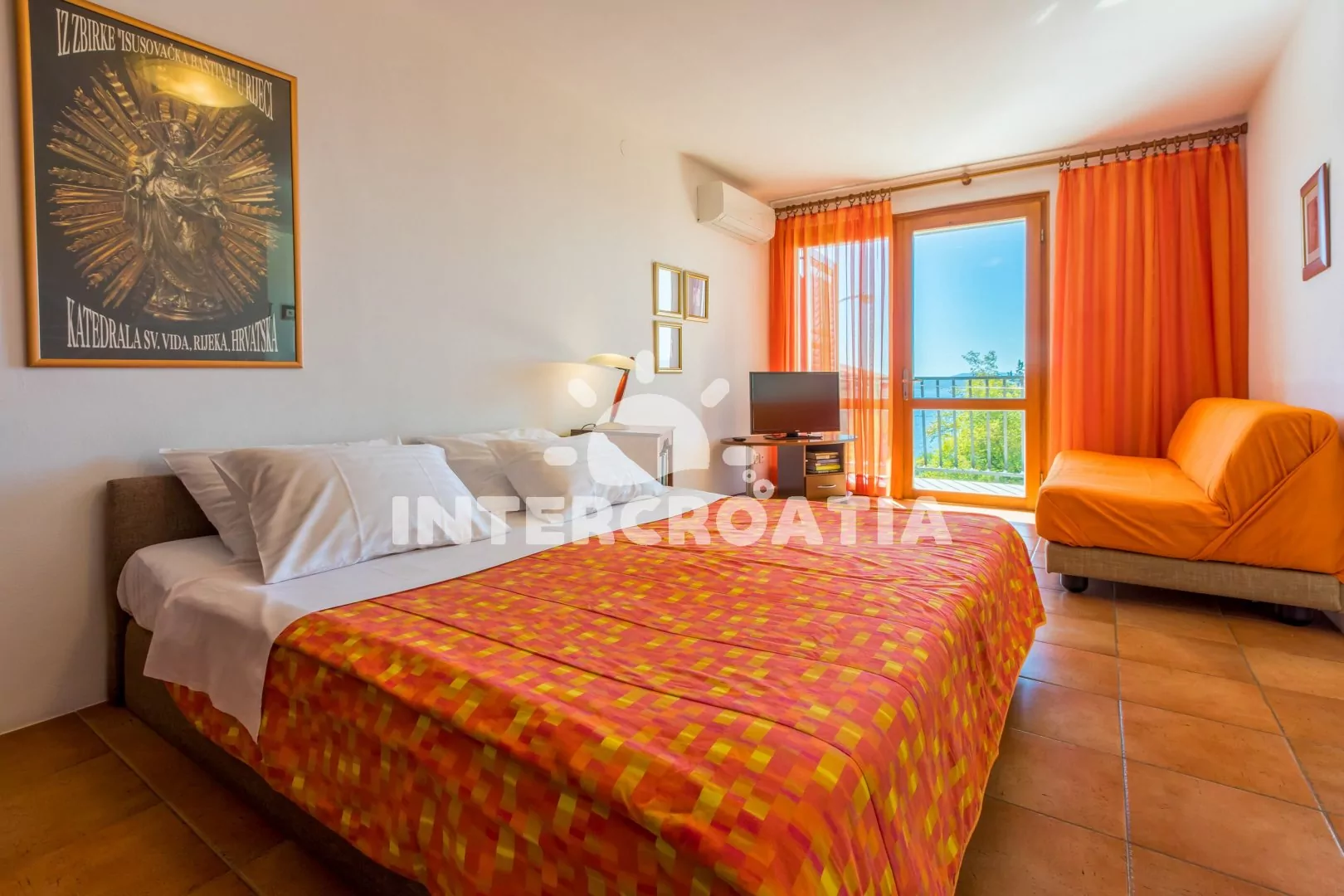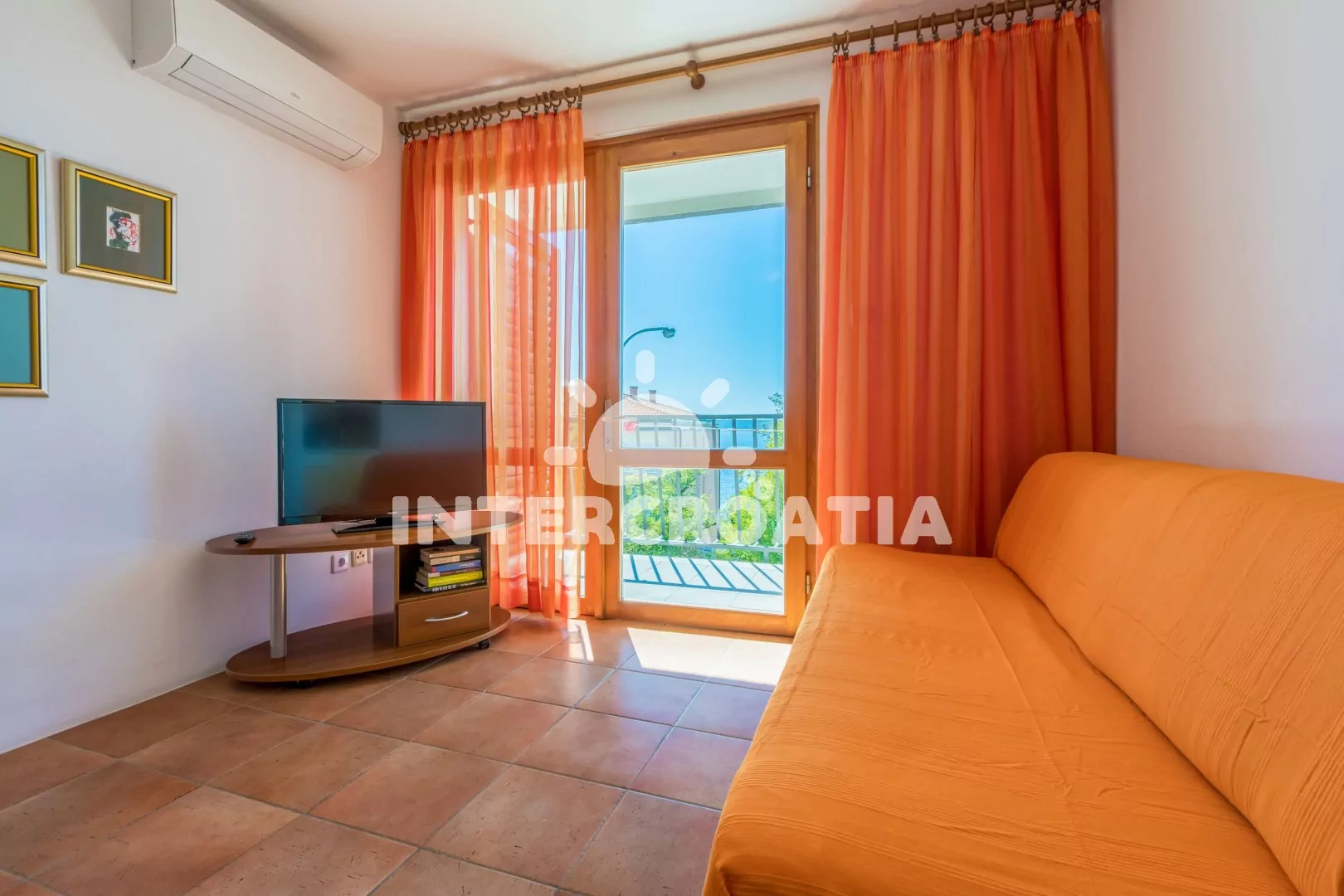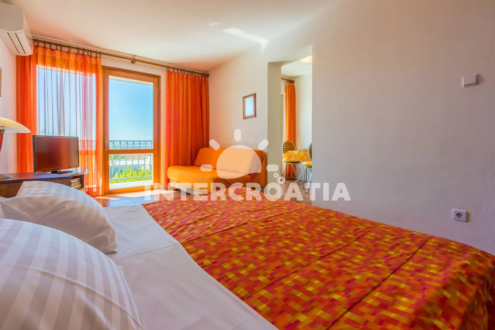 Apartmán typu studio (35 m2) s výhledem na moře, vlastním balkonem, se nachází v 2. patře domu a je vhodný pro 2 až 4 osoby. Obývací místnost je spojena s kuchyní. Kuchyňská linka je vybavena dvouplotýnkovým vařičem, digestoří, rychlovarnou konvicí, kávovarem, nádobím a lednicí s mrazákem. Obývací místnost s jídelním stolem, pohovkou (rozložitelná na extra lůžko pro 2 osoby), jedním dvoulůžkem, televizí se satelitním programem, klimatizací a vstupy na balkon. Koupelna se sprchovým koutem, umyvadlem, bidetem a wc. Hostům je k dispozici parkování u objektu zdarma.