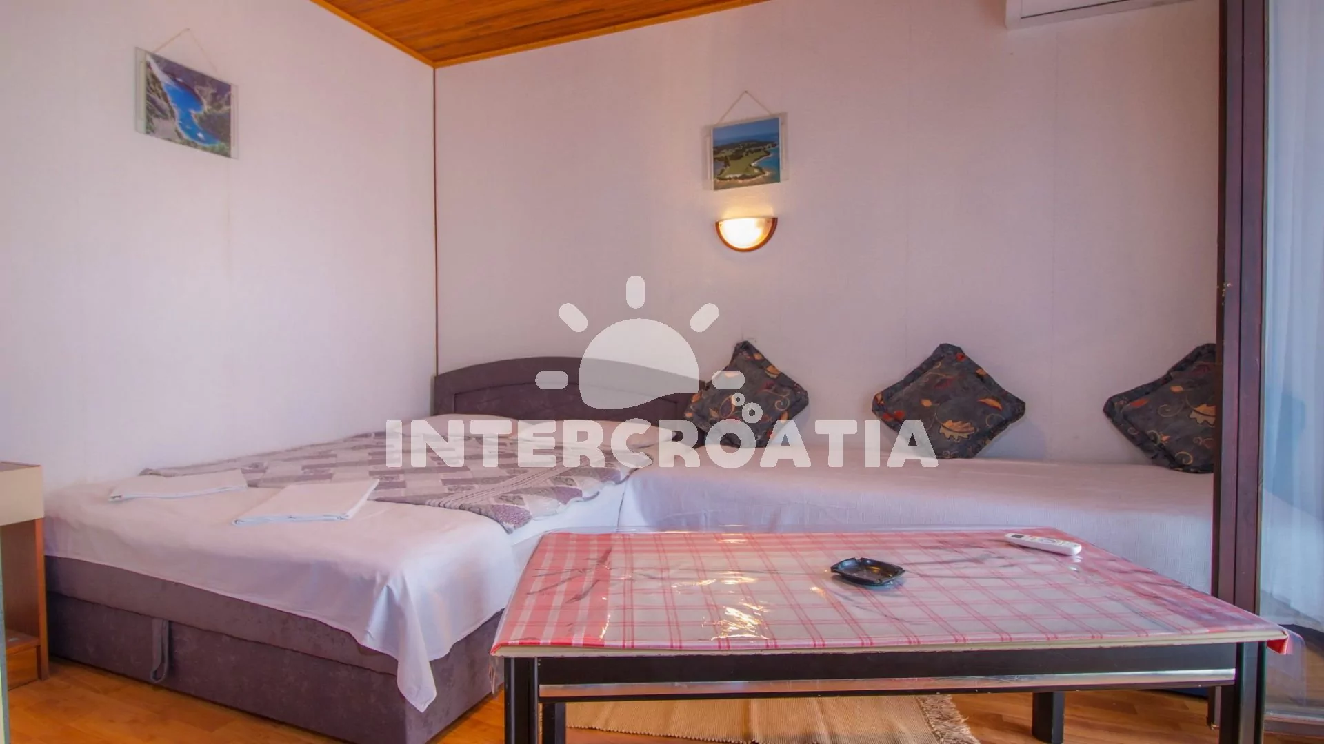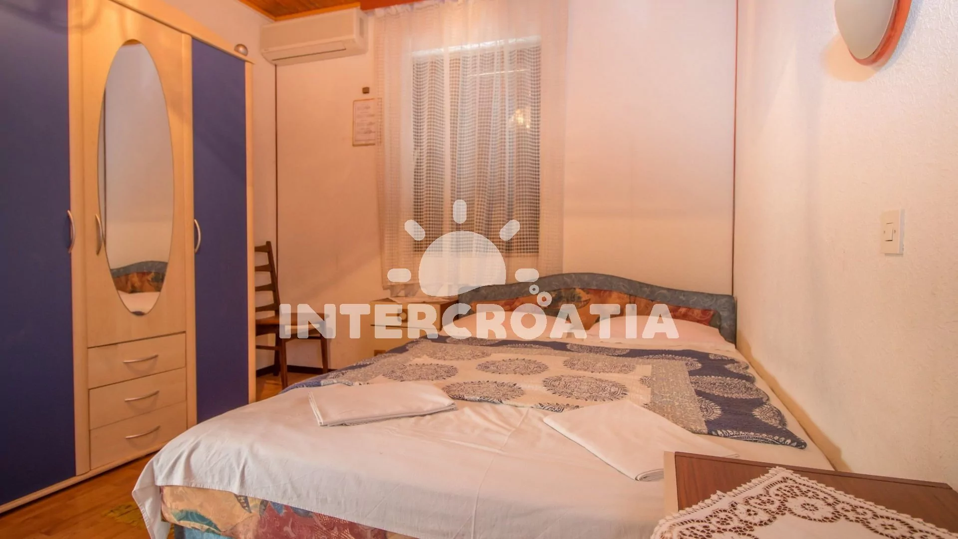 Apartmán (59 m2) s terasou se nachází v přízemí domu a je vhodný pro 2 až 4 osoby. Obývací pokoj je spojený s kuchyní. Kuchyňská linka je vybavena varnou deskou, troubou, rychlovarnou konvicí, mikrovlnnou troubou, kávovarem, nádobím a lednicí s mrazákem. Obývací pokoj s jídelním stolem pro 4 osoby, pohovkou, televizí se satelitním programem, klimatizací a dvěma přistýlkami. Ložnice s jedním dvoulůžkem. Koupelna s vanou, sprchovou zástěnou, umyvadlem a wc. Hostům je k dispozici parkování u objektu zdarma.