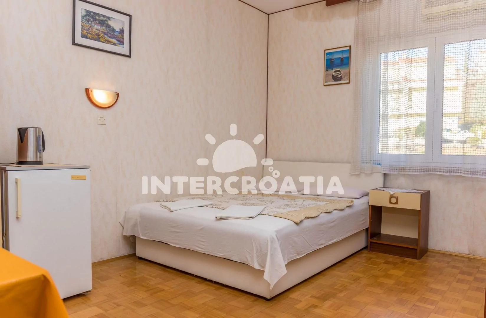 Apartmán (15 m2) typu studio, se nachází v 2. patře domu a je vhodný pro 2 osoby. Obývací místnost je spojena s kuchyní. Kuchyňská linka je vybavena dvouplotýnkovým vařičem, rychlovarnou konvicí, nádobím a lednicí s mrazákem. Obývací místnost s jídelním stolem pro 2 osoby, jedním dvoulůžkem, televizí se satelitním programem a klimatizací. Koupelna se sprchovým koutem a wc. Hostům je k dispozici parkování u objektu zdarma.