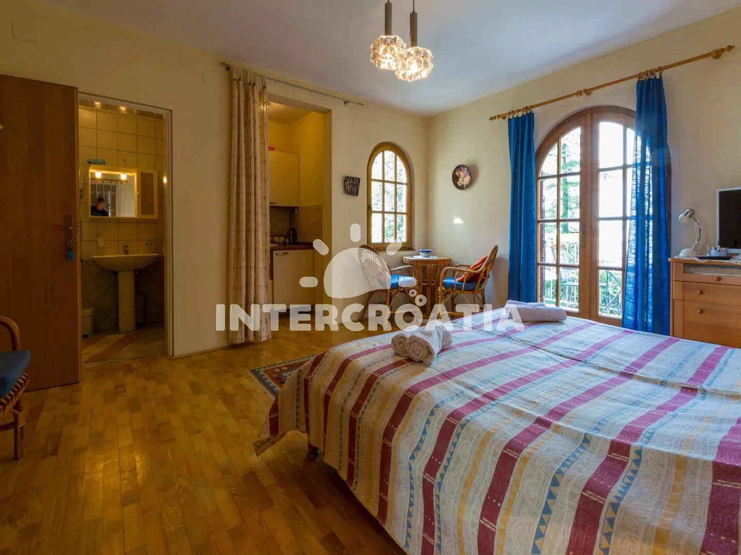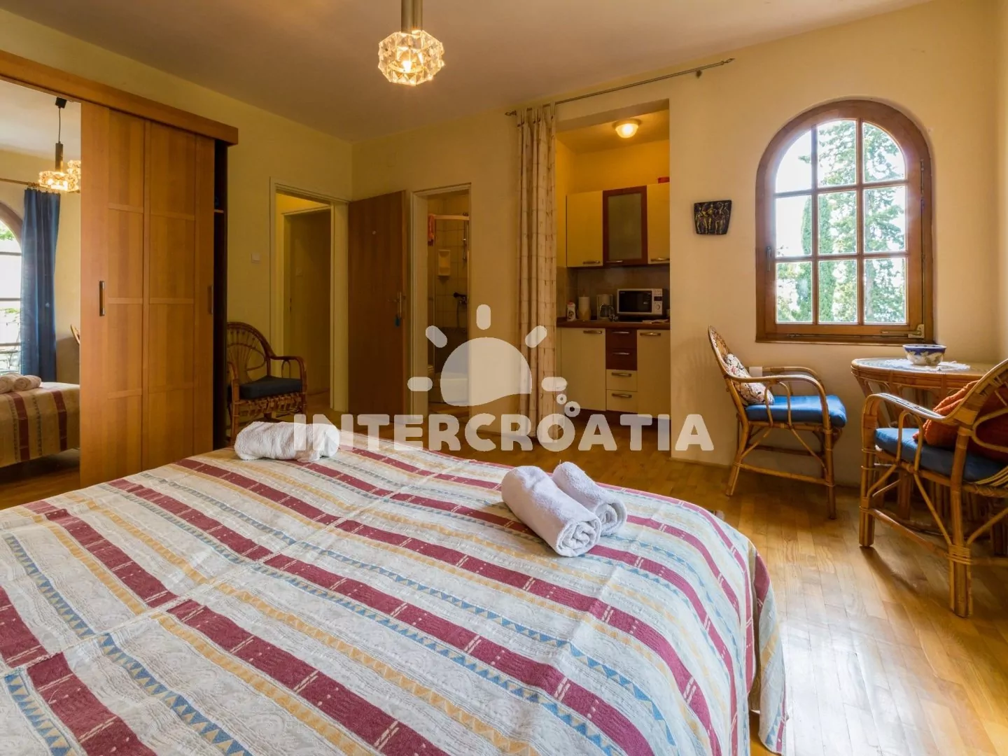 Apartmán typu studio (30 m2) s balkonem, částečným výhledem na moře a do zahrady, se nachází v 1. patře vily a je vhodný pro 2 osoby. Obývací místnost je spojena s kuchyní. Kuchyňská linka je vybavena dvouplotýnkovým vařičem, mikrovlnnou troubou, rychlovarnou konvicí, kávovarem, toustovačem, nádobím a lednicí s mrazákem. Obývací místnost s televizí se satelitním programem, jedním dvoulůžkem, klimatizací a vstupem na balkon. Koupelna se sprchovým koutem, umyvadlem, fénem a wc. Hostům je k dispozici parkování u objektu zdarma.