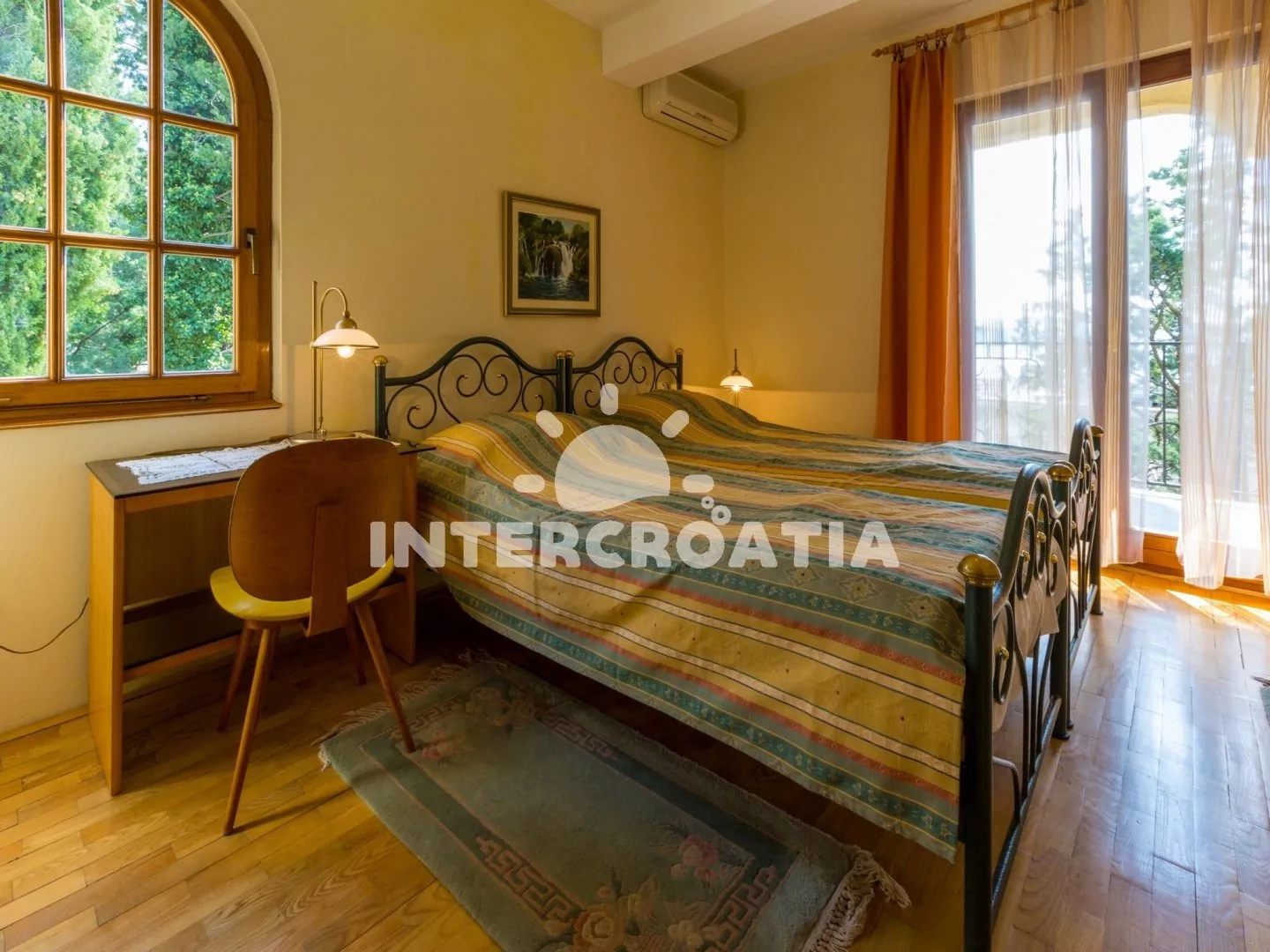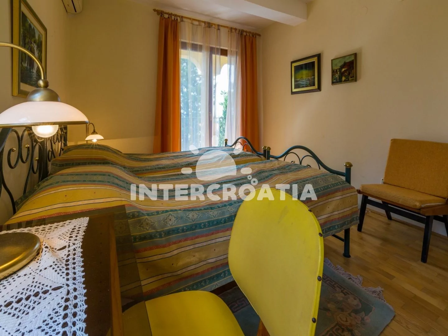 Apartmán (45 m2) s balkonem, částečným výhledem na moře a do zahrady, se nachází v 1. patře vily a je vhodný pro 2 až 4 osoby. Obývací pokoj je spojený s kuchyní. Kuchyňská linka je vybavena varnou deskou, digestoří, mikrovlnnou troubou, rychlovarnou konvicí, kávovarem, toustovačem, nádobím a lednicí s mrazákem. Obývací pokoj s jídelním stolem pro 4 osoby, dvěma pohovkami (rozložitelné na extra lůžko pro 2 osoby), televizí se satelitním programem, klimatizací a vstupem na balkon. Ložnice s dvoulůžkem, klimatizací a vstupem na balkon. Koupelna se sprchovým koutem, umyvadlem, fénem a wc. Hostům je k dispozici parkování u objektu zdarma.