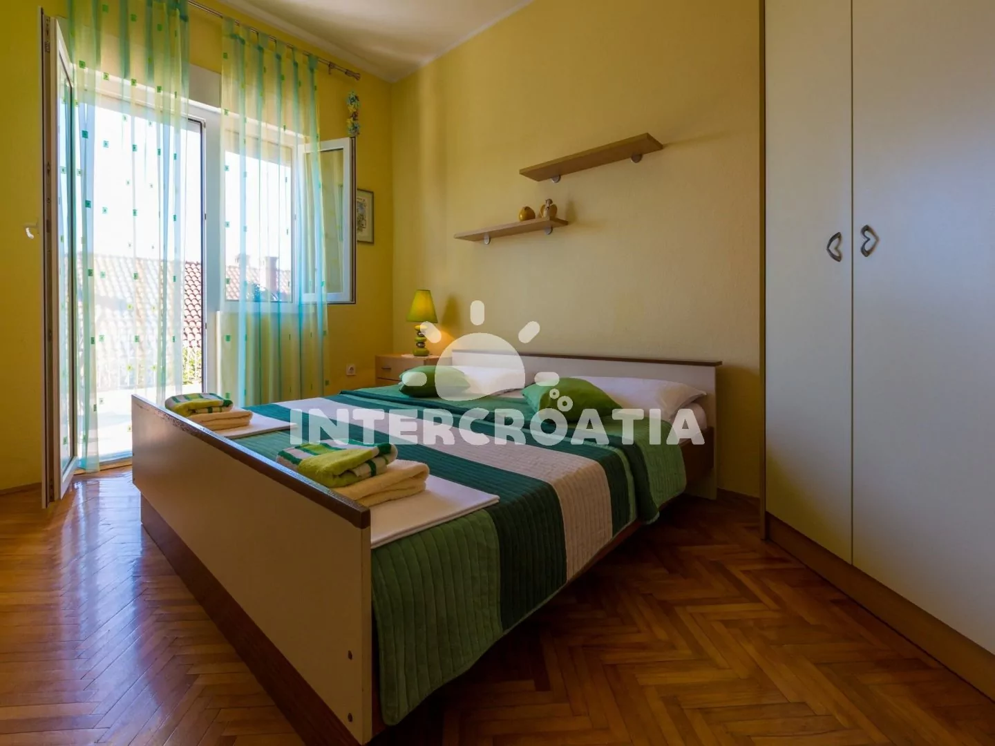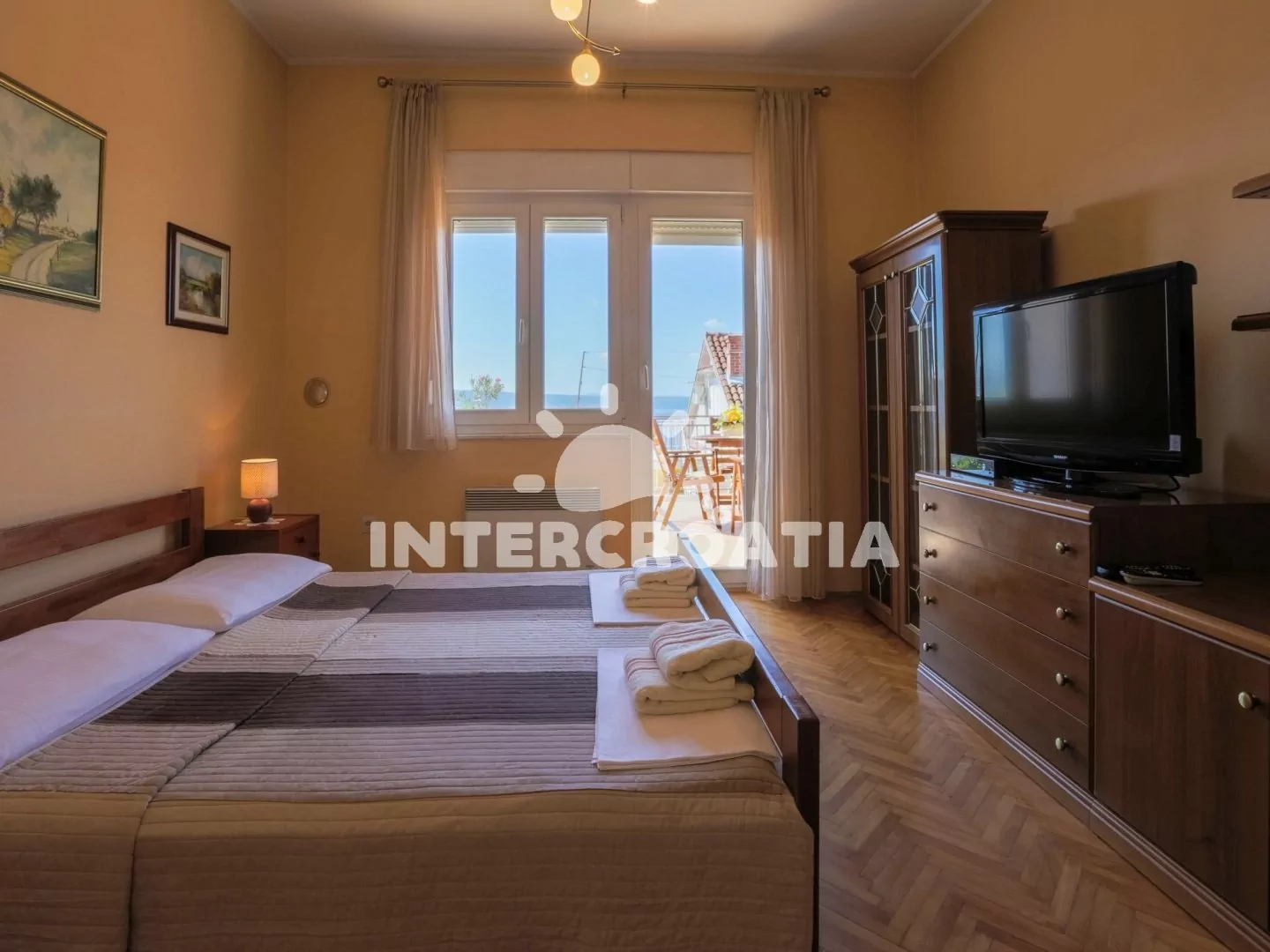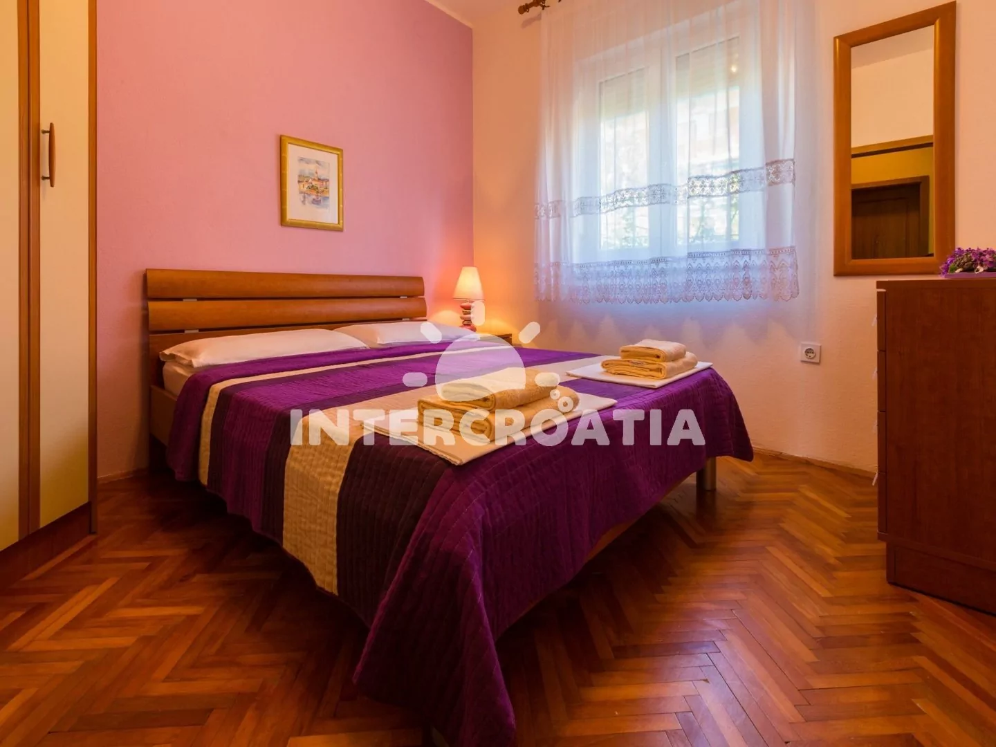 Velmi hezký apartmán (75 m2) s vlastní terasou (30 m2) a výhledem na moře je vhodný pro 6 až 7 osob. Obývací místnost je spojena s kuchyní. Kuchyňská linka je vybavena varnou deskou, digestoří, troubou, myčkou na nádobí, kávovarem, toustovačem, nádobím a lednicí s mrazákem. Obývací místnost s jídelním stolem pro 6 osob, klimatizací a vstupem na terasu. První ložnice s dvoulůžkem. Druhá ložnice s dvoulůžkem, jednou přistýlkou a vstupem na terasu. Třetí ložnice s dvoulůžkem a vstupem na terasu. Koupelna se sprchovým koutem, umyvadlem, fénem, bidetem a wc. Hostům je k dispozici parkování u objektu zdarma.