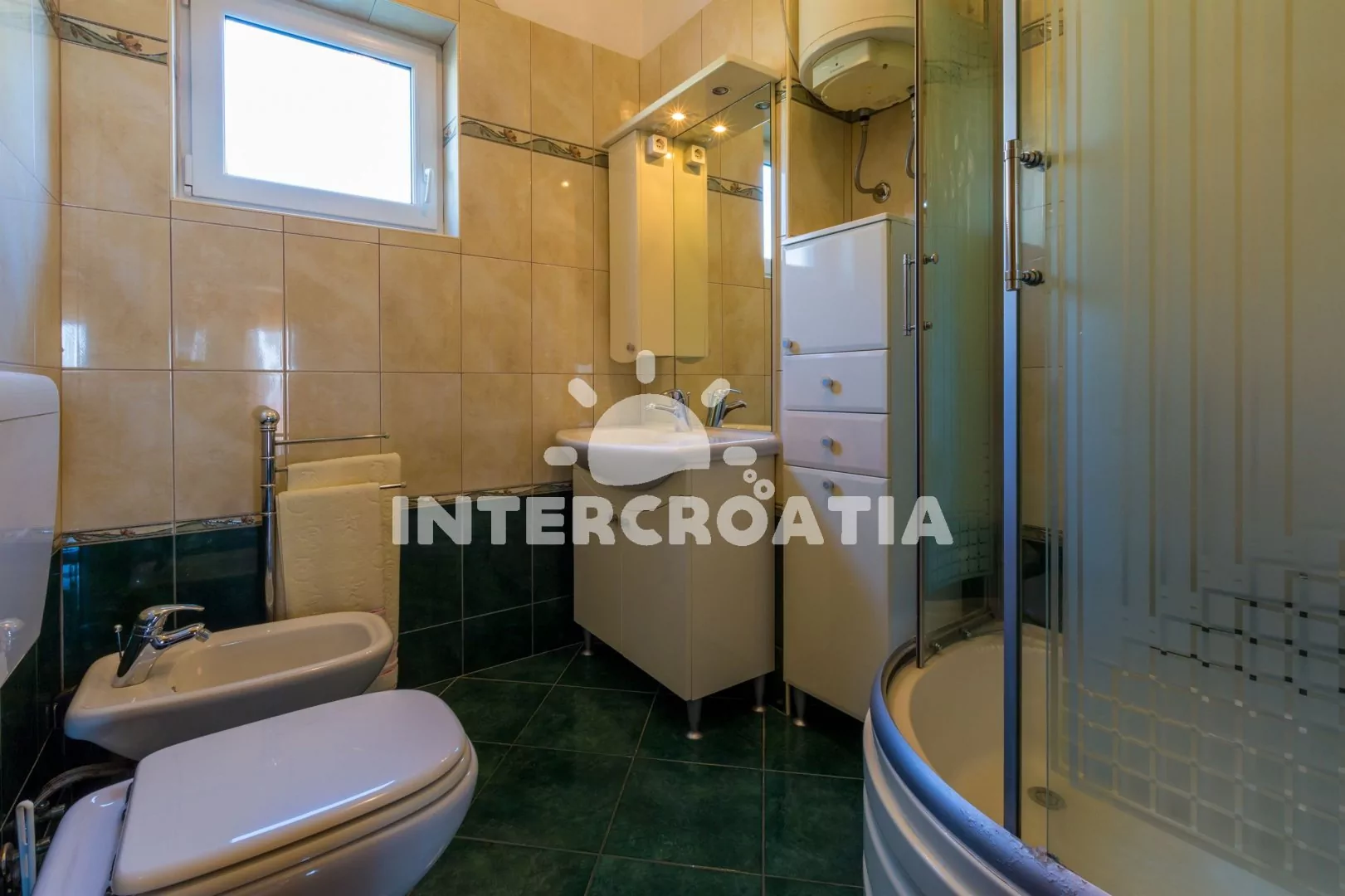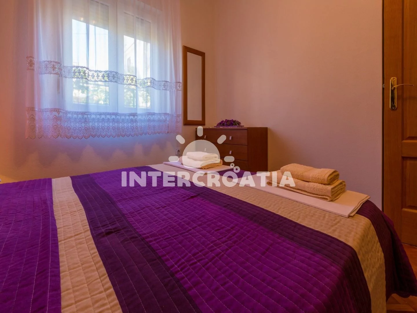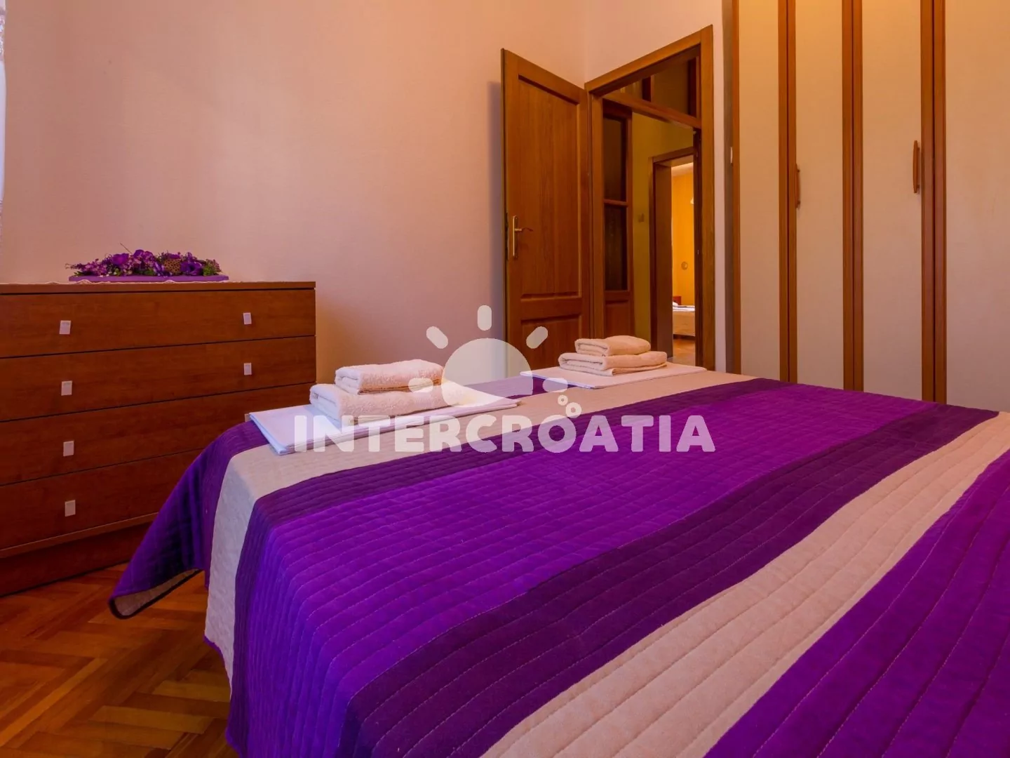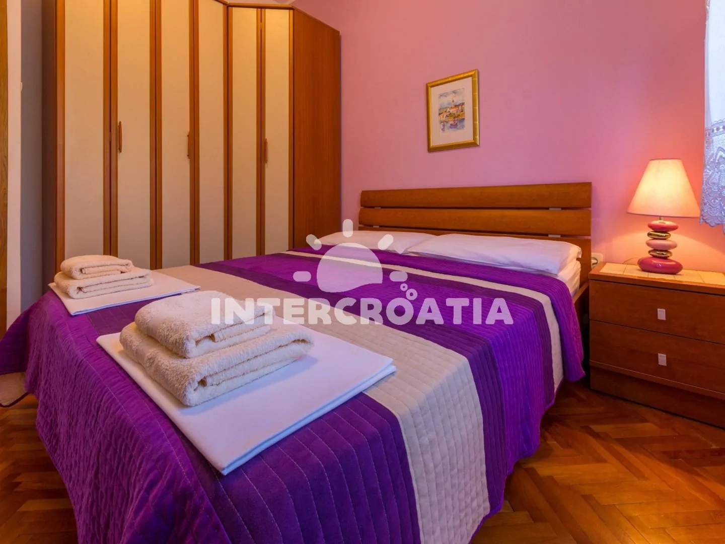 Velmi hezký apartmán (75 m2) s vlastní terasou (30 m2) a výhledem na moře je vhodný pro 6 až 7 osob. Obývací místnost je spojena s kuchyní. Kuchyňská linka je vybavena varnou deskou, digestoří, troubou, myčkou na nádobí, kávovarem, toustovačem, nádobím a lednicí s mrazákem. Obývací místnost s jídelním stolem pro 6 osob, klimatizací a vstupem na terasu. První ložnice s dvoulůžkem. Druhá ložnice s dvoulůžkem, jednou přistýlkou a vstupem na terasu. Třetí ložnice s dvoulůžkem a vstupem na terasu. Koupelna se sprchovým koutem, umyvadlem, fénem, bidetem a wc. Hostům je k dispozici parkování u objektu zdarma.
