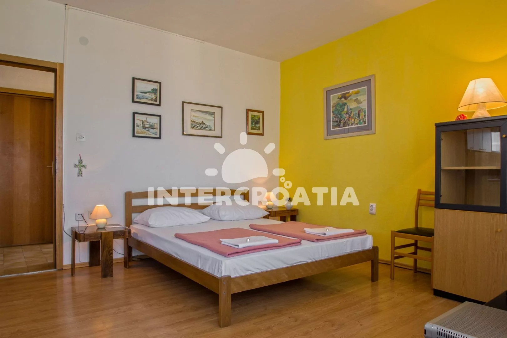 Apartmán (55 m2) s balkonem a výhledem na moře, se nachází v 2. patře domu a je vhodný pro 4 osoby. Obývací místnost je spojena s kuchyní. Kuchyňská linka je vybavena sporákem s troubou, digestoří, kávovarem, rychlovarnou konvicí, toustovačem, nádobím a lednicí s mrazákem. Obývací místnost s jídelním stolem pro 4 osoby, jedním dvoulůžkem, televizí se satelitním programem, klimatizací a vstupem na balkon. Ložnice s dvoulůžkem. Koupelna s vanou a umyvadlem. Dále samostatné wc s umyvadlem. Hostům je k dispozici parkování u objektu zdarma.