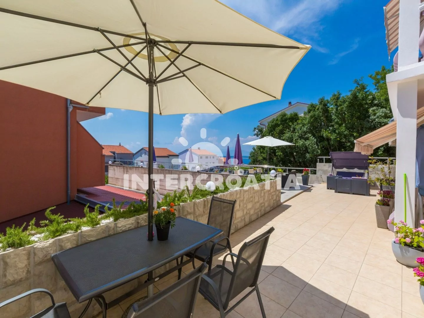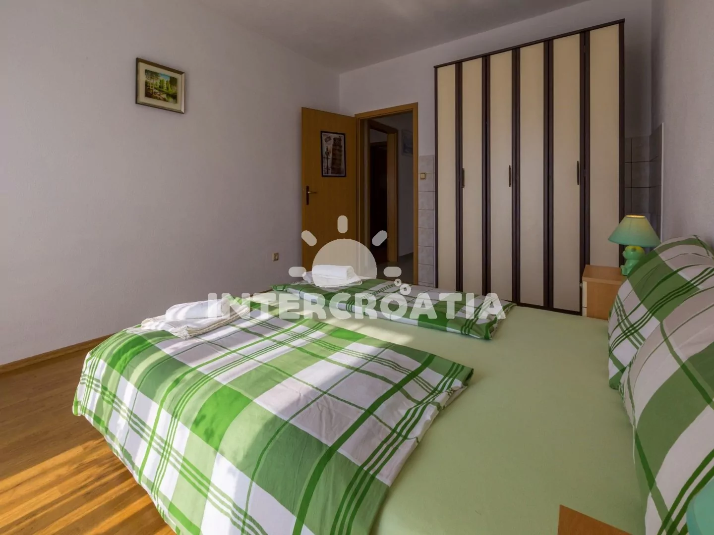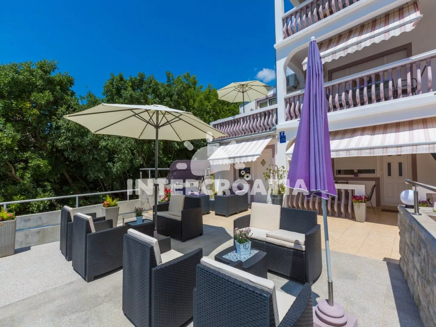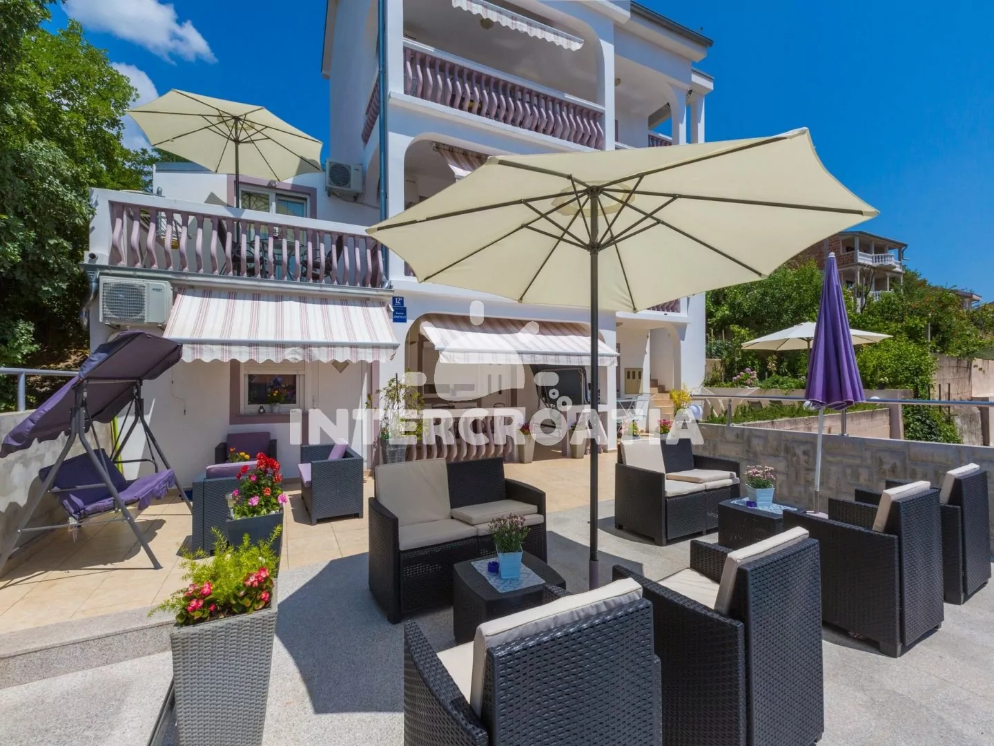 Apartmán (110 m2) s terasou a výhledem na moře se nachází v 2. patře vily a je vhodný pro 5 osob. Obývací pokoj je spojený s kuchyní. Kuchyňská linka je vybavena varnou deskou, rychlovarnou konvicí, mikrovlnnou troubou, kávovarem, toustovačem, nádobím a lednicí s mrazákem. Obývací pokoj se sedací soupravou s pohovkou, televizí se satelitním programem, radiem, klimatizací a vstupem na terasu. První a druhá ložnice je vybavena vždy s jedním dvoulůžkem. Třetí ložnice s jedním jednolůžkem. Dvě koupelny se sprchovým koutem, umyvadlem a wc. Hostům je k dispozici parkování u objektu zdarma.