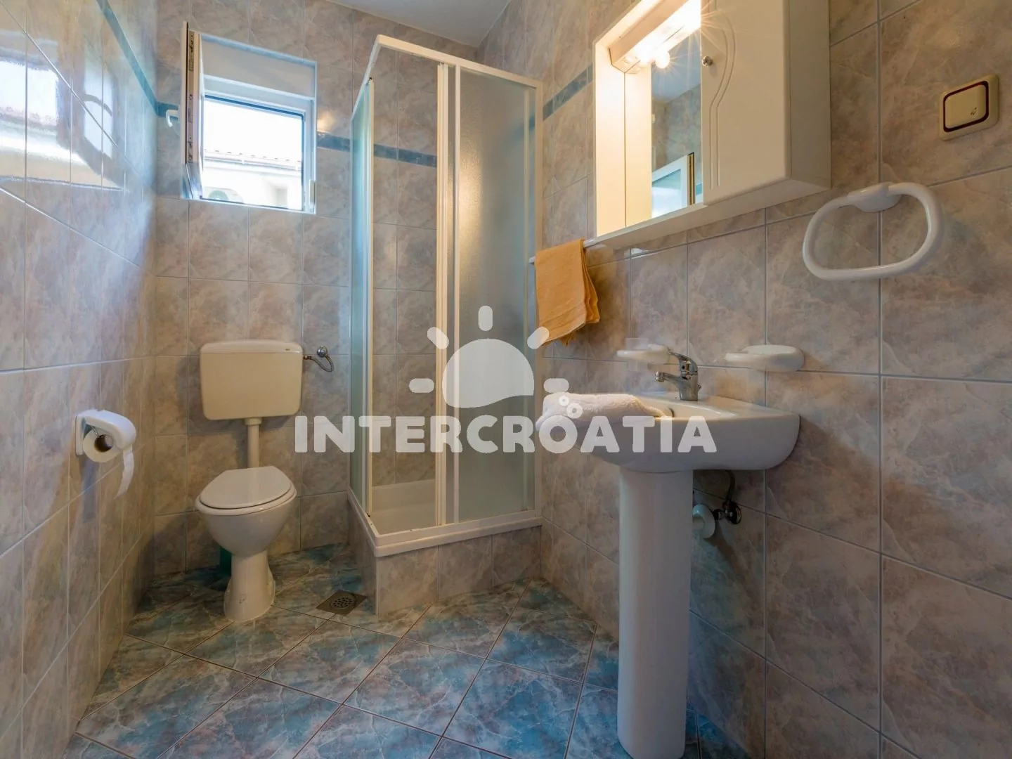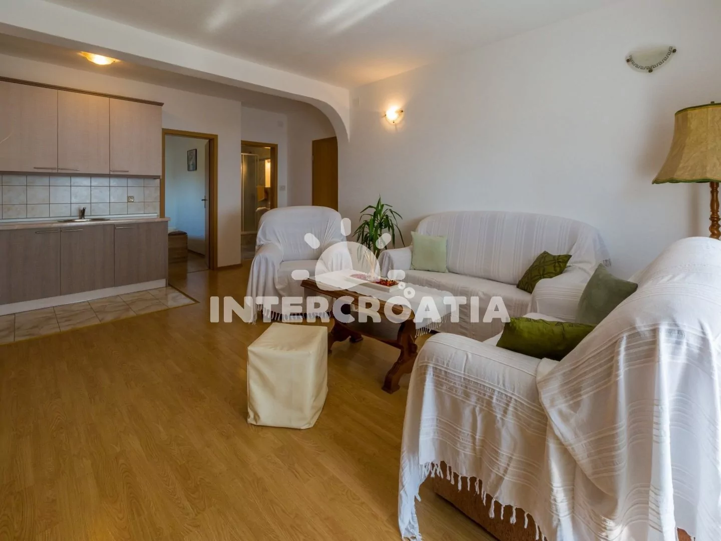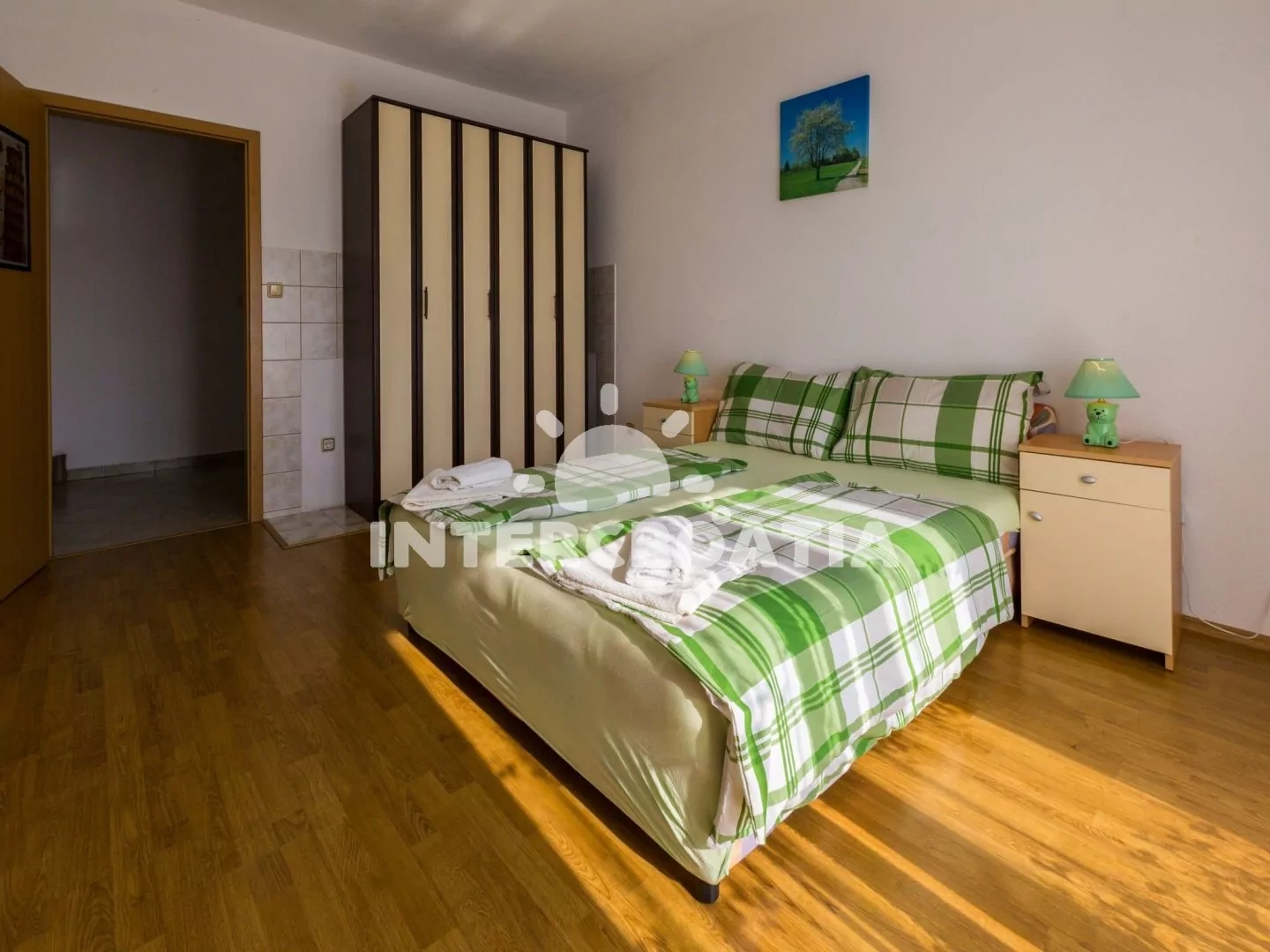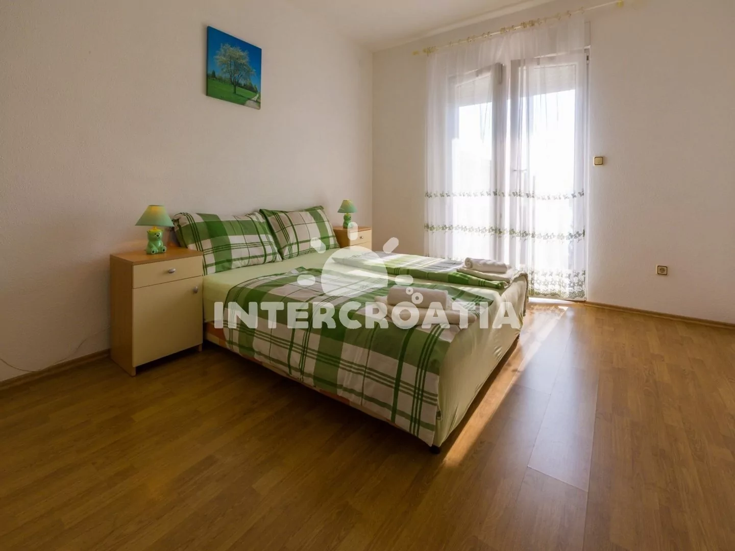 Apartmán (110 m2) s terasou a výhledem na moře se nachází v 2. patře vily a je vhodný pro 5 osob. Obývací pokoj je spojený s kuchyní. Kuchyňská linka je vybavena varnou deskou, rychlovarnou konvicí, mikrovlnnou troubou, kávovarem, toustovačem, nádobím a lednicí s mrazákem. Obývací pokoj se sedací soupravou s pohovkou, televizí se satelitním programem, radiem, klimatizací a vstupem na terasu. První a druhá ložnice je vybavena vždy s jedním dvoulůžkem. Třetí ložnice s jedním jednolůžkem. Dvě koupelny se sprchovým koutem, umyvadlem a wc. Hostům je k dispozici parkování u objektu zdarma.