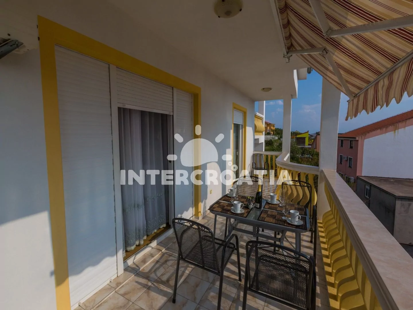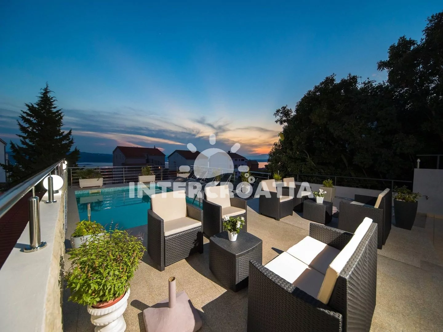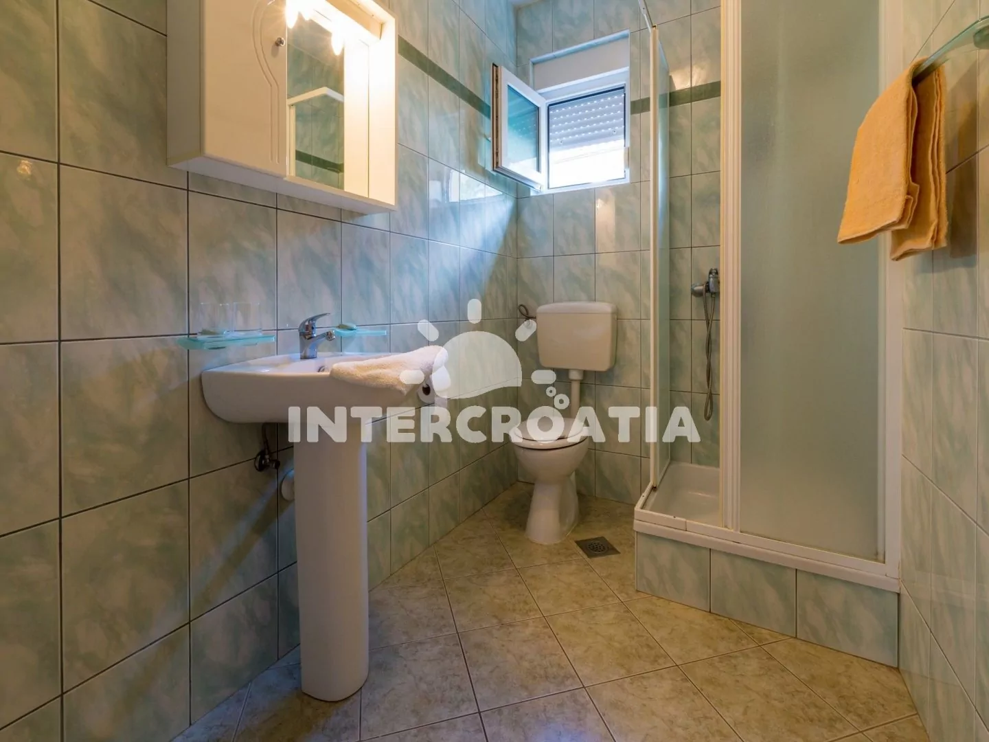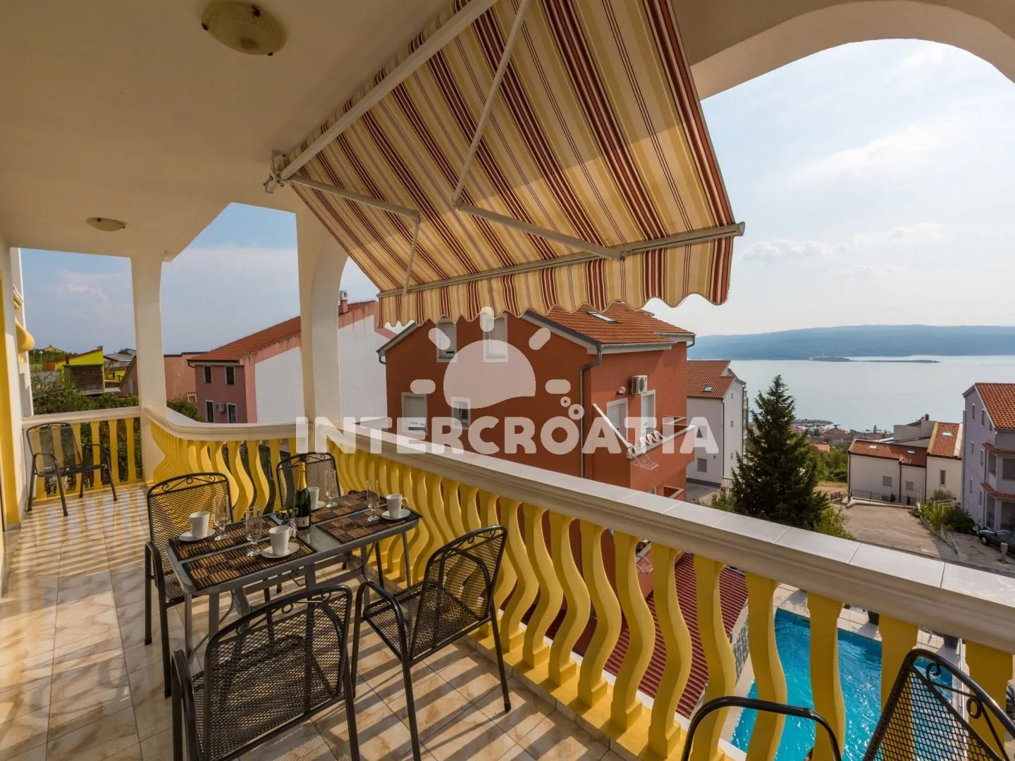 Apartmán (110 m2) s terasou a výhledem na moře se nachází v 2. patře vily a je vhodný pro 5 osob. Obývací pokoj je spojený s kuchyní. Kuchyňská linka je vybavena varnou deskou, rychlovarnou konvicí, mikrovlnnou troubou, kávovarem, toustovačem, nádobím a lednicí s mrazákem. Obývací pokoj se sedací soupravou s pohovkou, televizí se satelitním programem, radiem, klimatizací a vstupem na terasu. První a druhá ložnice je vybavena vždy s jedním dvoulůžkem. Třetí ložnice s jedním jednolůžkem. Dvě koupelny se sprchovým koutem, umyvadlem a wc. Hostům je k dispozici parkování u objektu zdarma.